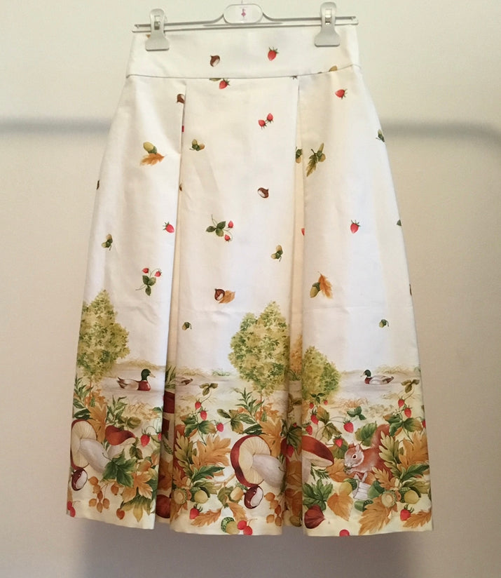 Lunga con pieghe sul davanti, in tessuto di cotone pesante colore fondo bianco con delicati disegni sul fondo che rendono la gonna un capo molto originale