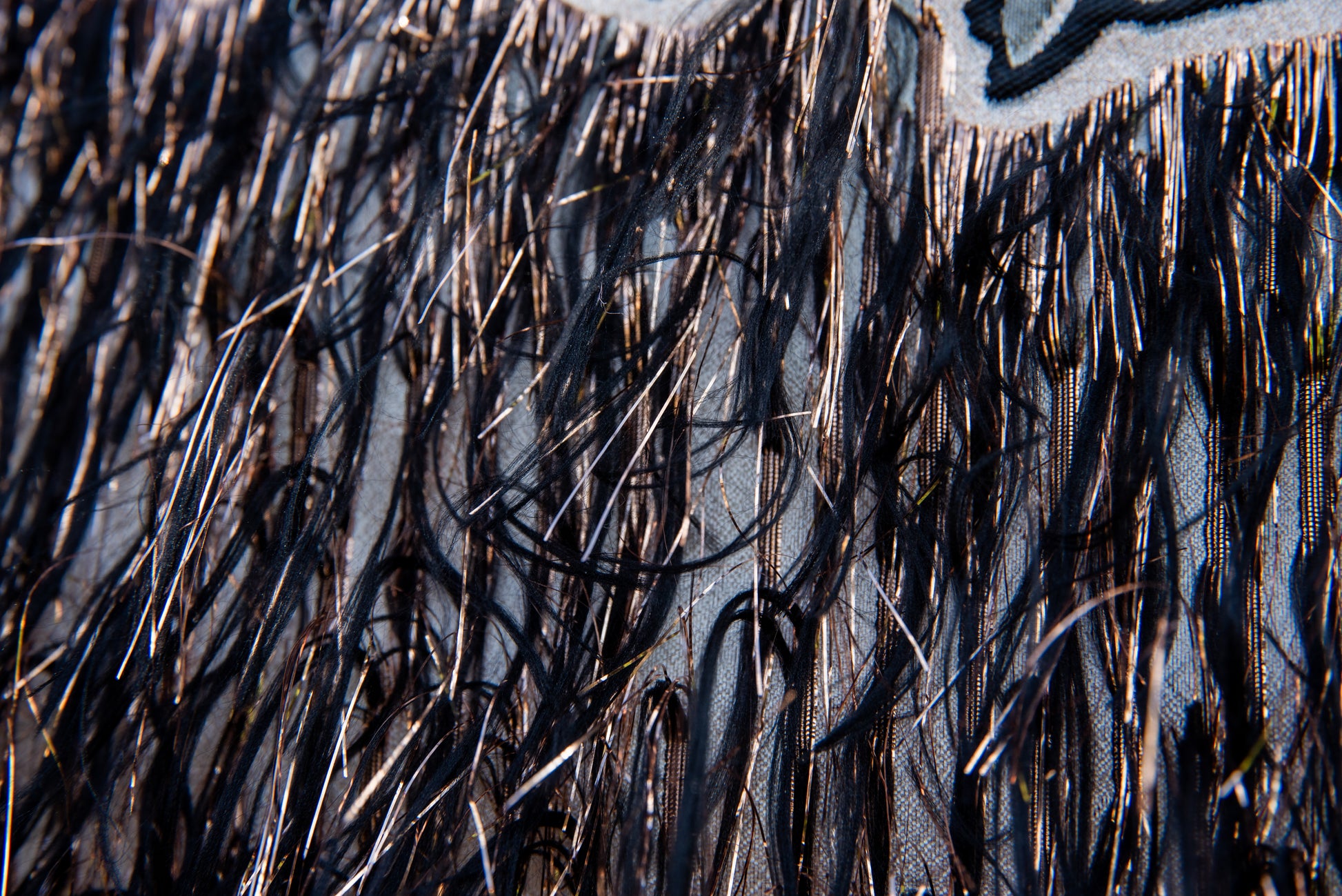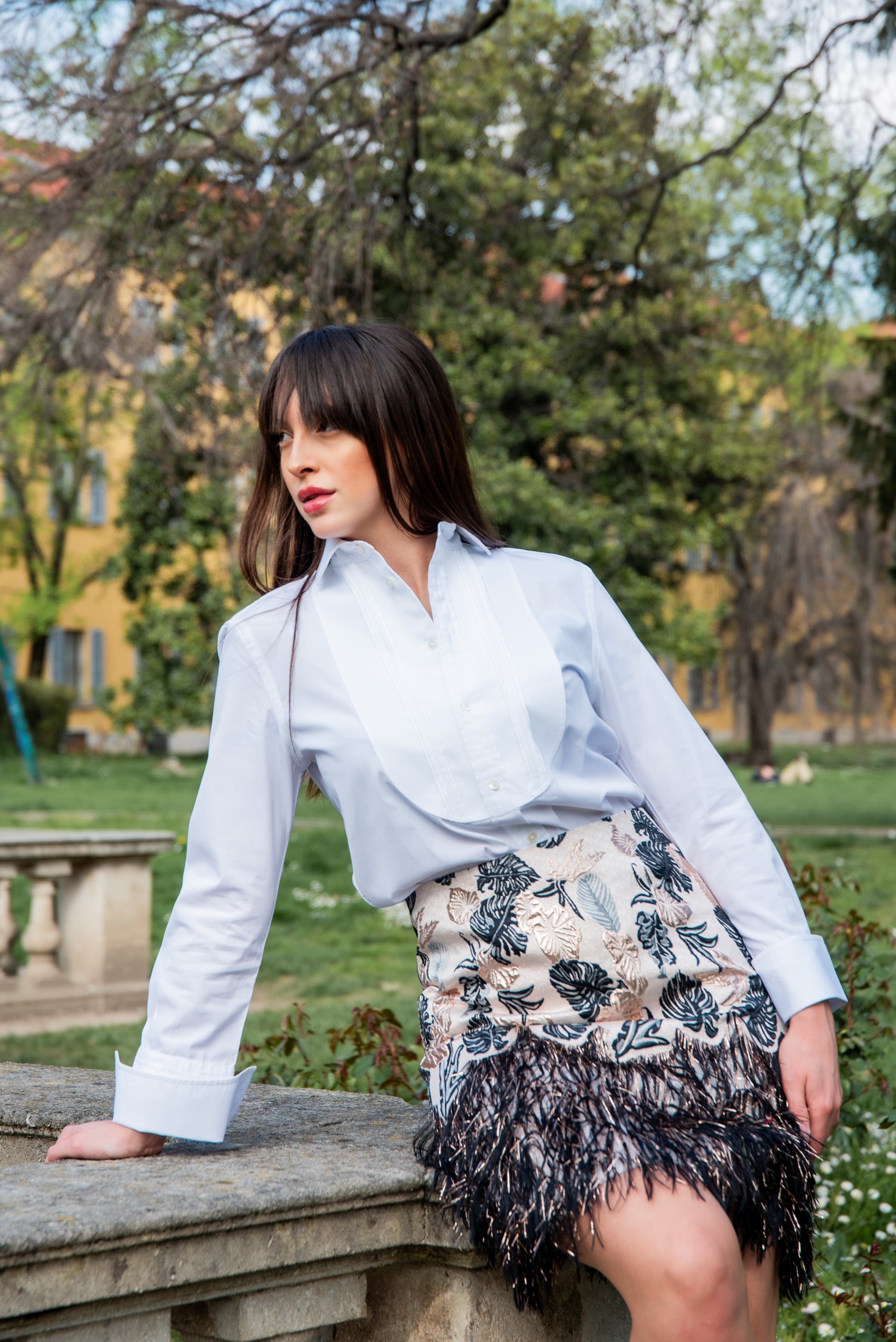 Gonna corta in broccato e piume sul fondo color oro e con foglie marroni