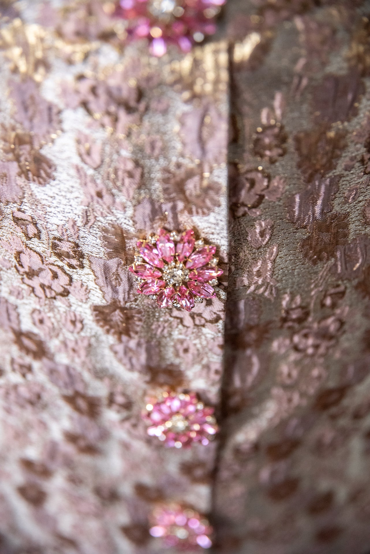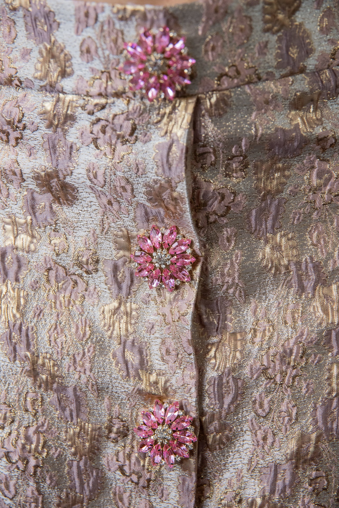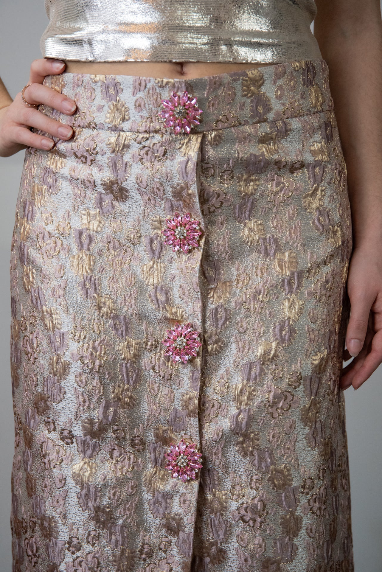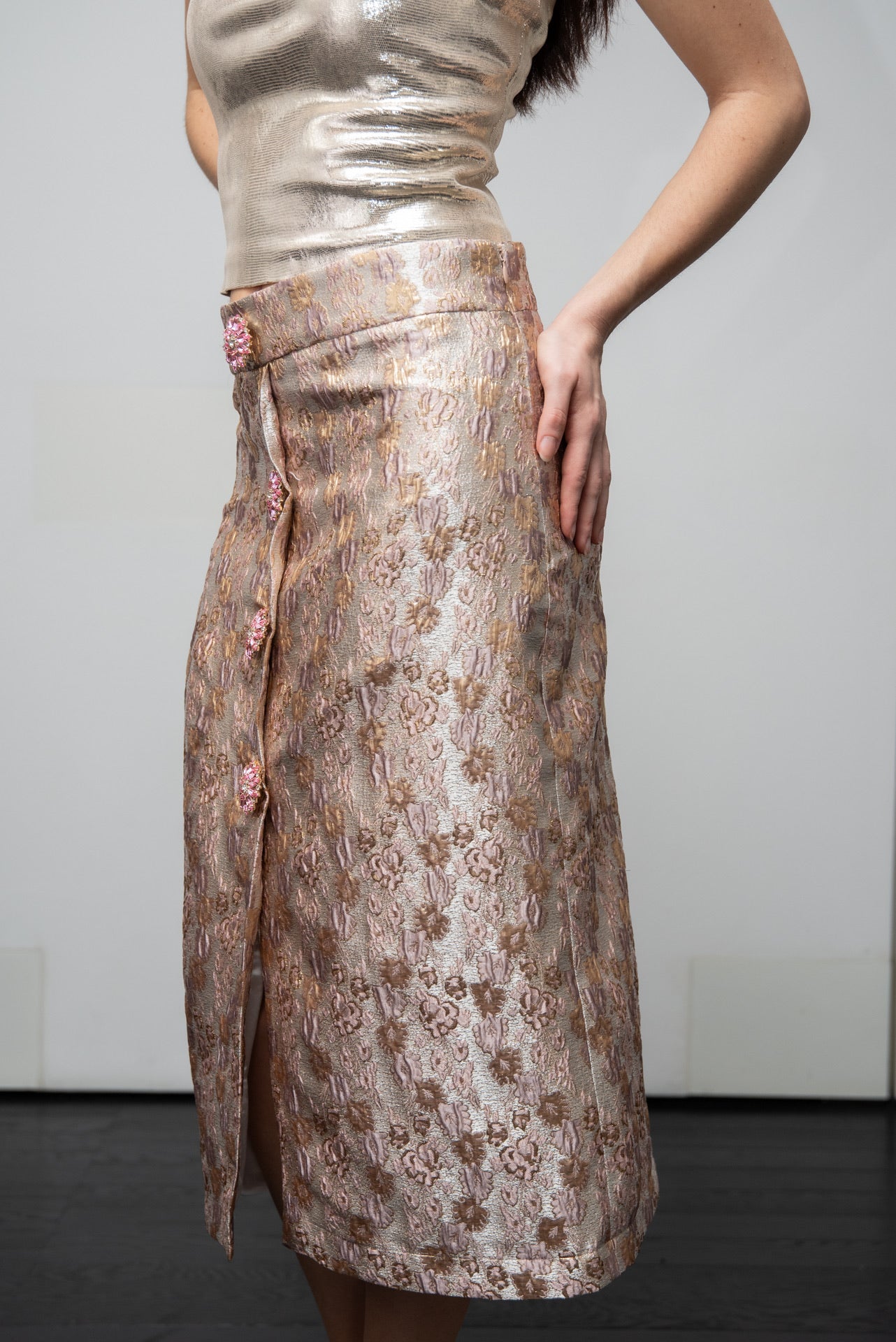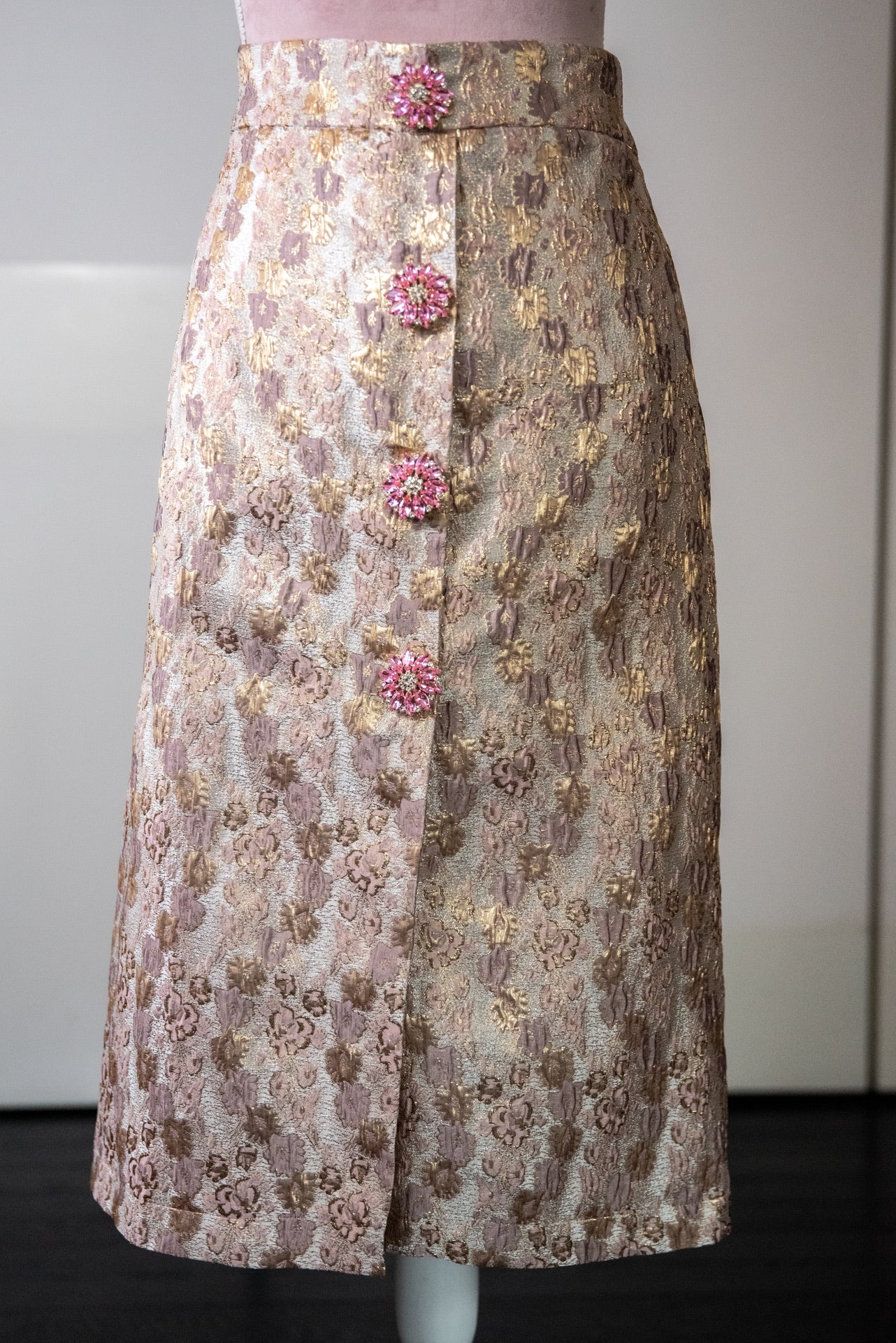 Gonna Giorgina Midi’ a matita in broccato rosa antico e roe con bottoni gioiello