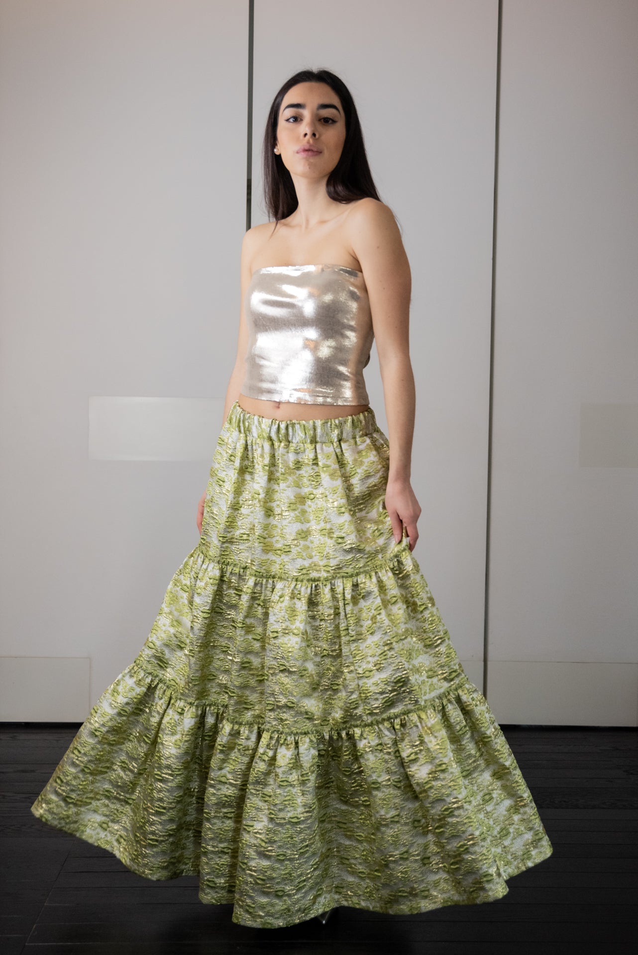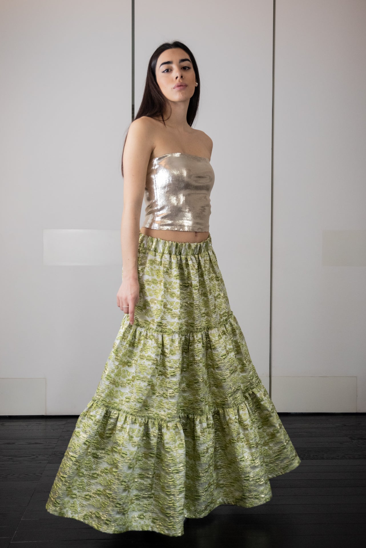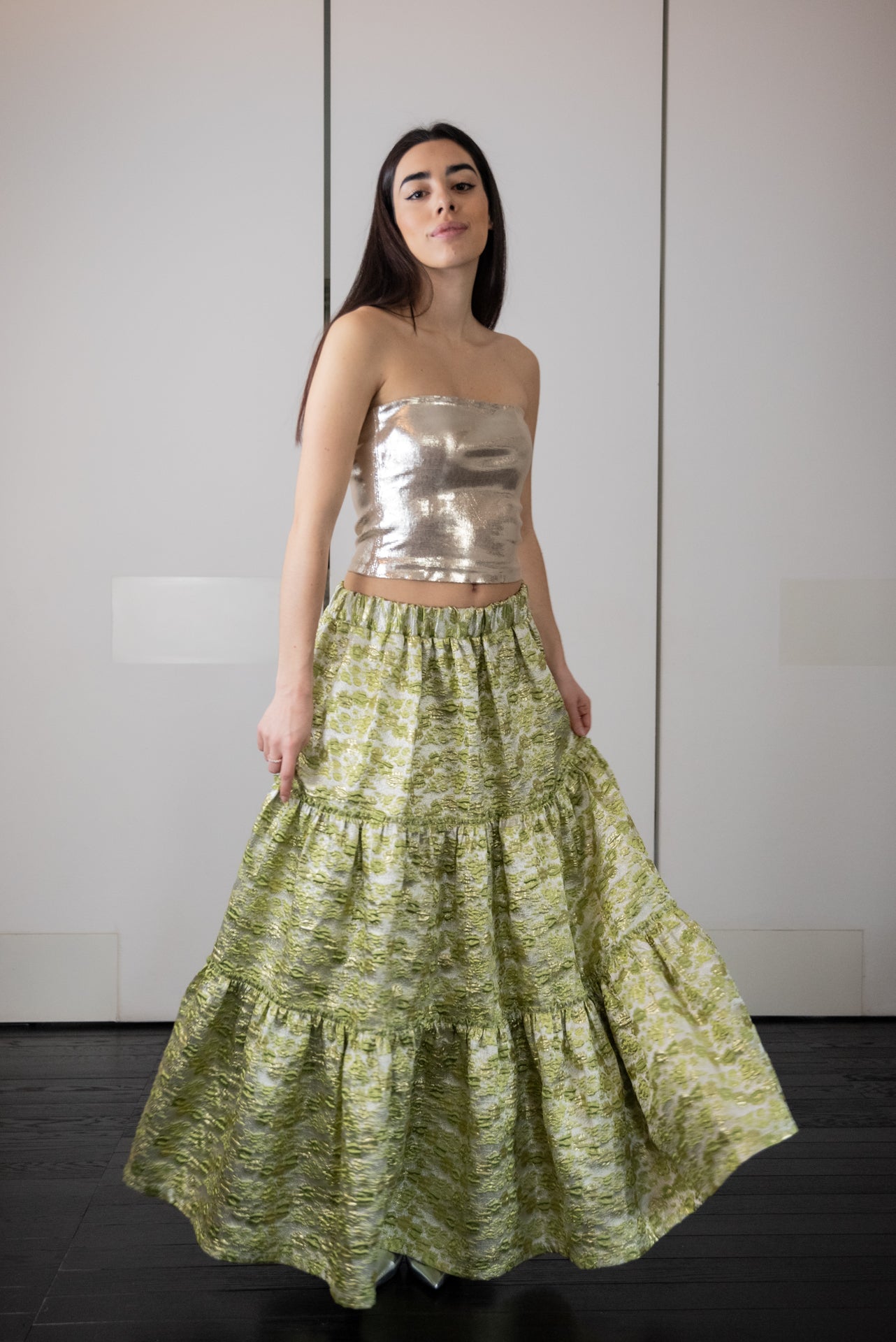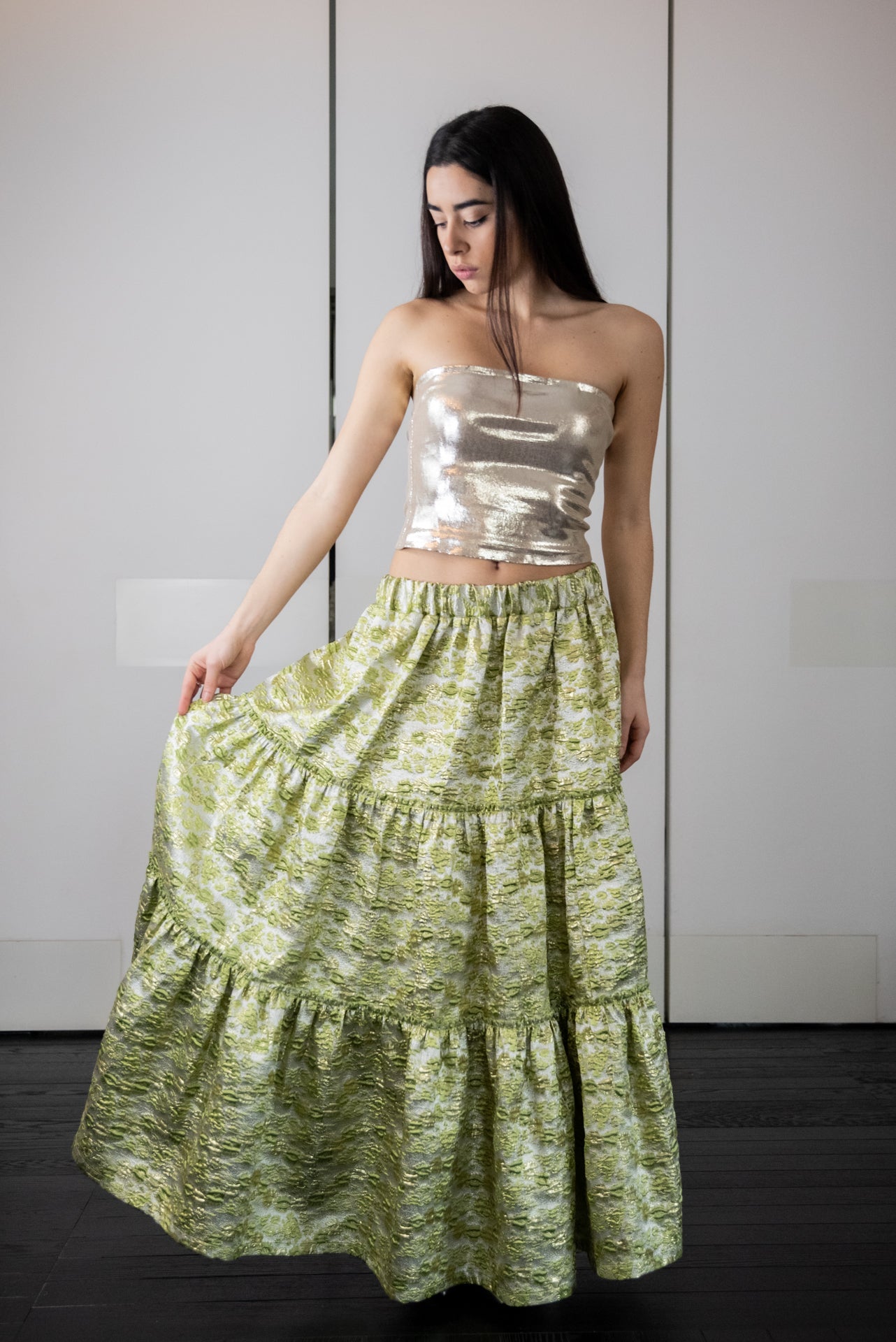 la Maxi Gonna Franci si abbina facilmente a bluse in seta o camicie bianche, creando un outfit impeccabile per occasioni speciali. Le sue balze donano movimento e leggerezza, mentre il broccato di colore salvia aggiunge un tocco di classe e originalità.