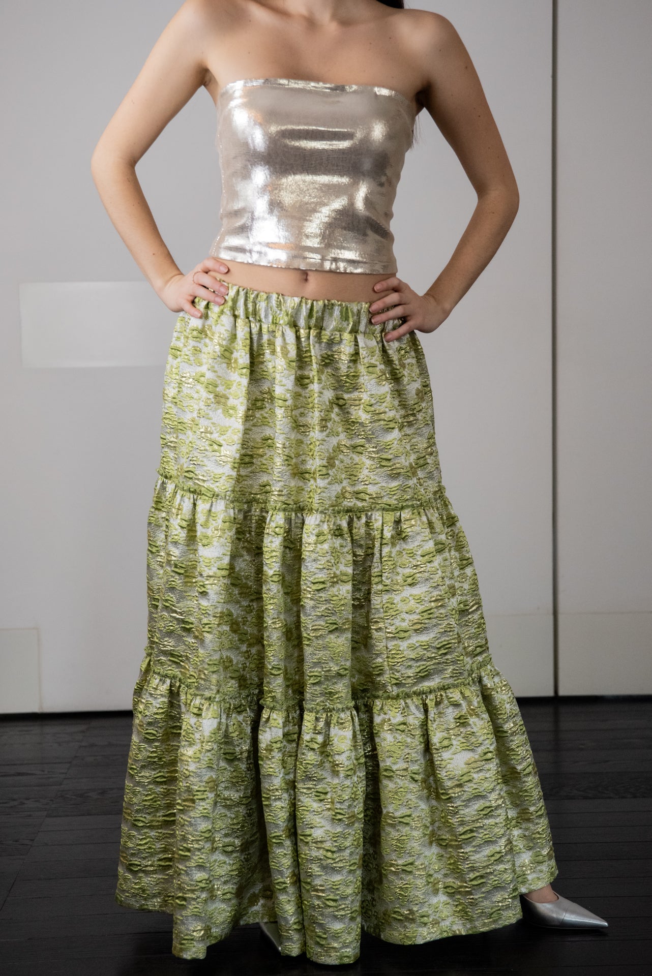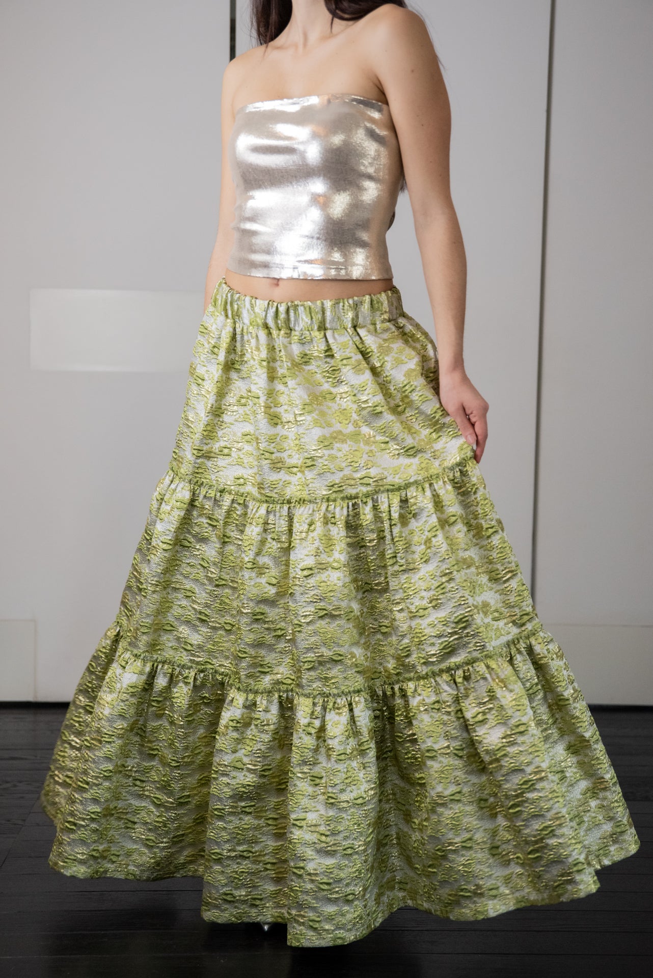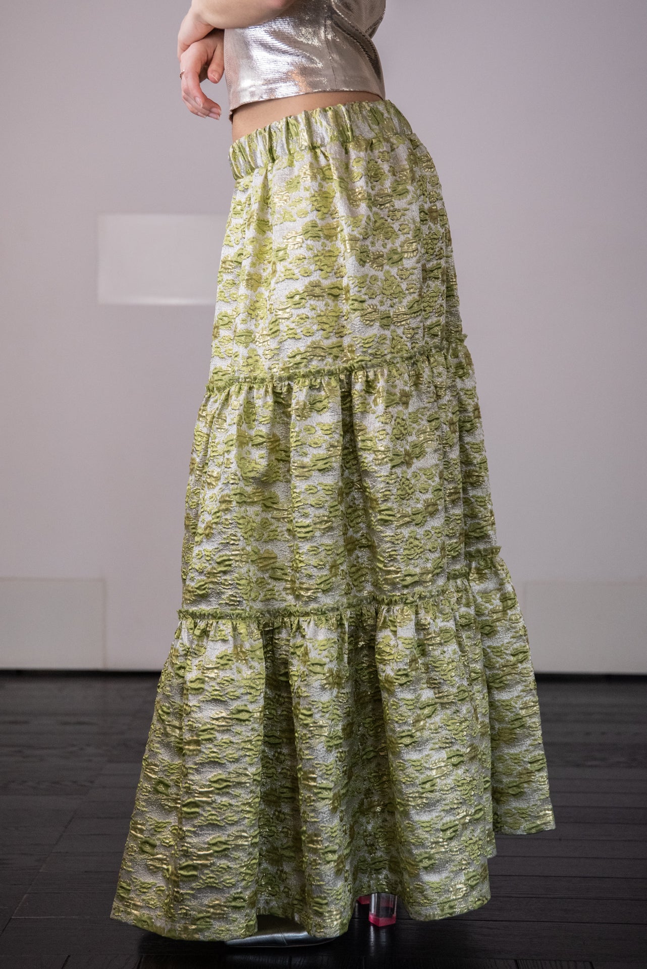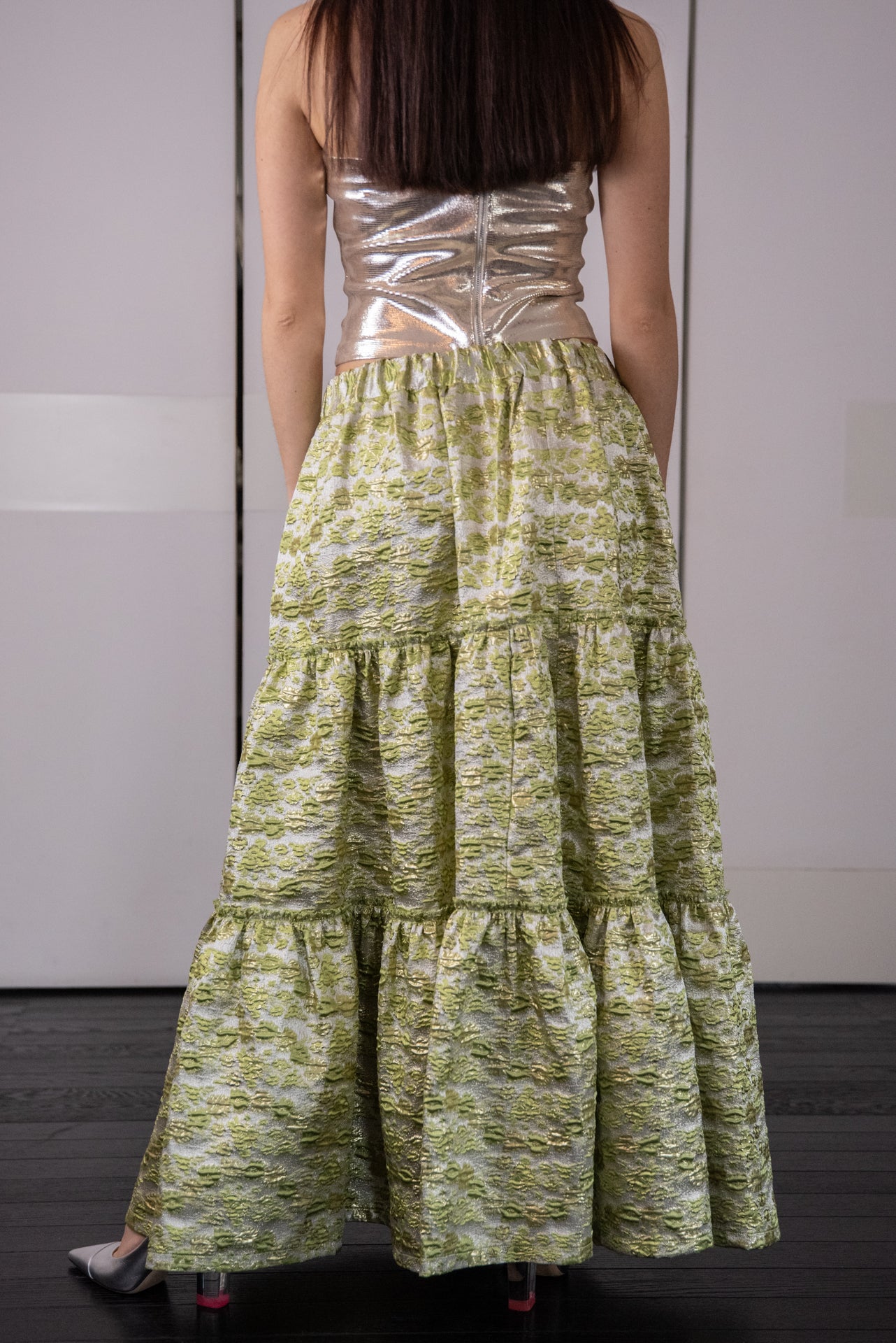 la Maxi Gonna Franci si abbina facilmente a bluse in seta o camicie bianche, creando un outfit impeccabile per occasioni speciali. Le sue balze donano movimento e leggerezza, mentre il broccato di colore salvia aggiunge un tocco di classe e originalità.