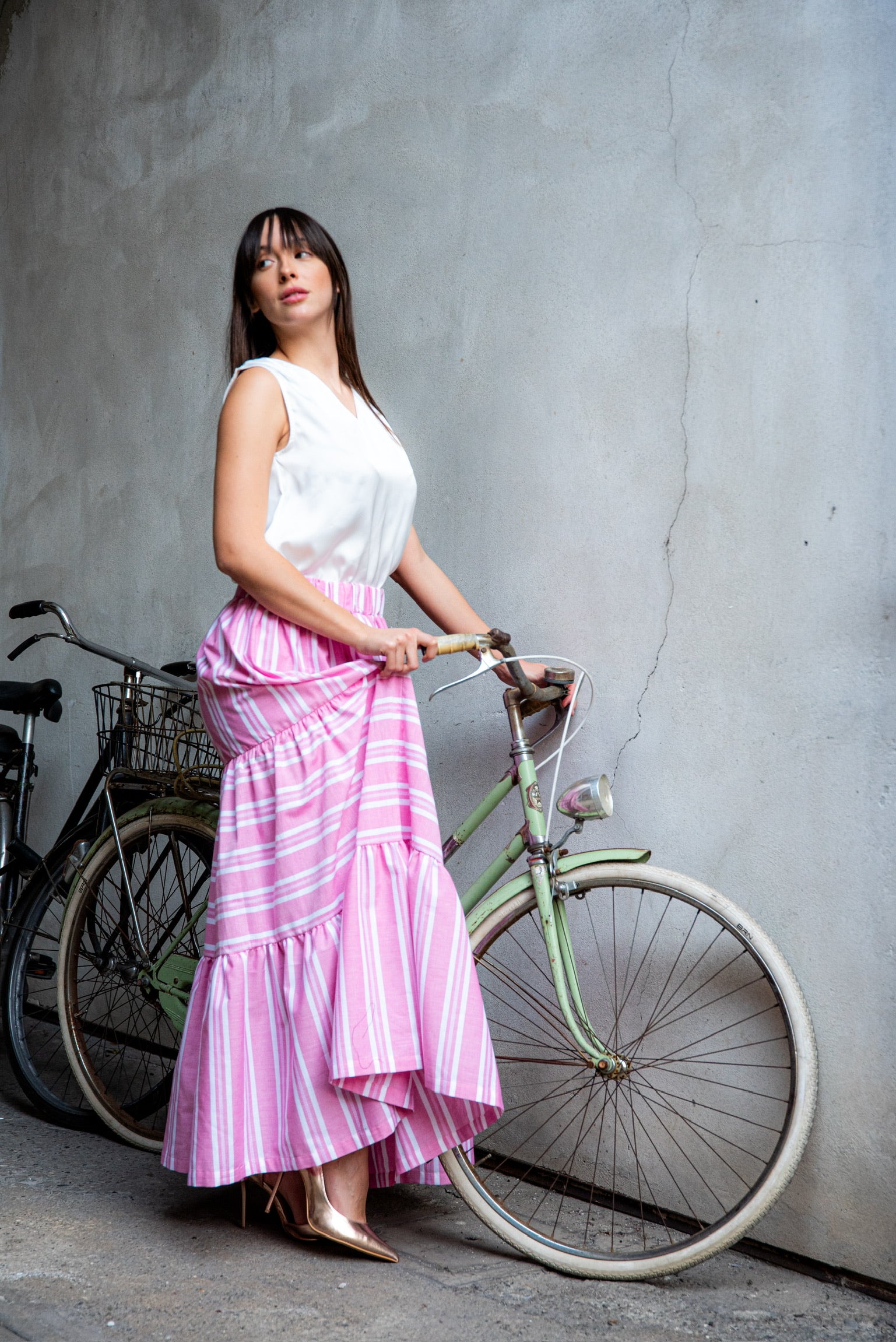 Gonna modello Franci in cotone con elastico in vita a tre balze e con motivo rigato.