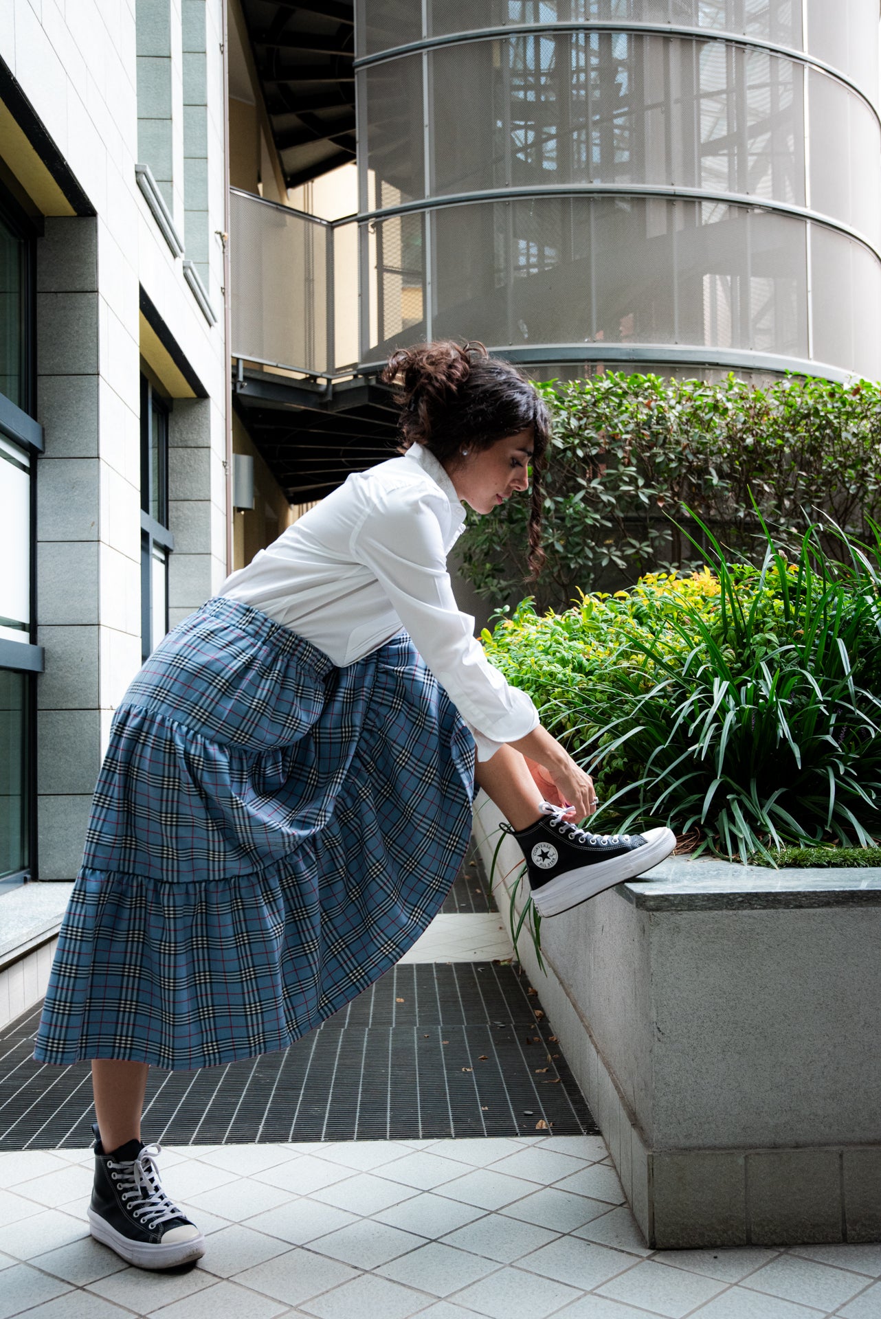 Gonna Midi’ modello Franci a tre balze con elastico in vita e in morbido tessuto scozzese.