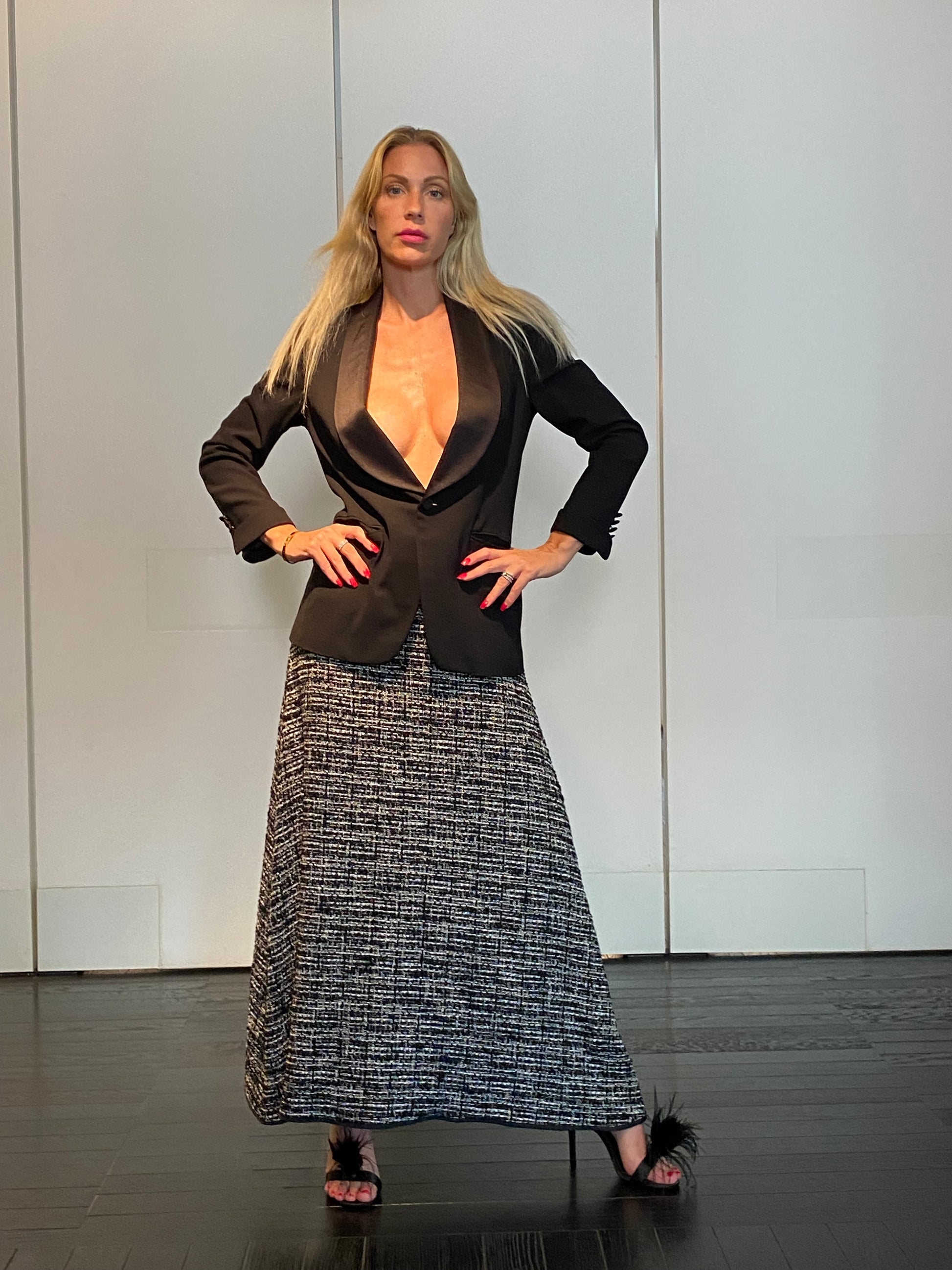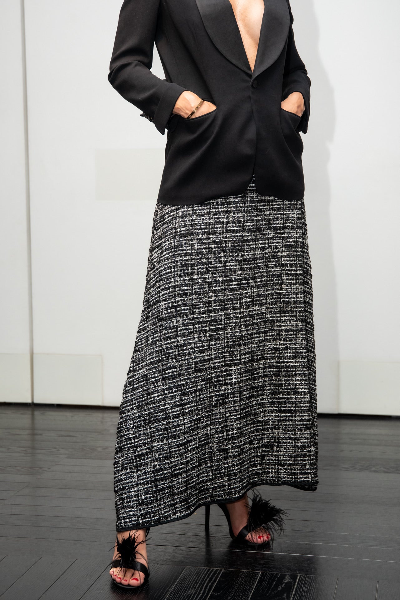 Maxi Gonna lunga a trapezio in morbido tweed nero e bianco stupenda per una serata elegante con un top o una camicia in seta.