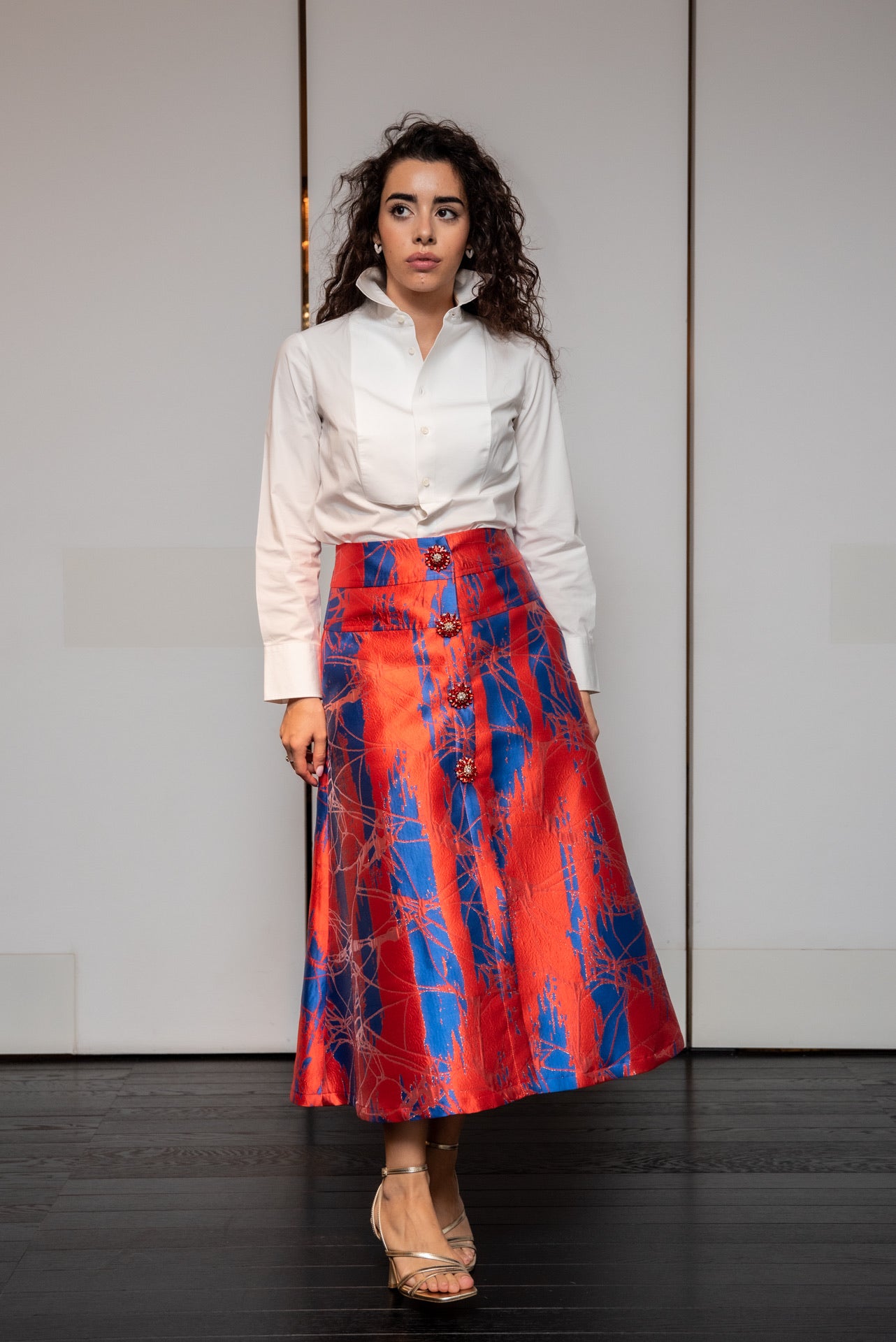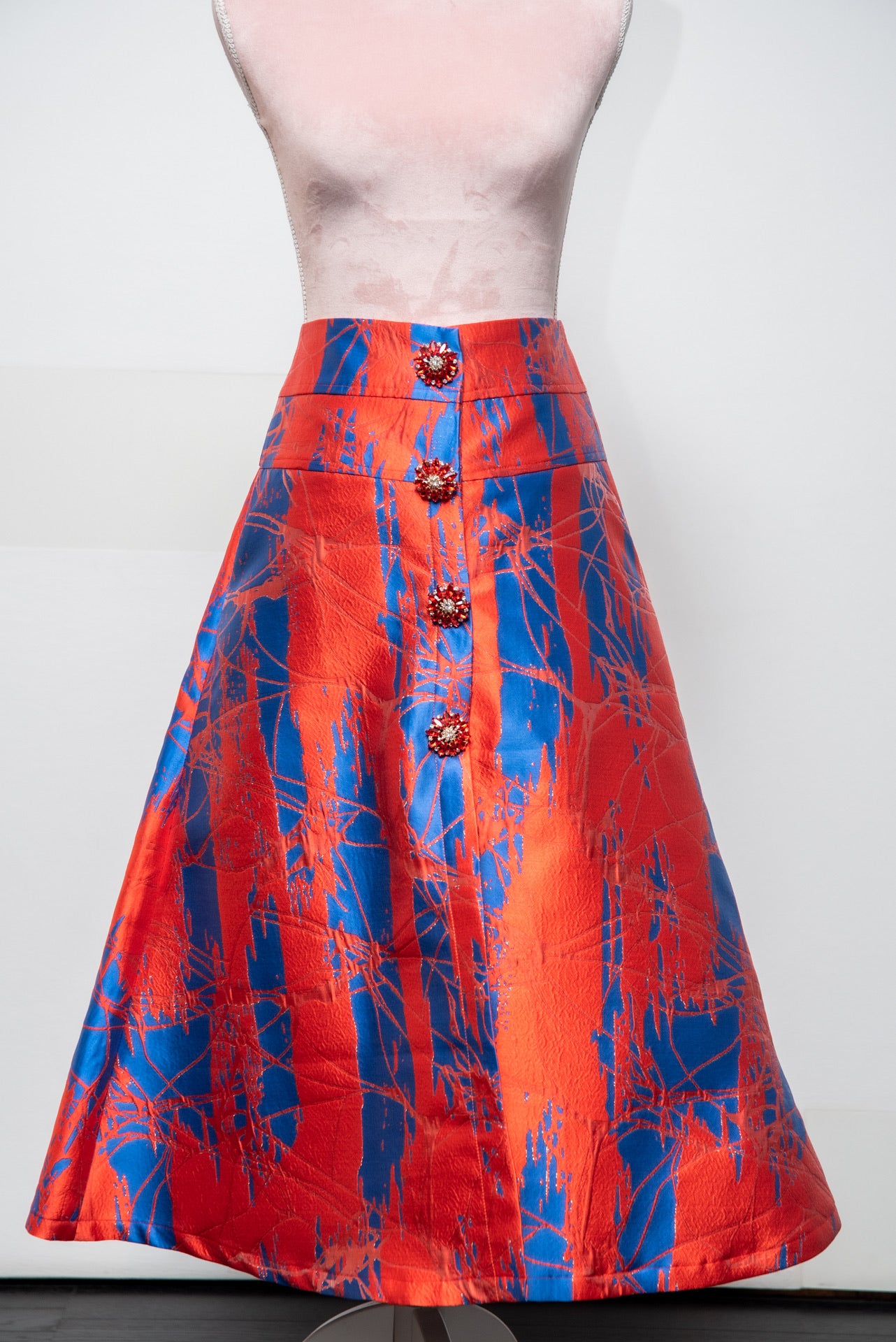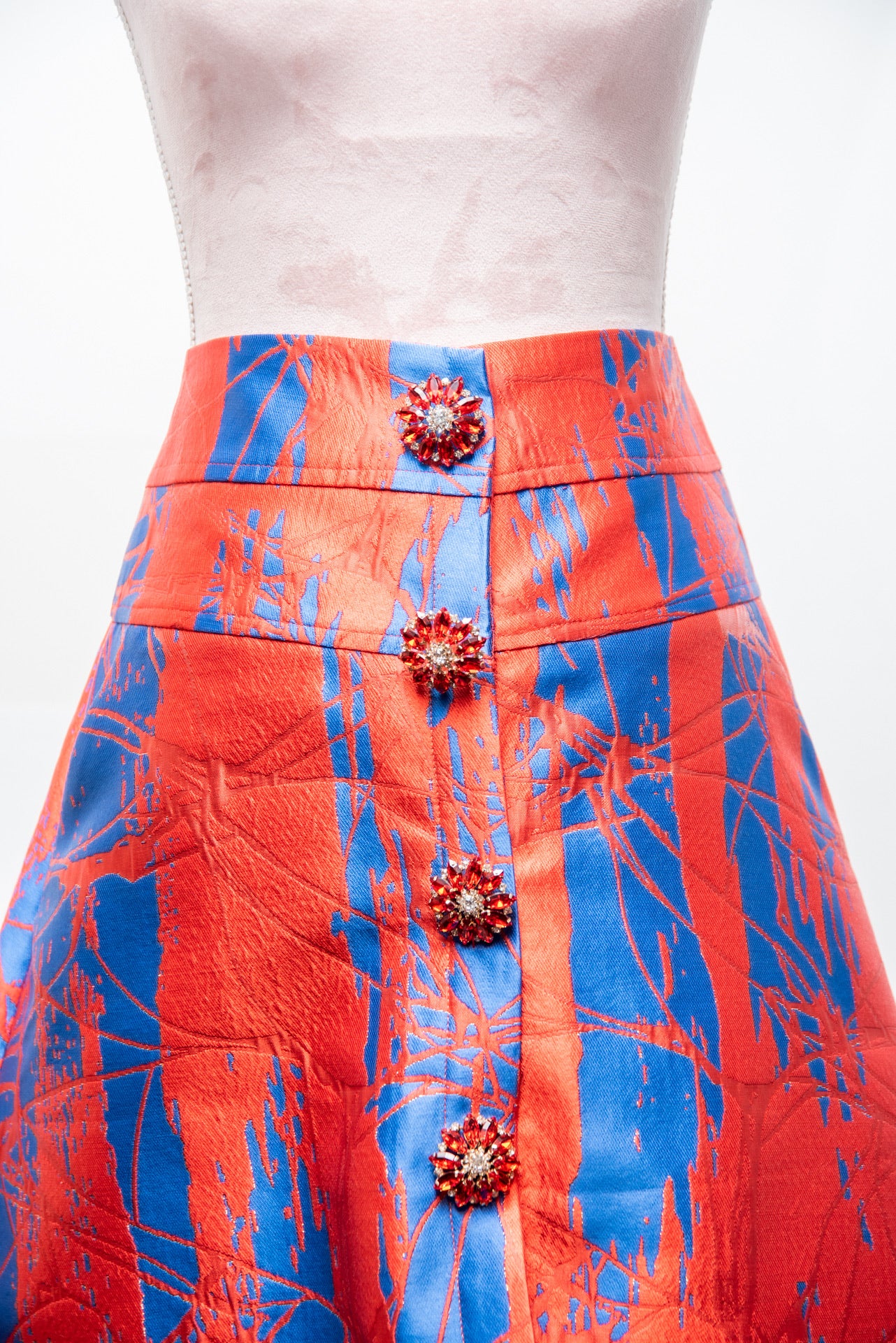 Gonna Letizia Lunga ad A in broccato rosso e bluette con bottoni gioiello