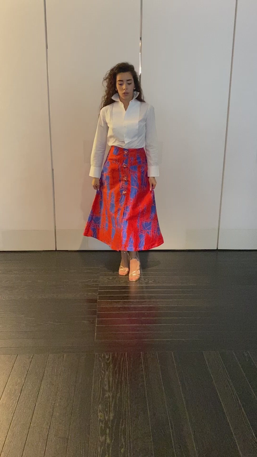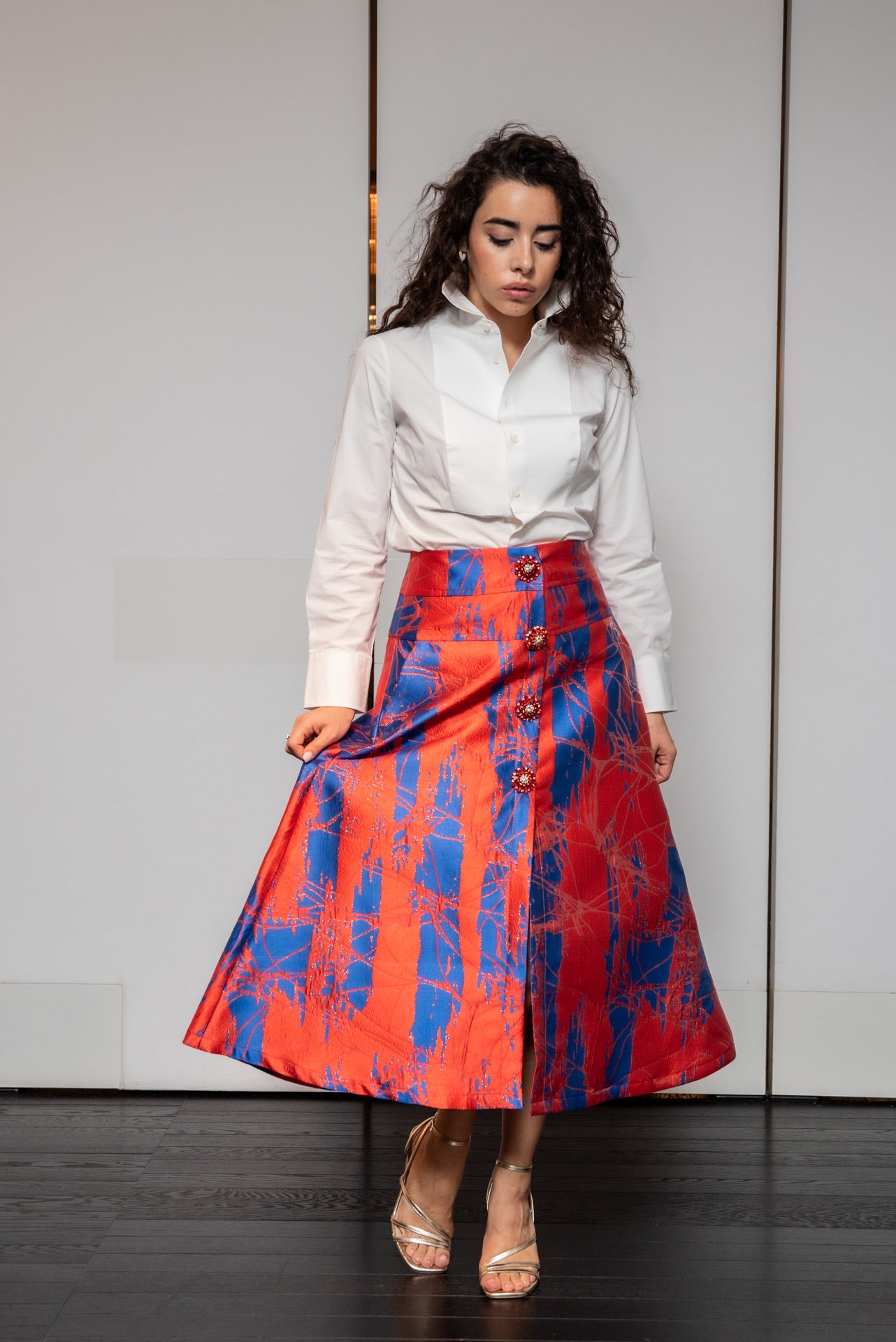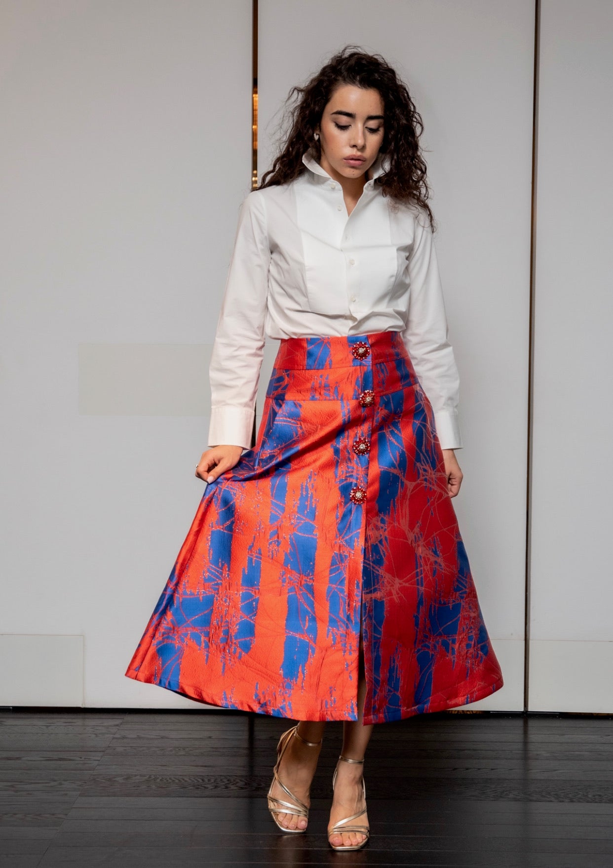 Gonna Letizia Lunga ad A in broccato rosso e bluette con bottoni gioiello