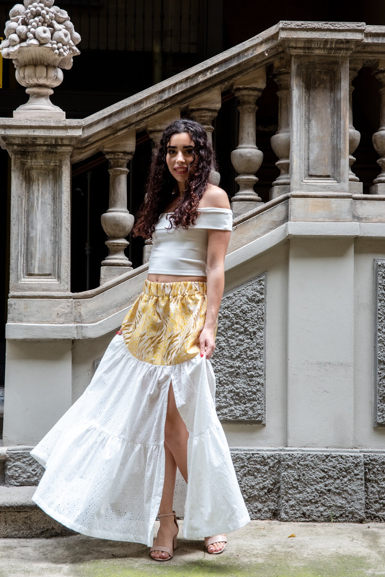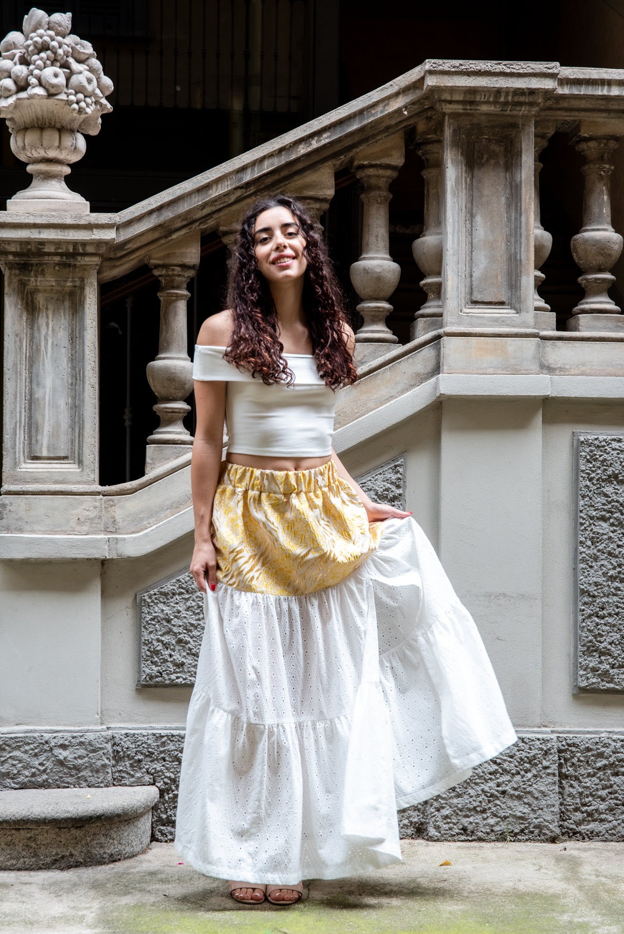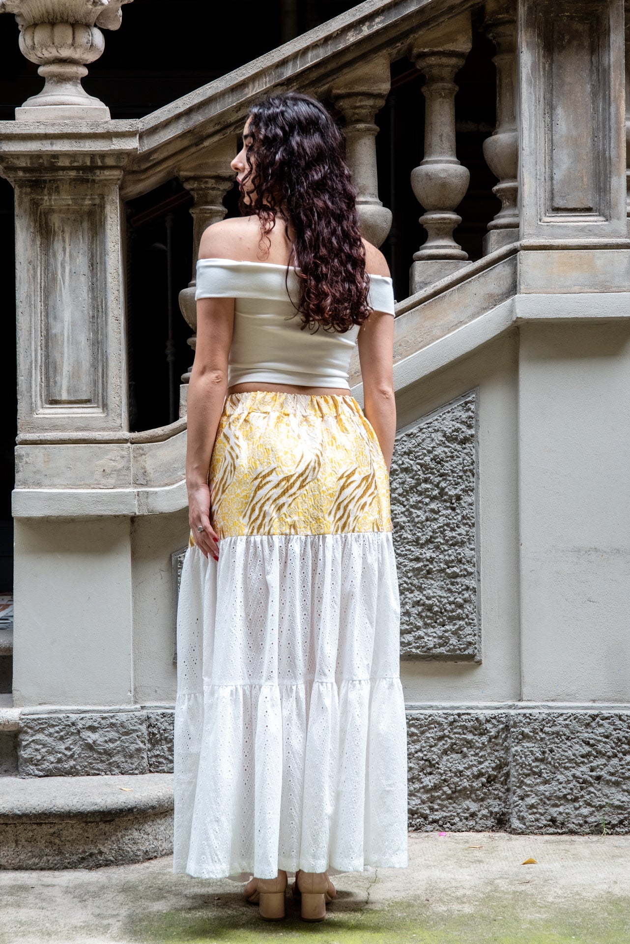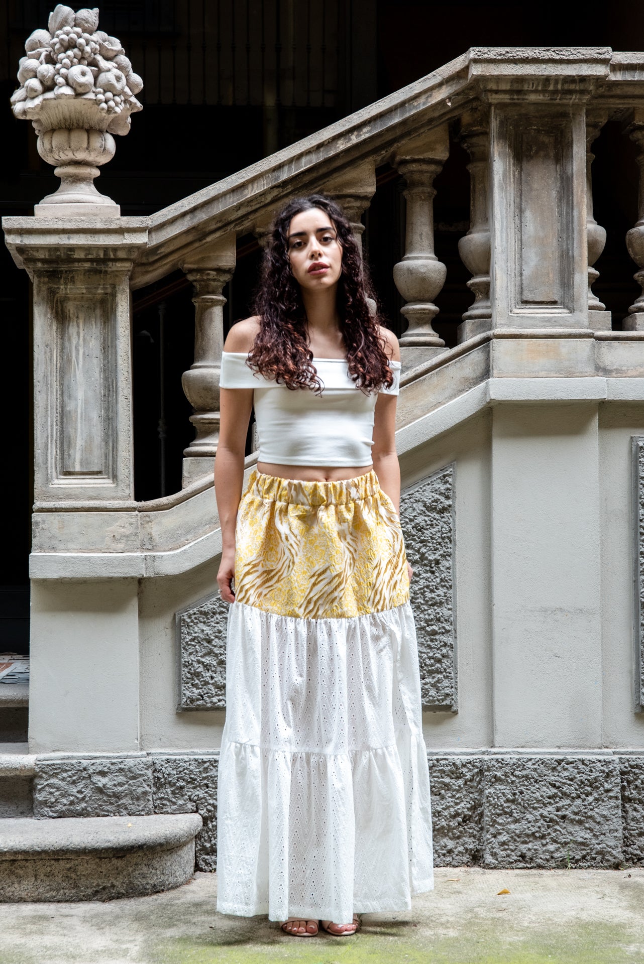 Gonna modello Franci con elastico in vita a tre balze in cotone sangallo ricamato e tessuto broccato