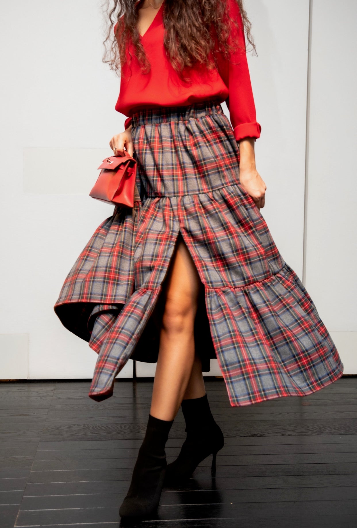 Gonna Midi’ modello Franci a tre balze con elastico in vita e con profondo spacco in morbido tessuto scozzese.