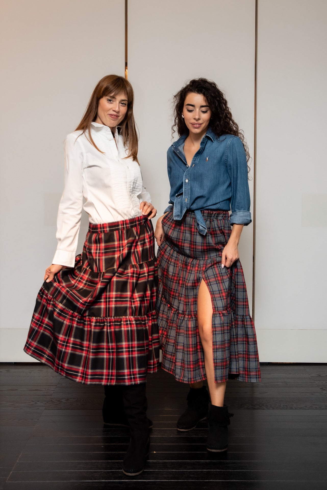 Gonna modello Franci a tre balze con elastico in vita e con profondo spacco in morbido tessuto scozzese lunghezza media