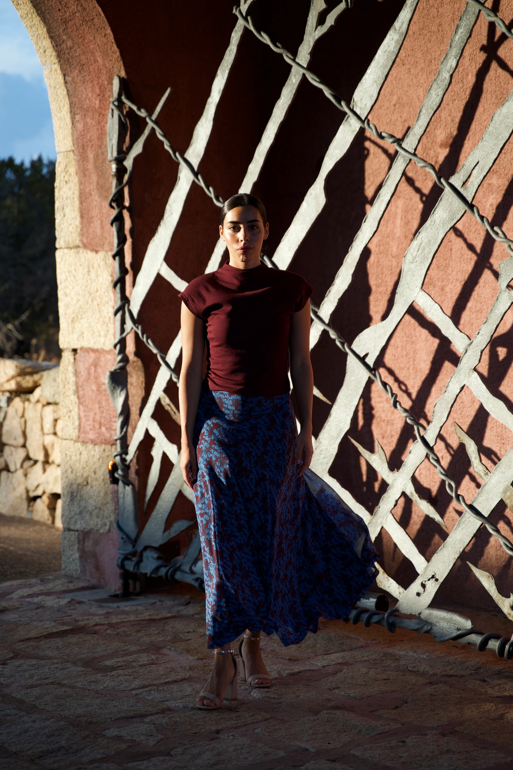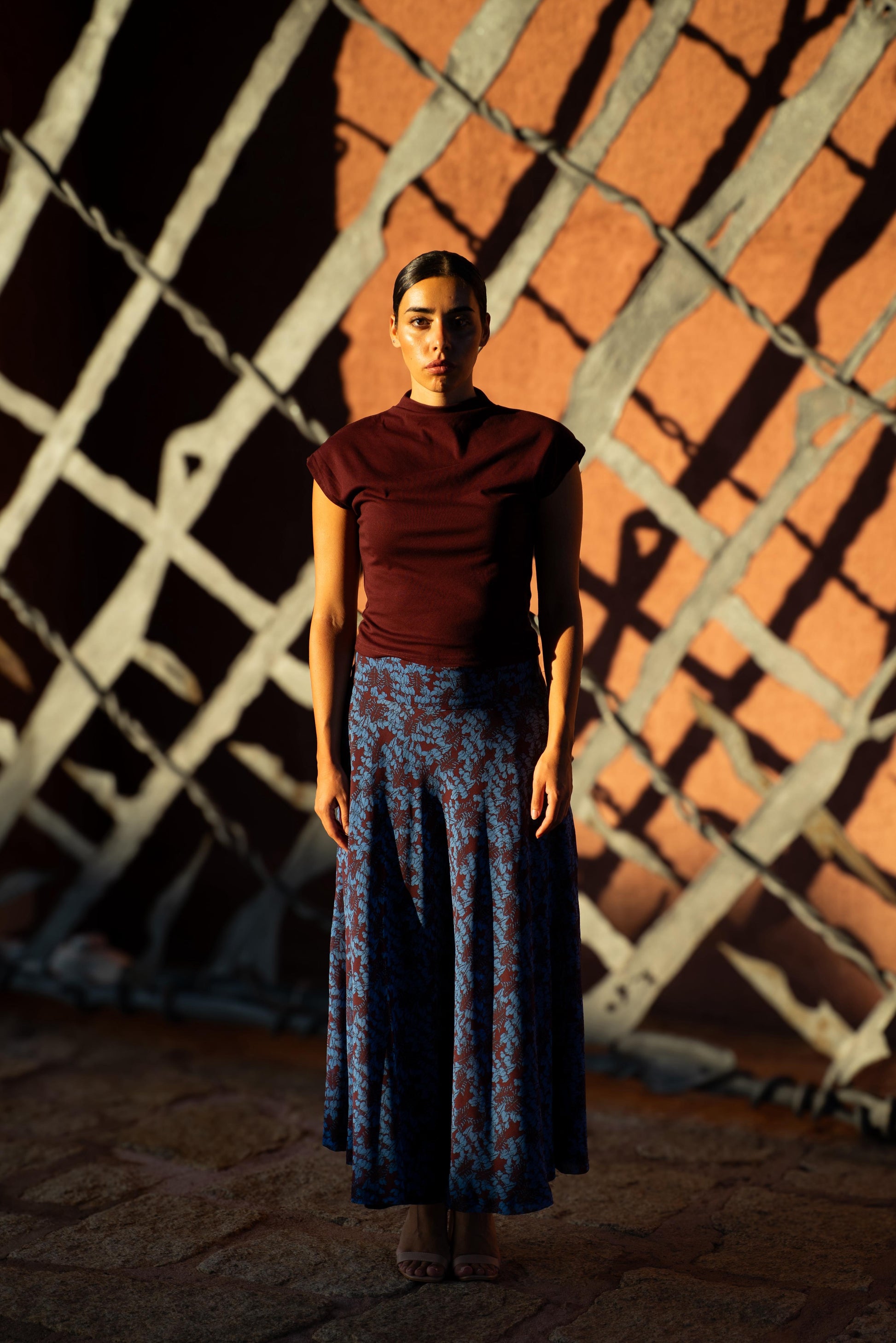 Gonna lunga modello Malu’ dal tessuto fluido e con fascia alta in vita a mezza ruota in viscosa color nero con fiori e una morbida fodero di mussola di cotone