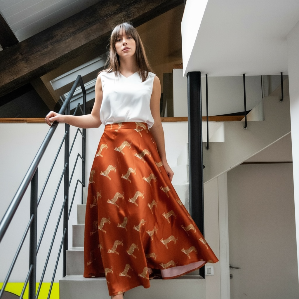 Gonna lunga modello Malu’ a mezza ruota in tessuto di satin morbido con tasche sui fianchi