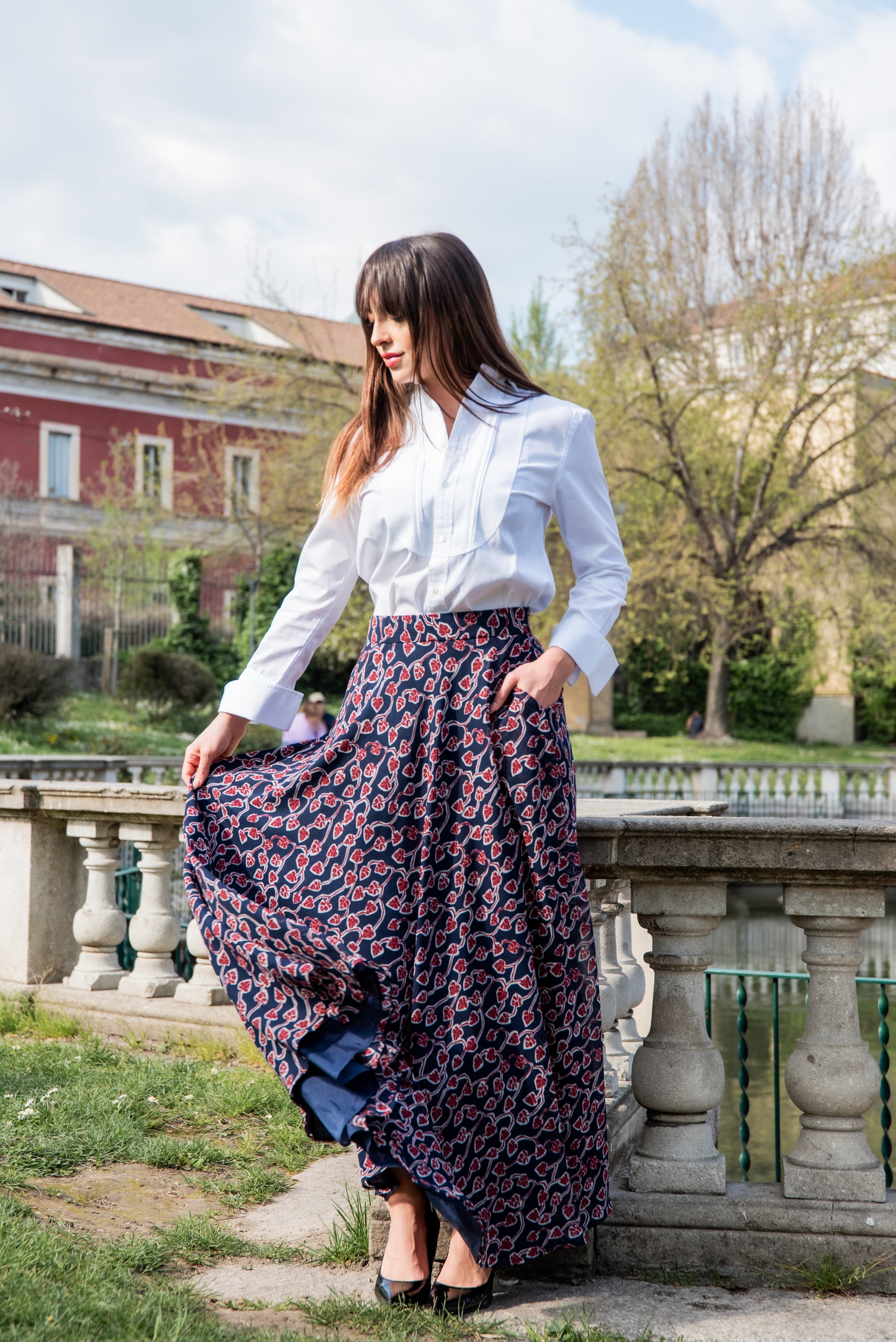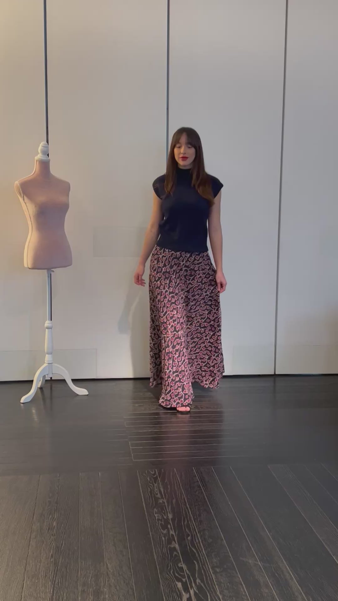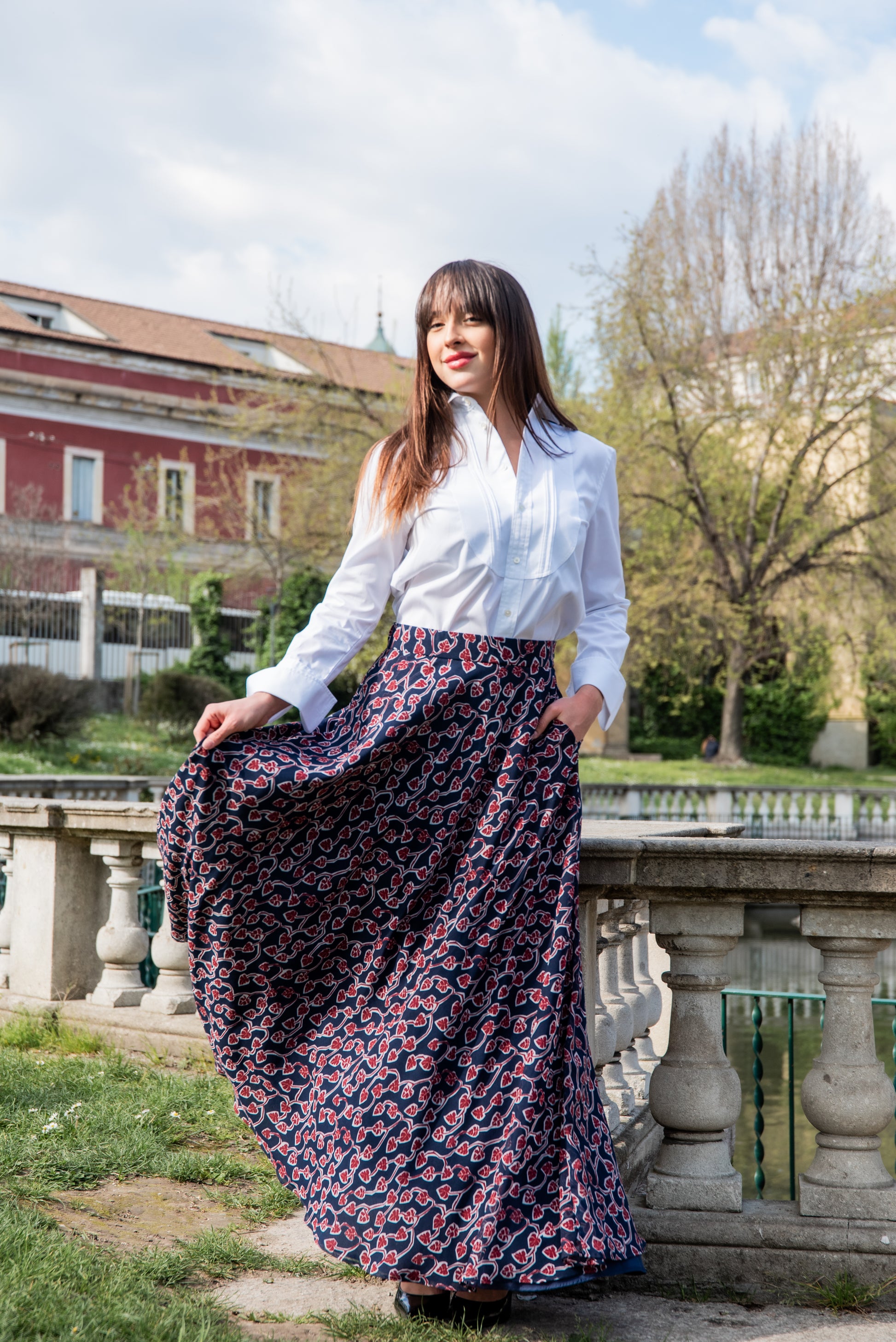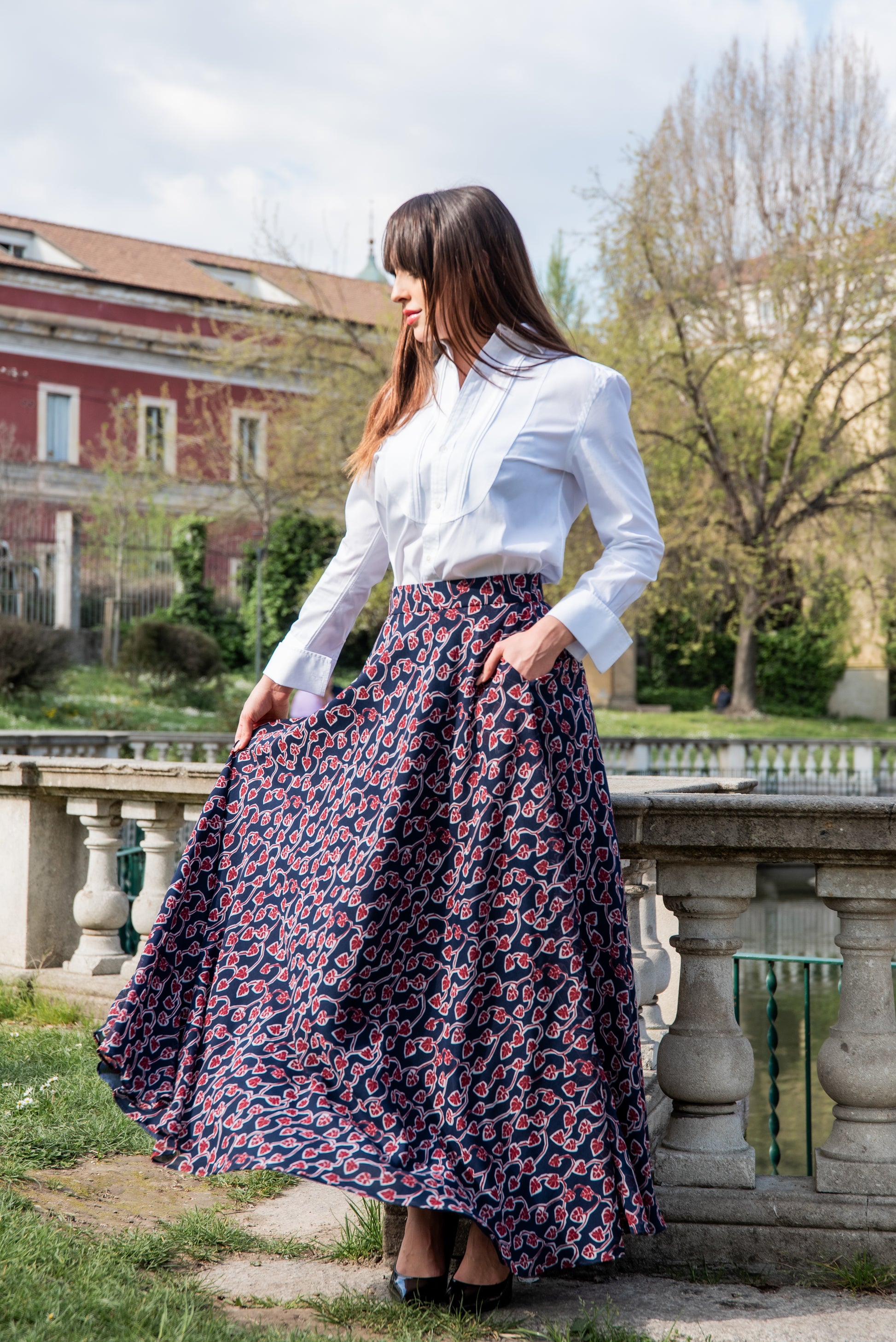 Gonna lunga modello Malu’ a mezza ruota in tessuto di chiffon morbido con tasche sui fianchi e una morbida fodera che rende la gonna utilizzabile nelle 4 stagioni perfetta in inverno con un golf di cachemire è stupenda in estate con un top o una camicia di cotone. La gonna Malu’ è un capo intramontabile e molto versatile.