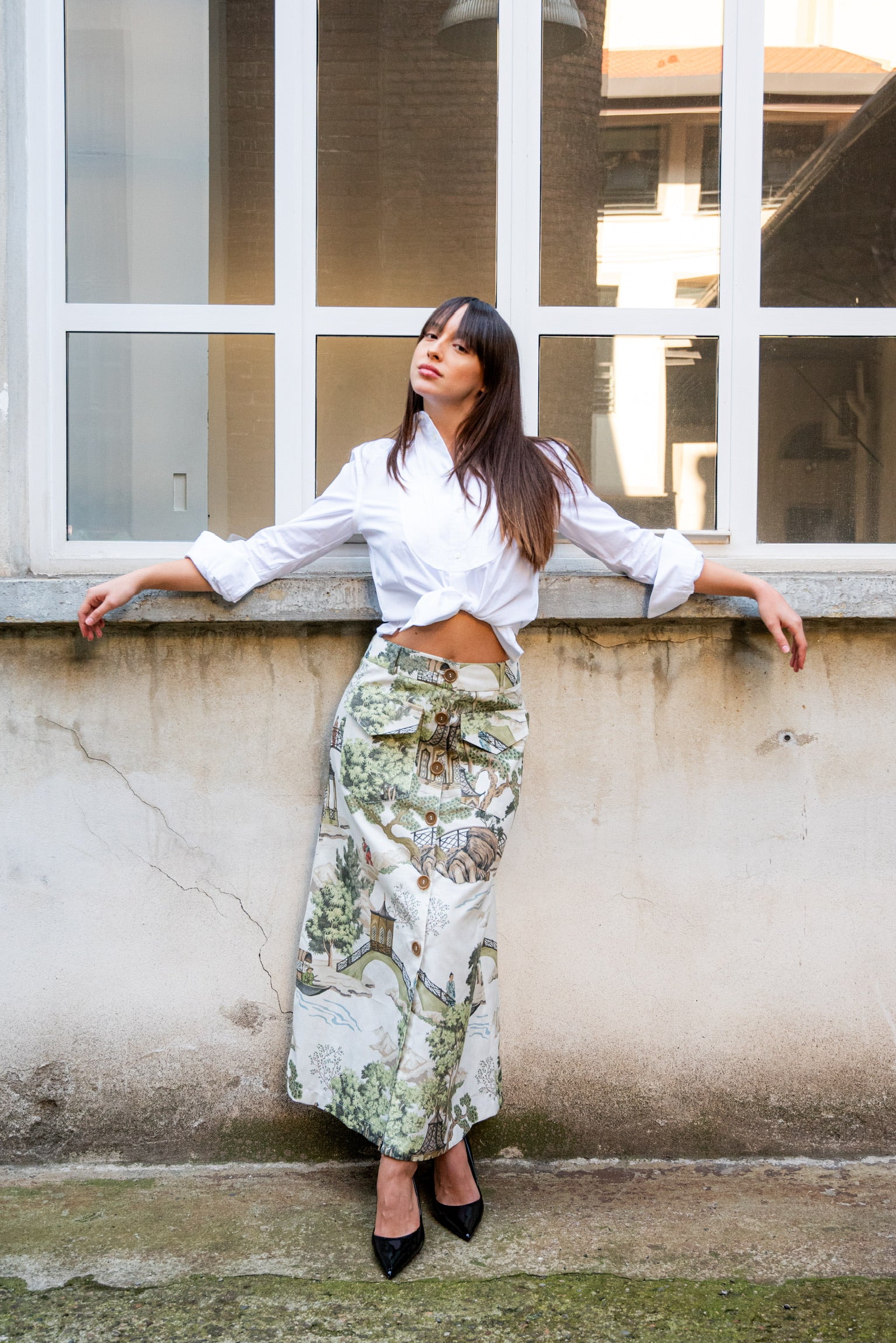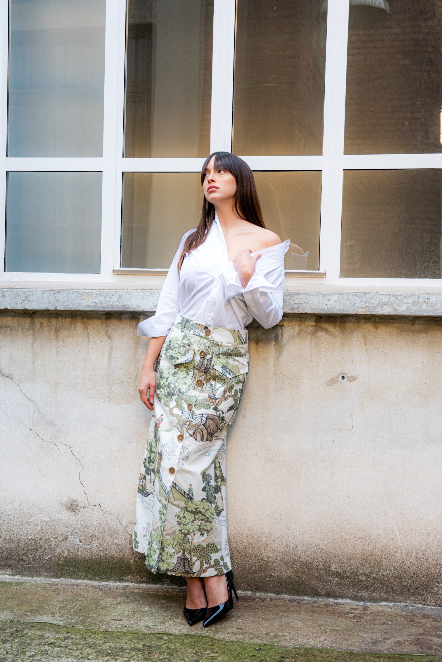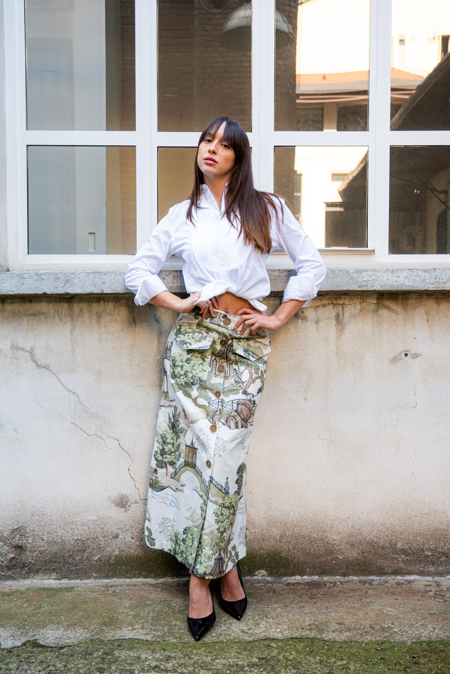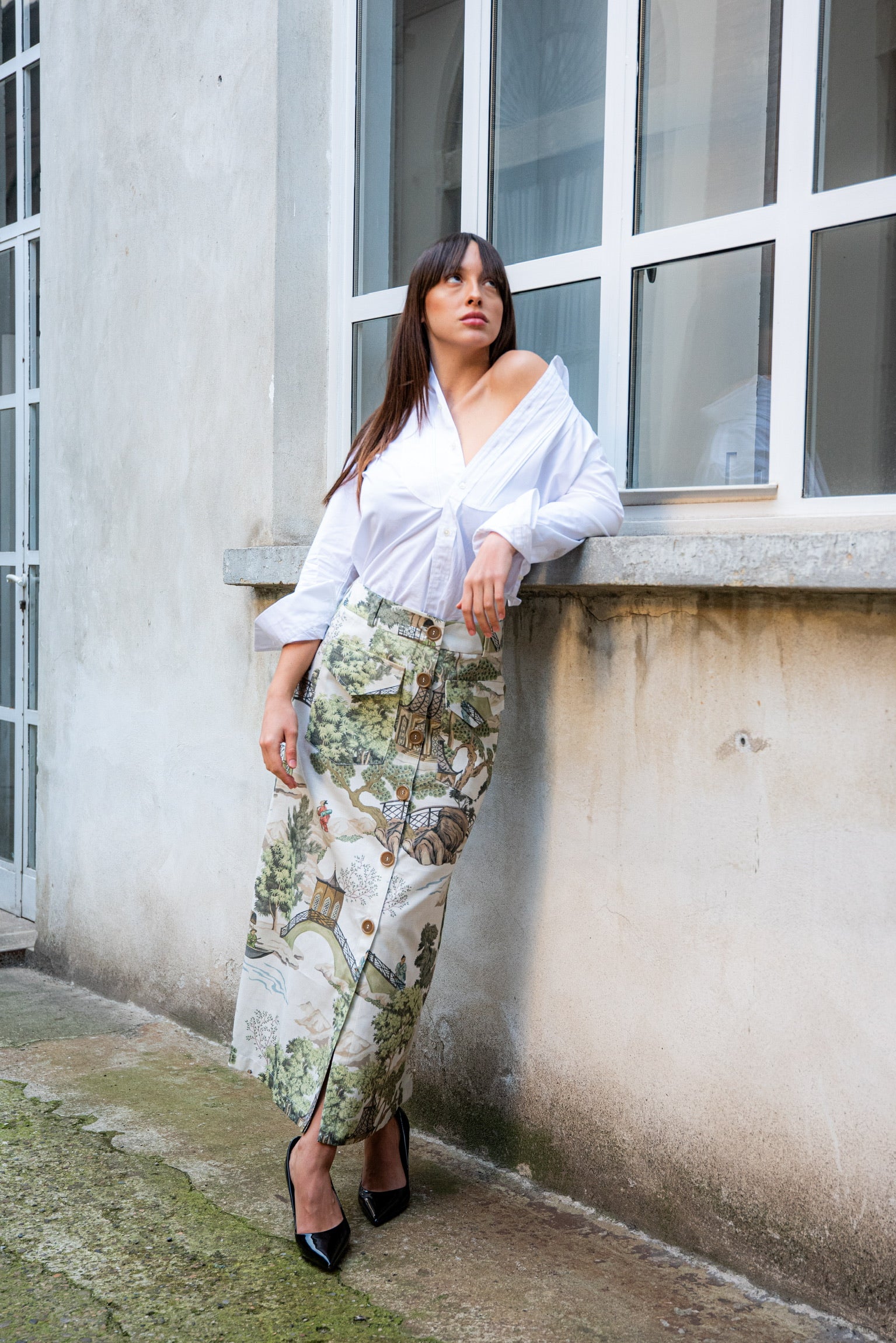 Gonna lunga motivo Tokyo in cotone pesante con tasche sul davanti, abbottonatura con eleganti bottoni bruniti color avio con disegni savana color nero