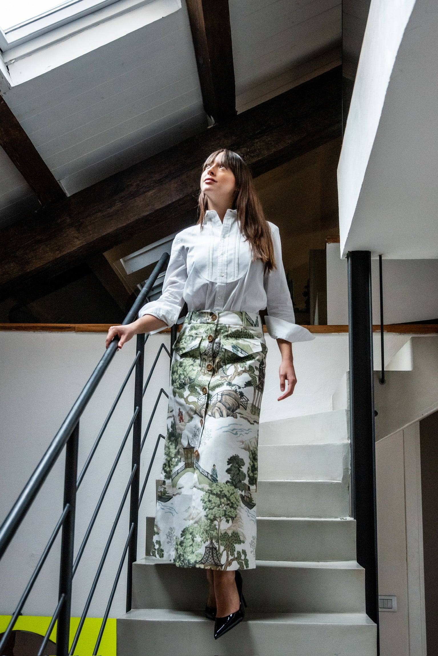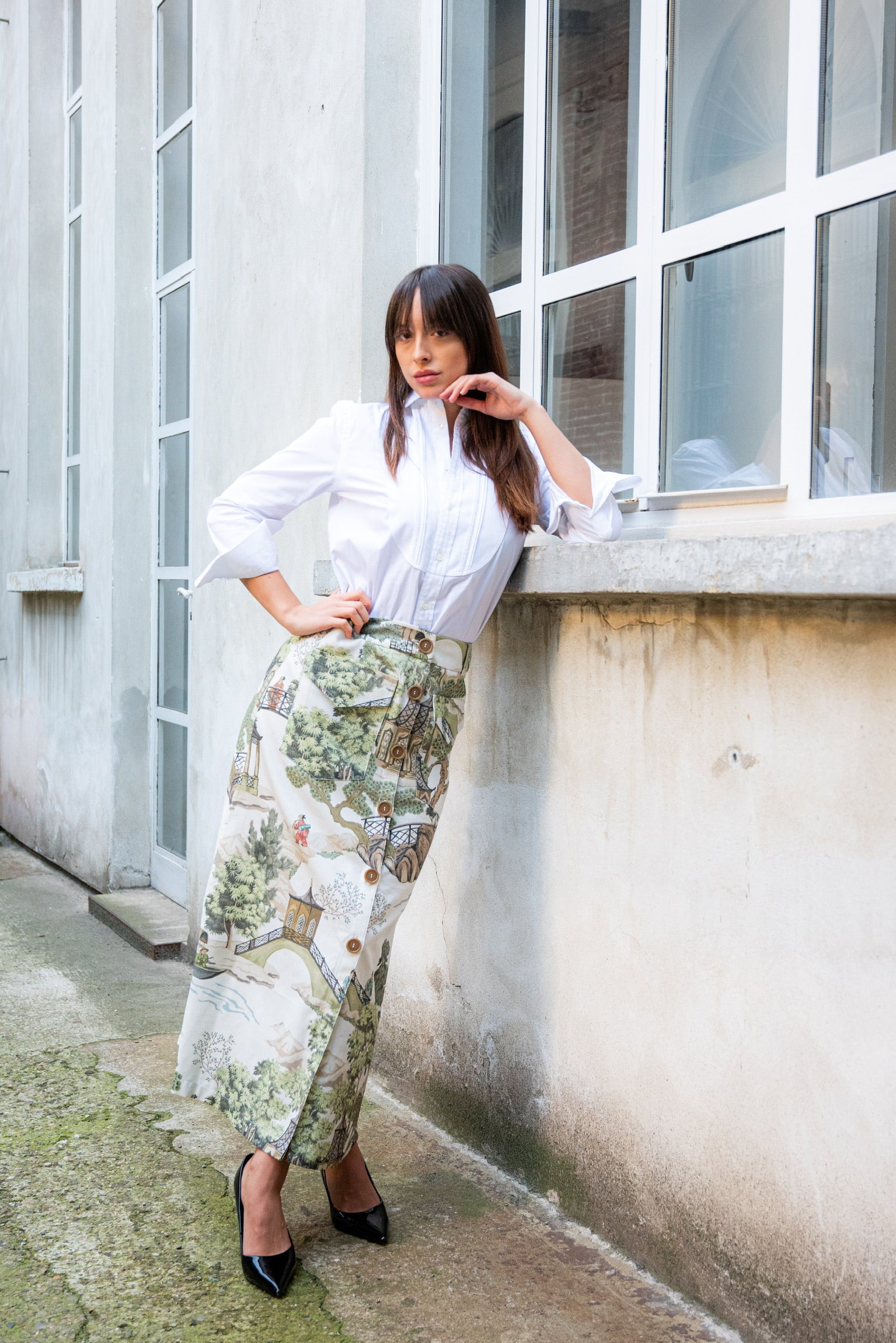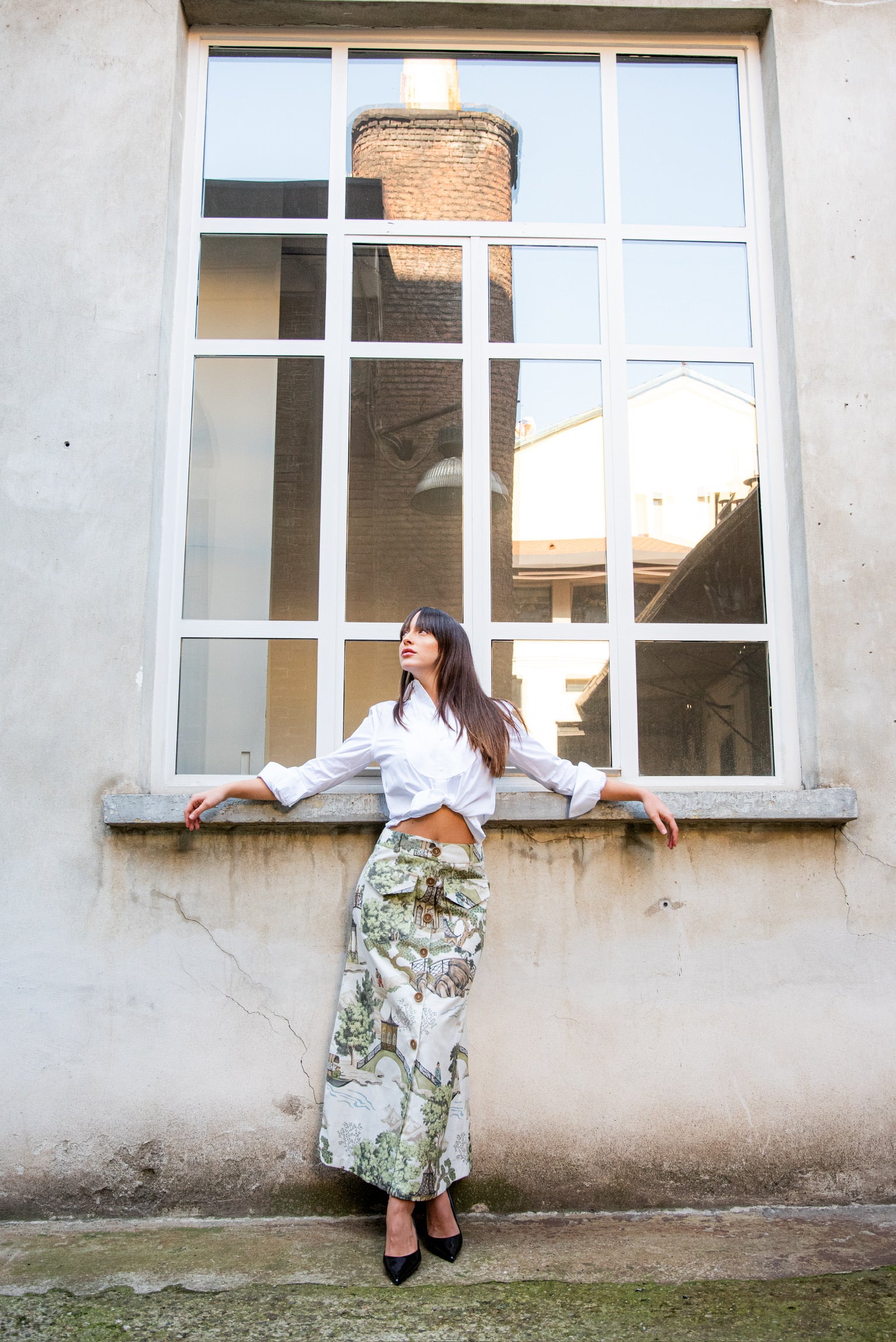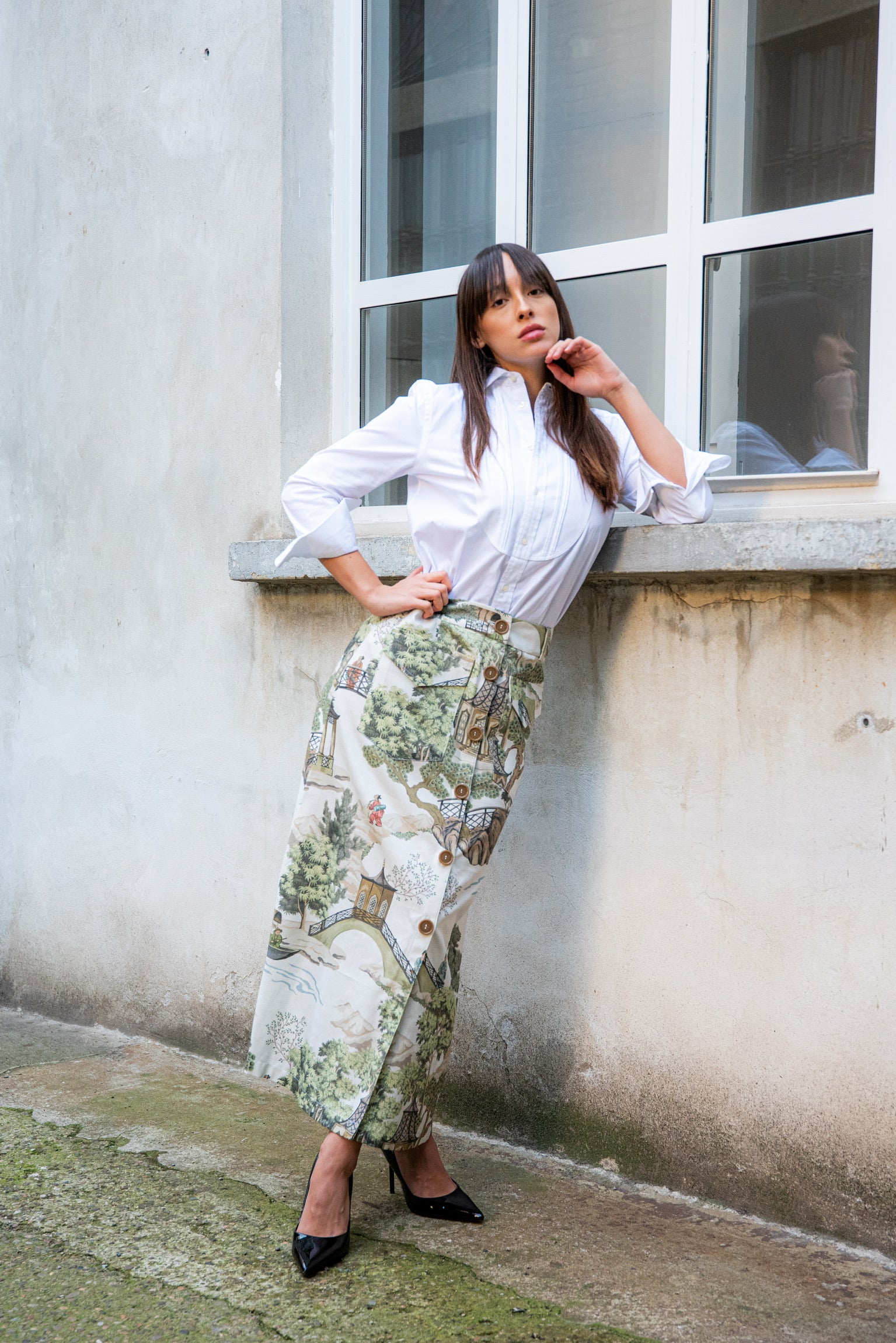 Gonna lunga motivo Tokyo in cotone pesante con tasche sul davanti, abbottonatura con eleganti bottoni bruniti color avio con disegni savana color nero