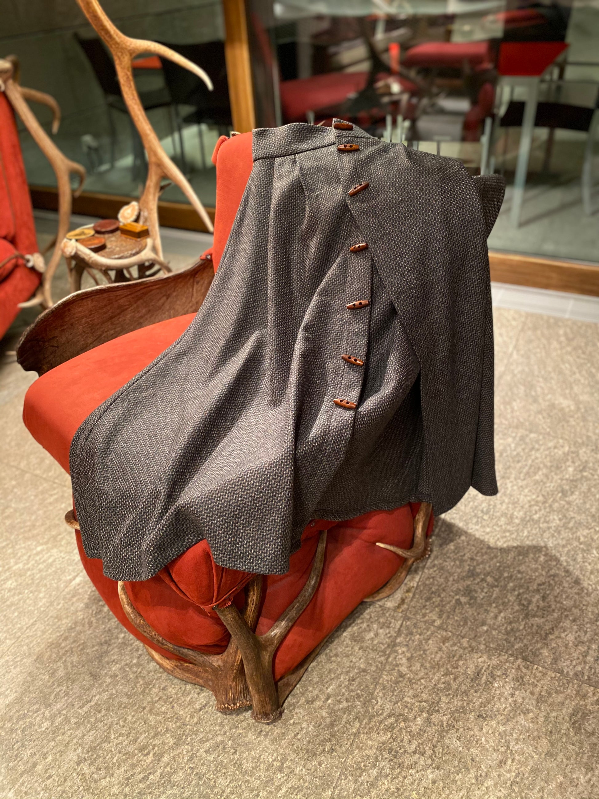 Gonna Modello Miriam con motivo a quadrettI con tasche laterali e abbottonatura sul davanti con bottoni in legno.