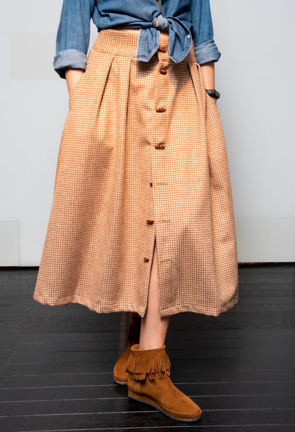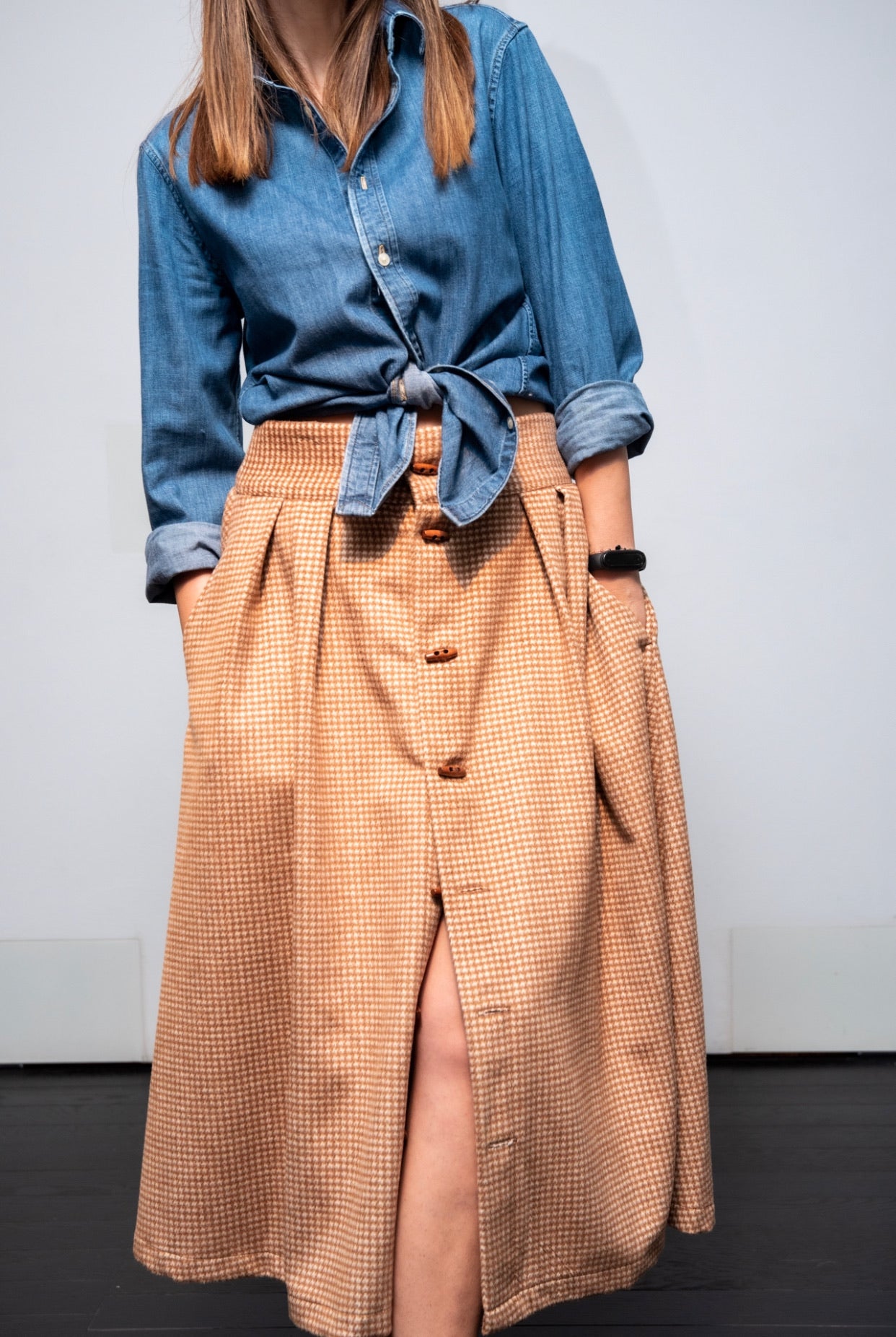 Gonna Modello Miriam con motivo a quadrettI con tasche laterali e abbottonatura sul davanti con bottoni in legno.