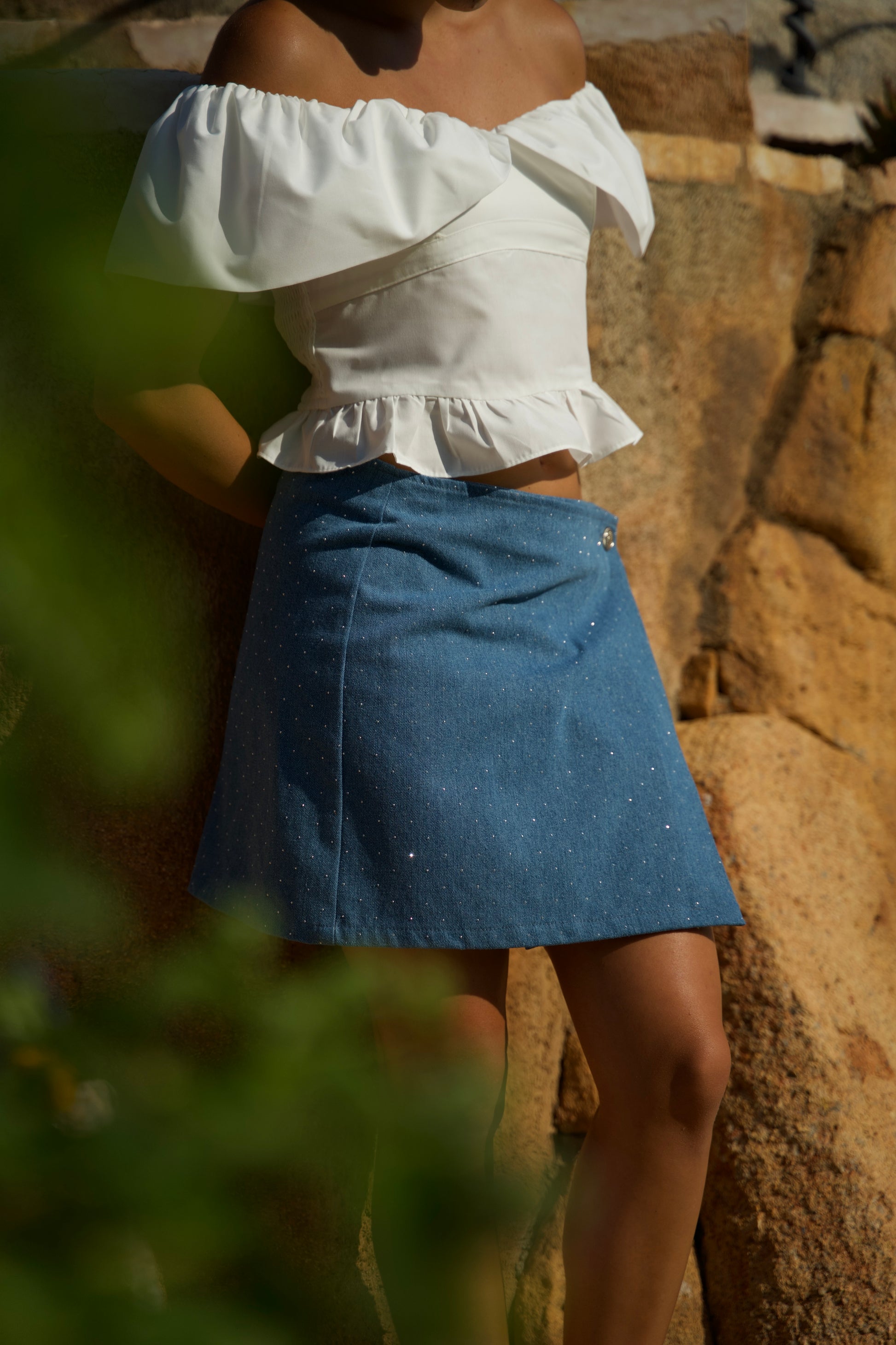 Minigonna Modello Monica in tessuto a jeans con micro strass