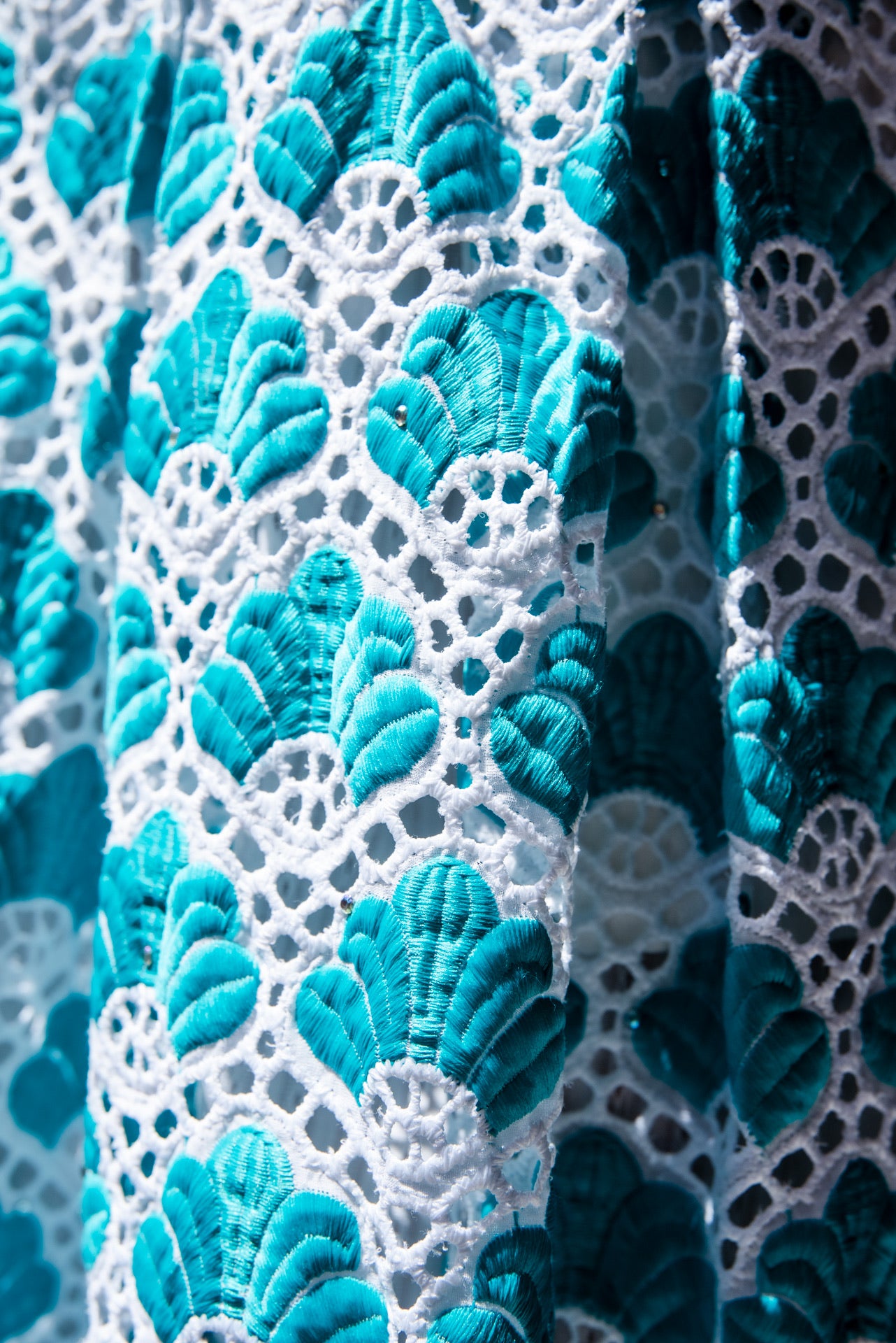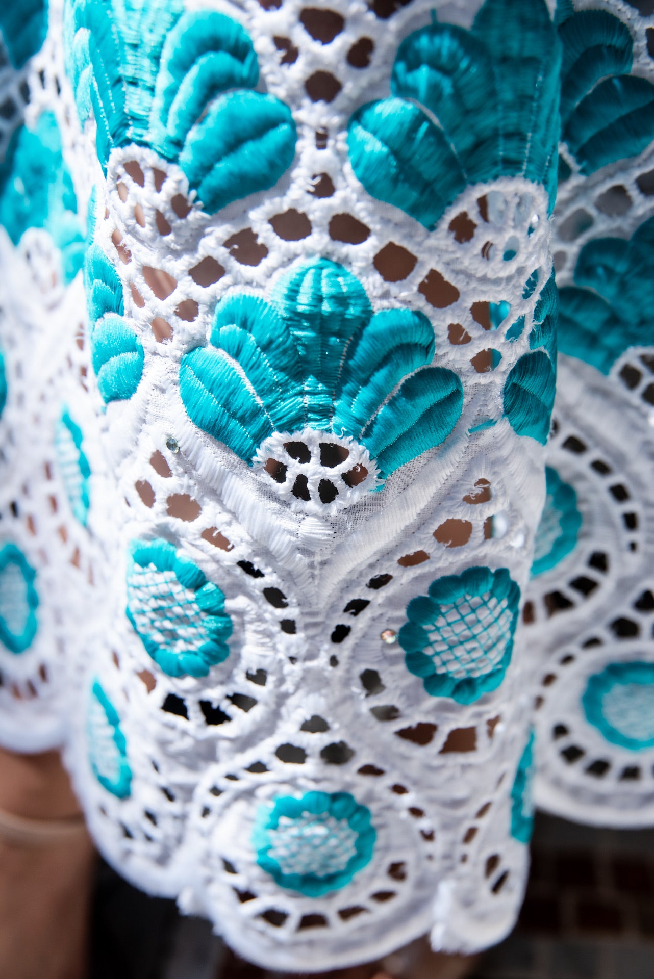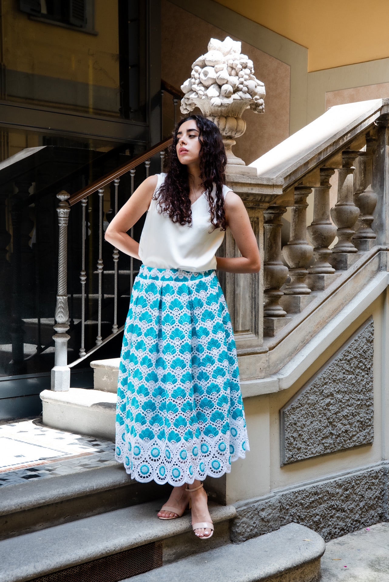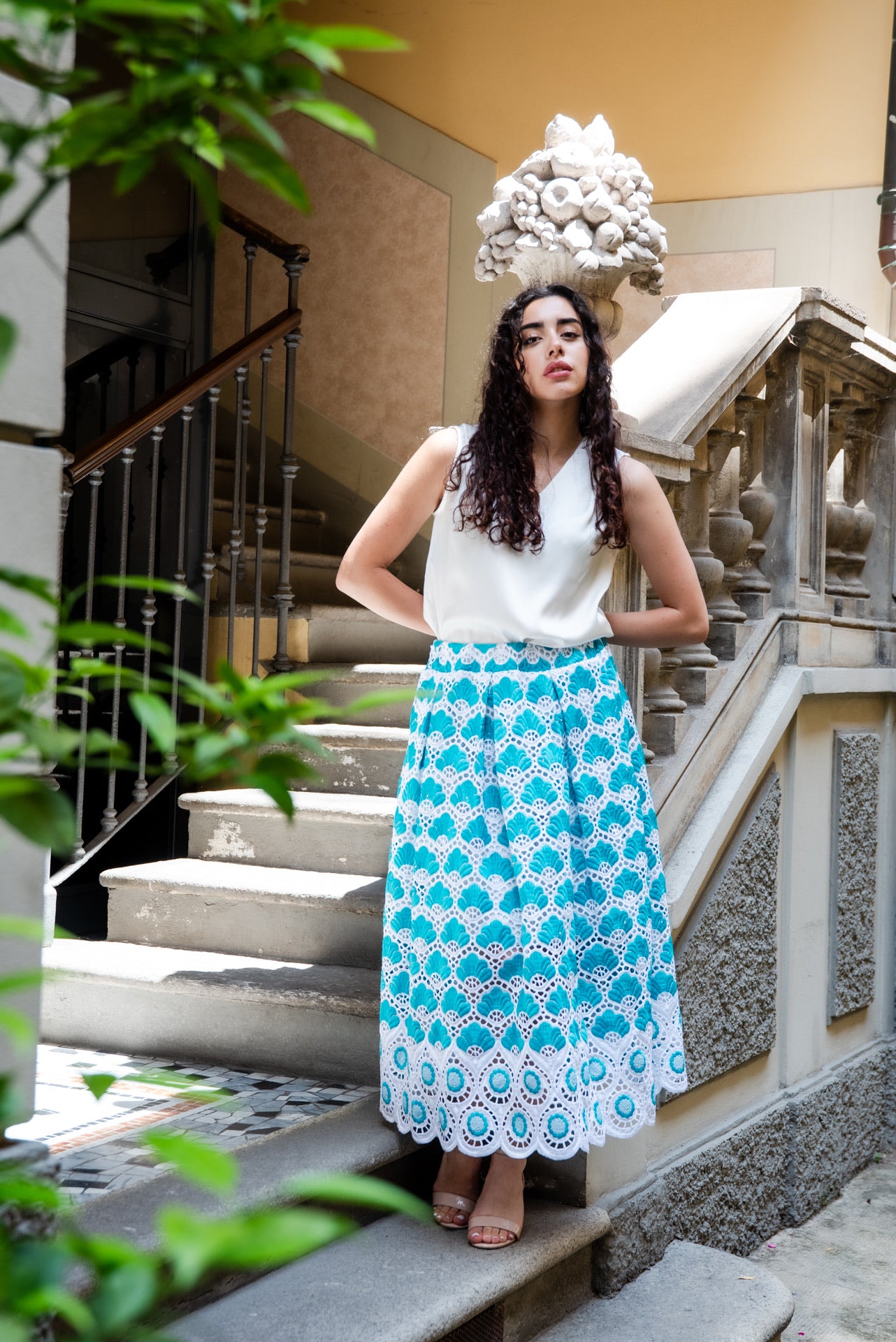 Questa gonna LIMITED EDITION è caratterizzata da un meraviglioso tessuto interamente ricamato nei colori del turchese e bianco che rendono la gonna un capo unico e prezioso.