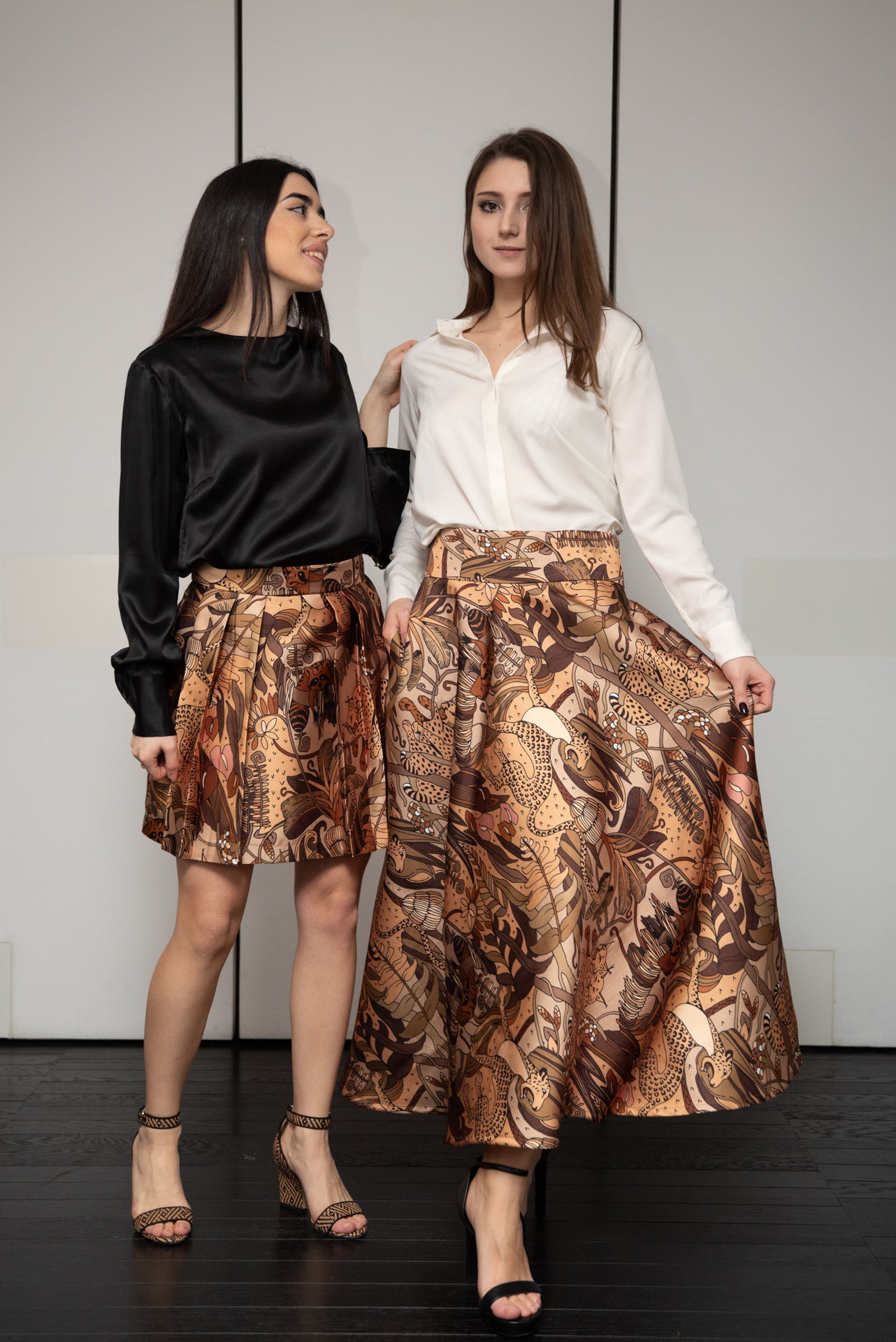 Gonna Modello Paola in tessuto mikado con disegno SAVANA con tasche laterali e pieghe sul davanti con elastico in vita.