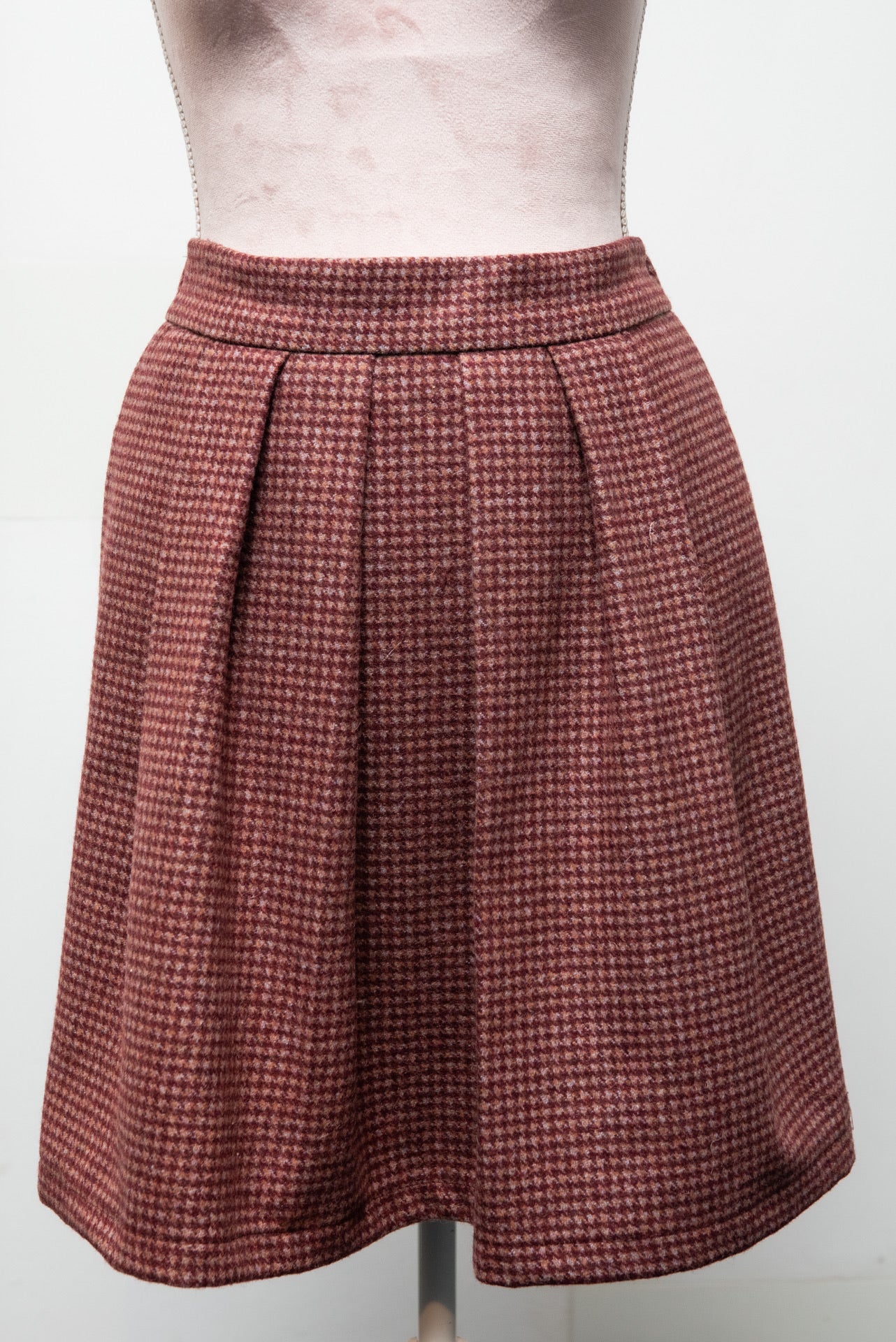 Gonna Modello Paola con motivo a quadrettI con tasche laterali e pieghe sul davanti con elastico in vita.