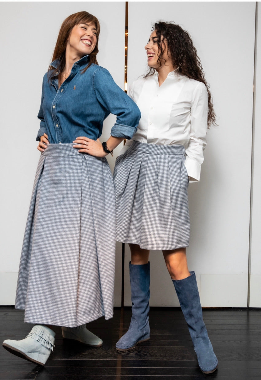 Gonna Modello Paola con motivo a quadrettI con tasche laterali e pieghe sul davanti con elastico in vita.