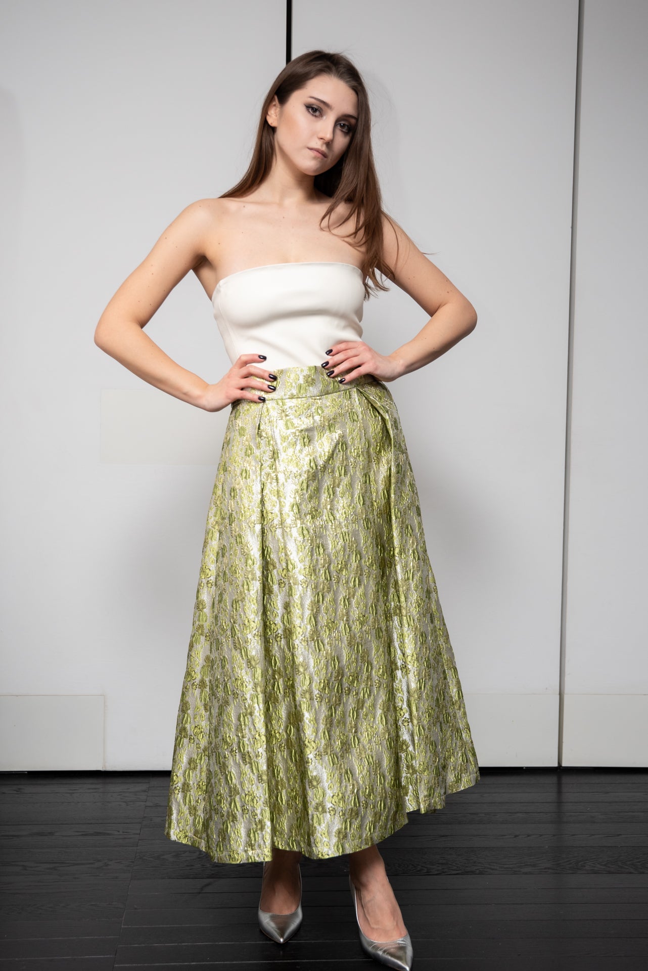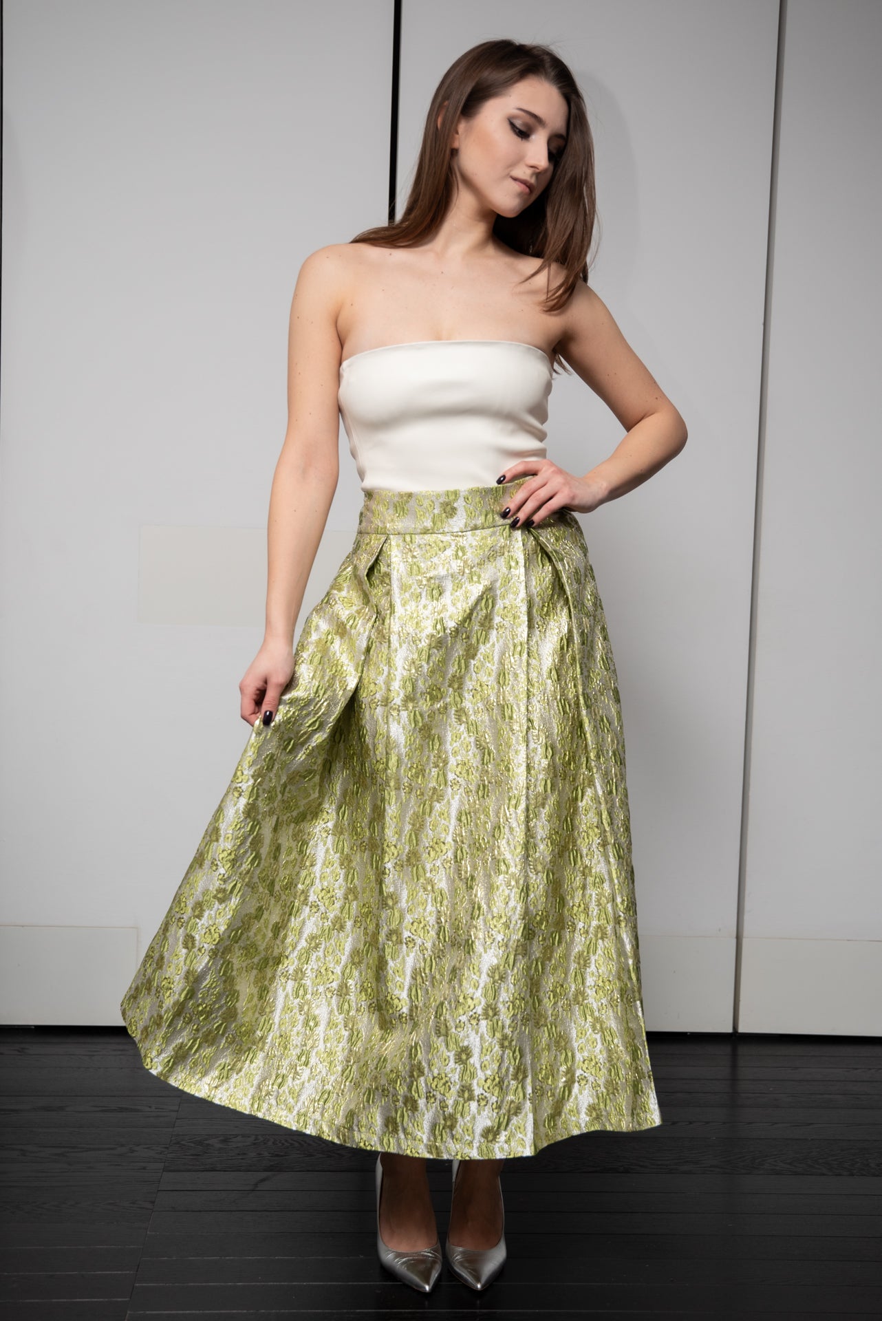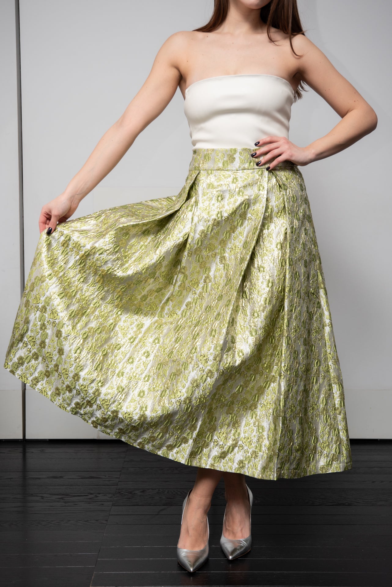 la Gonna Robi si abbina facilmente a bluse in seta o camicie bianche, creando un outfit impeccabile per occasioni speciali. Le pieghe donano movimento e leggerezza, mentre il broccato di colore salvia aggiunge un tocco di classe e originalità.
