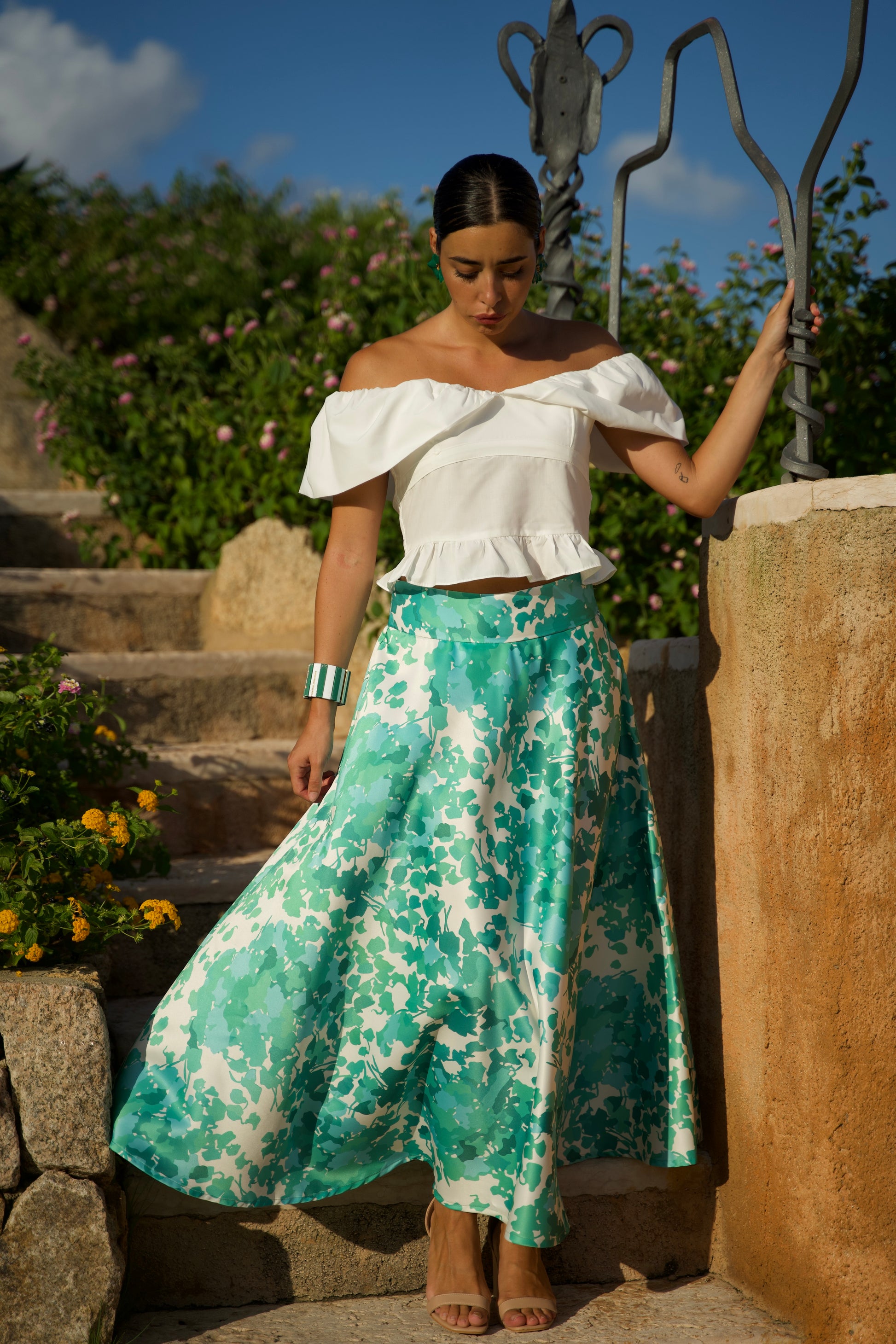 Gonna Modello Valentina in tessuto Douchesse con disegno geometrico e pieghe sul davanti questa gonna e’ confezionata su misura quindi la consegna è in 10 giorni lavorativi