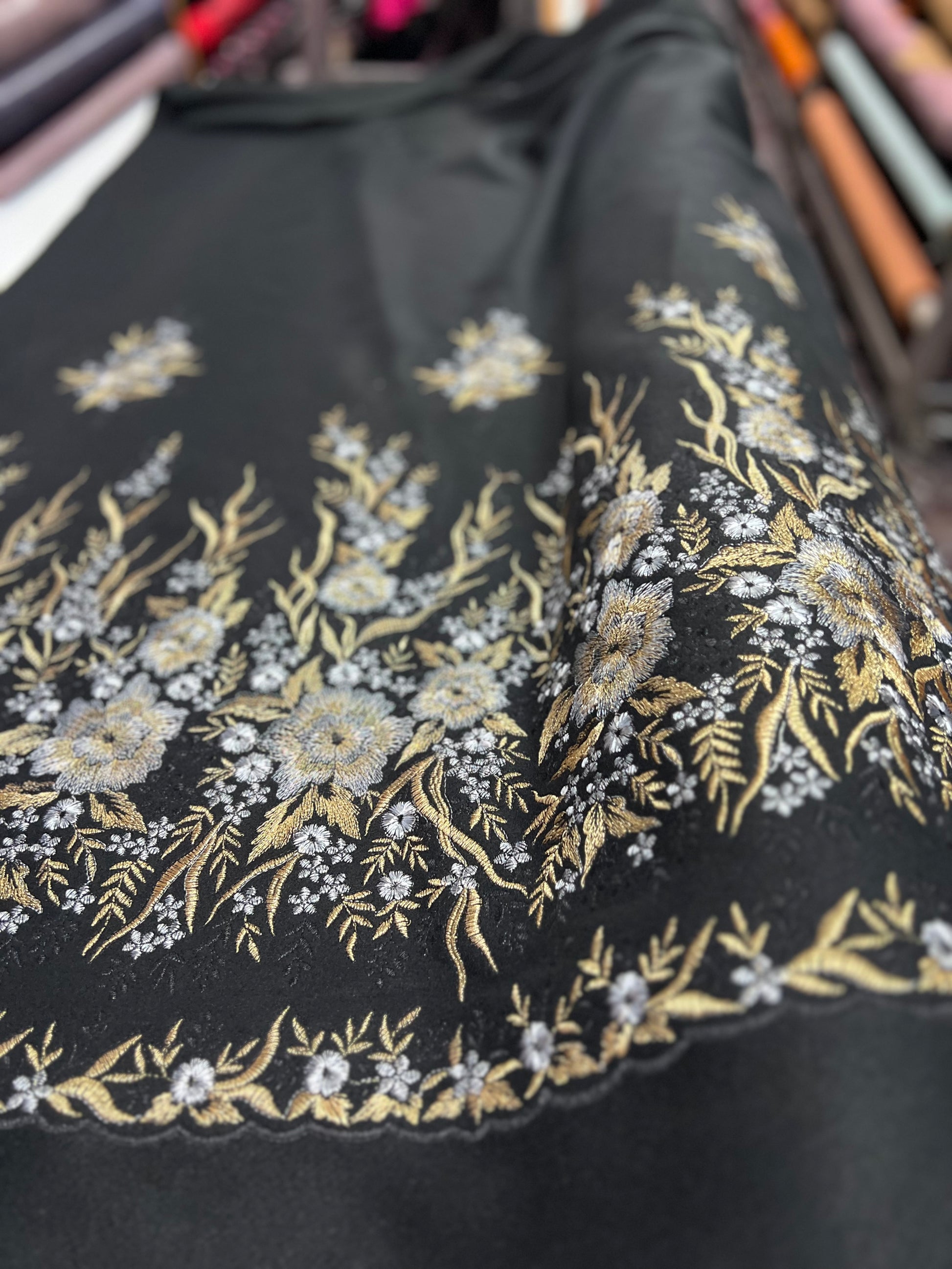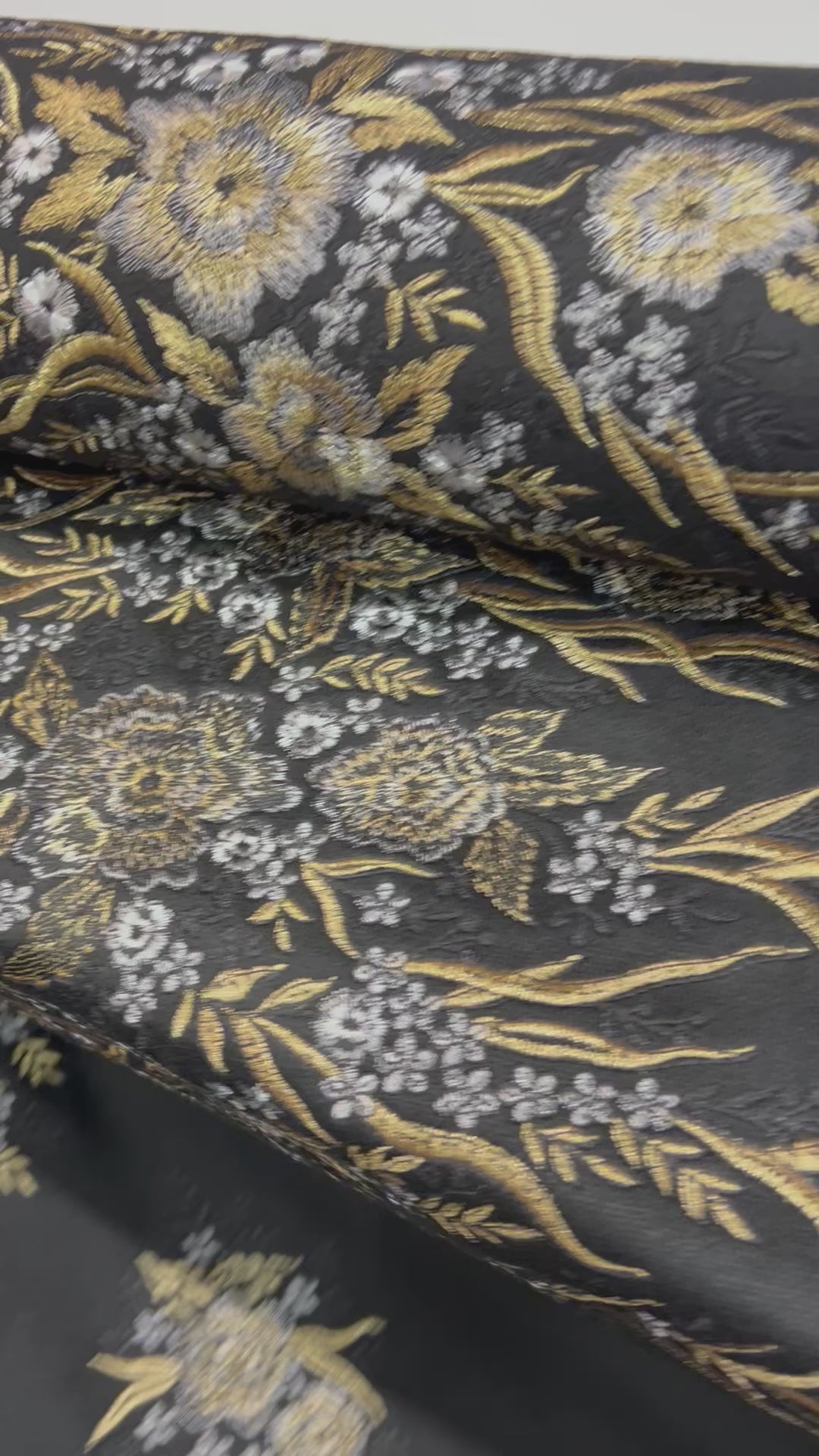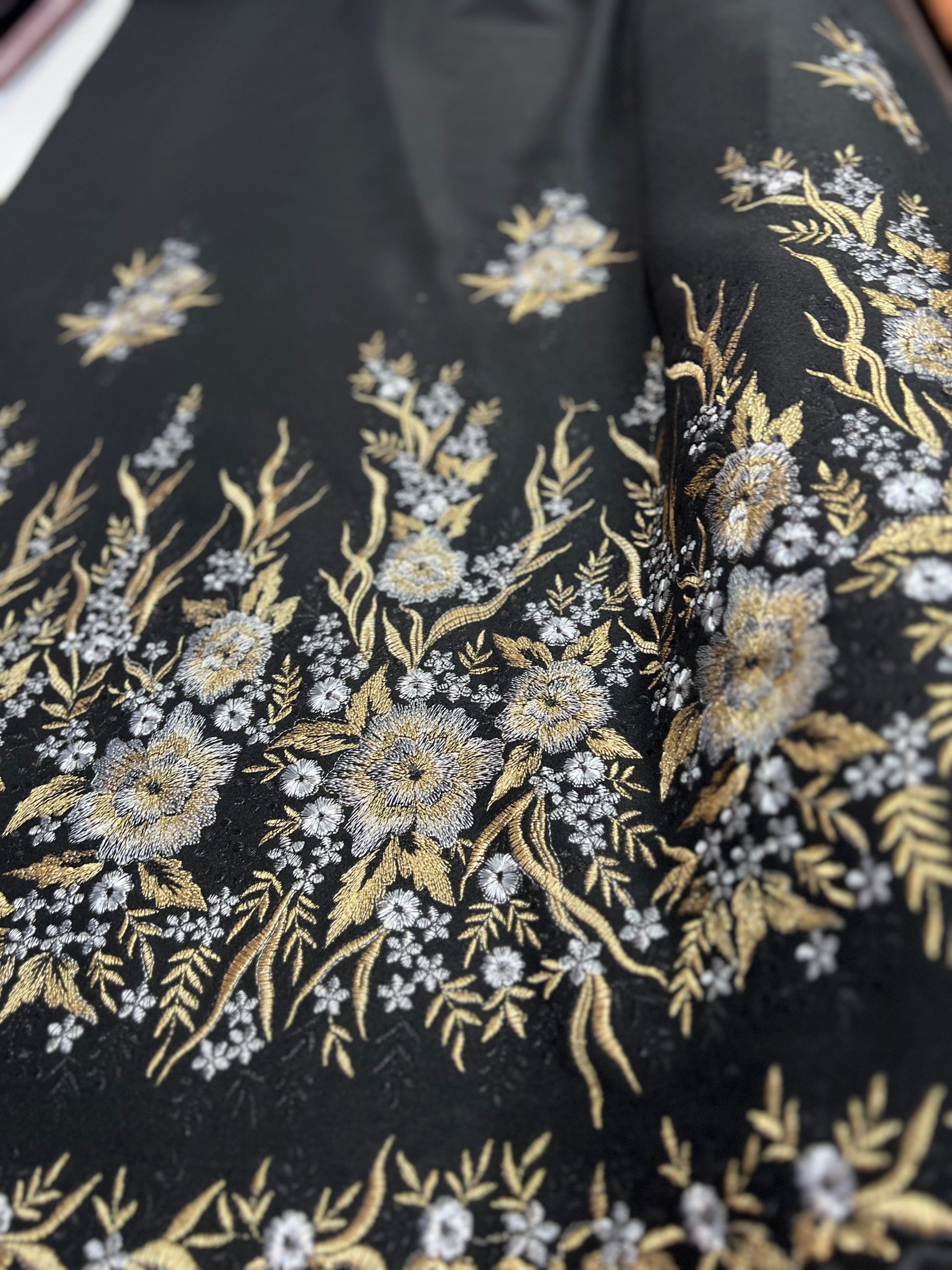 Gonna Sandrina LIMITED EDITION in un meraviglioso e prezioso tessuto di lana ricamato NERO con fiori oro e argento RICAMATI SUL FONDO.