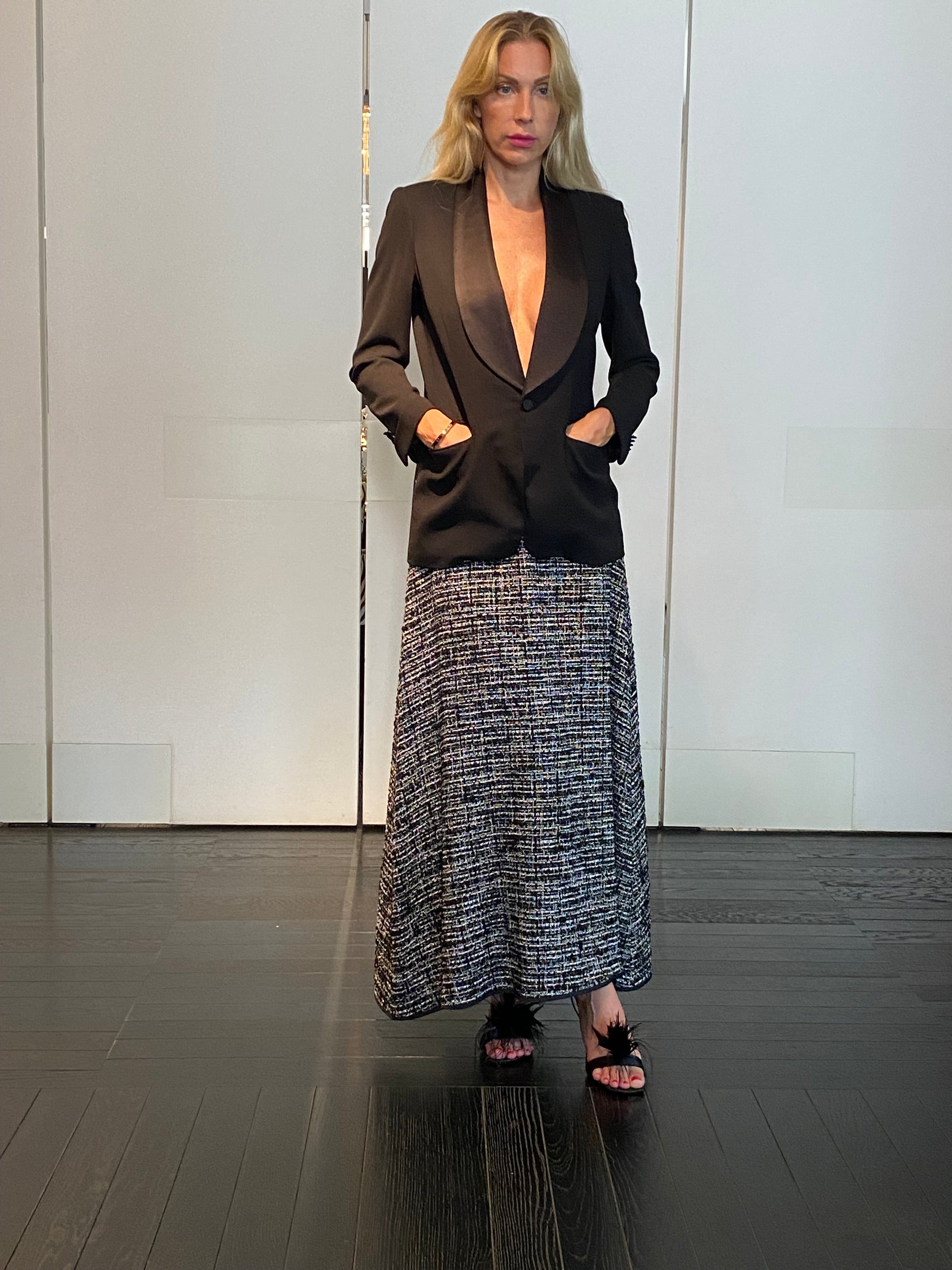 il modello Sandrina è un modello di gonna a trapezio che in questo caso fa risaltare il tessuto la lunghezza può essere alla caviglia per un capo estremamente elegante per una serata importante da indossare con un top elegante e tacco alto oppure a metà polpaccio e diventa un capo molto più versatile da utilizzare anche con un anfibio o uno stivale un dolcevita. Il tessuto è nero e il ricamo oro e argento