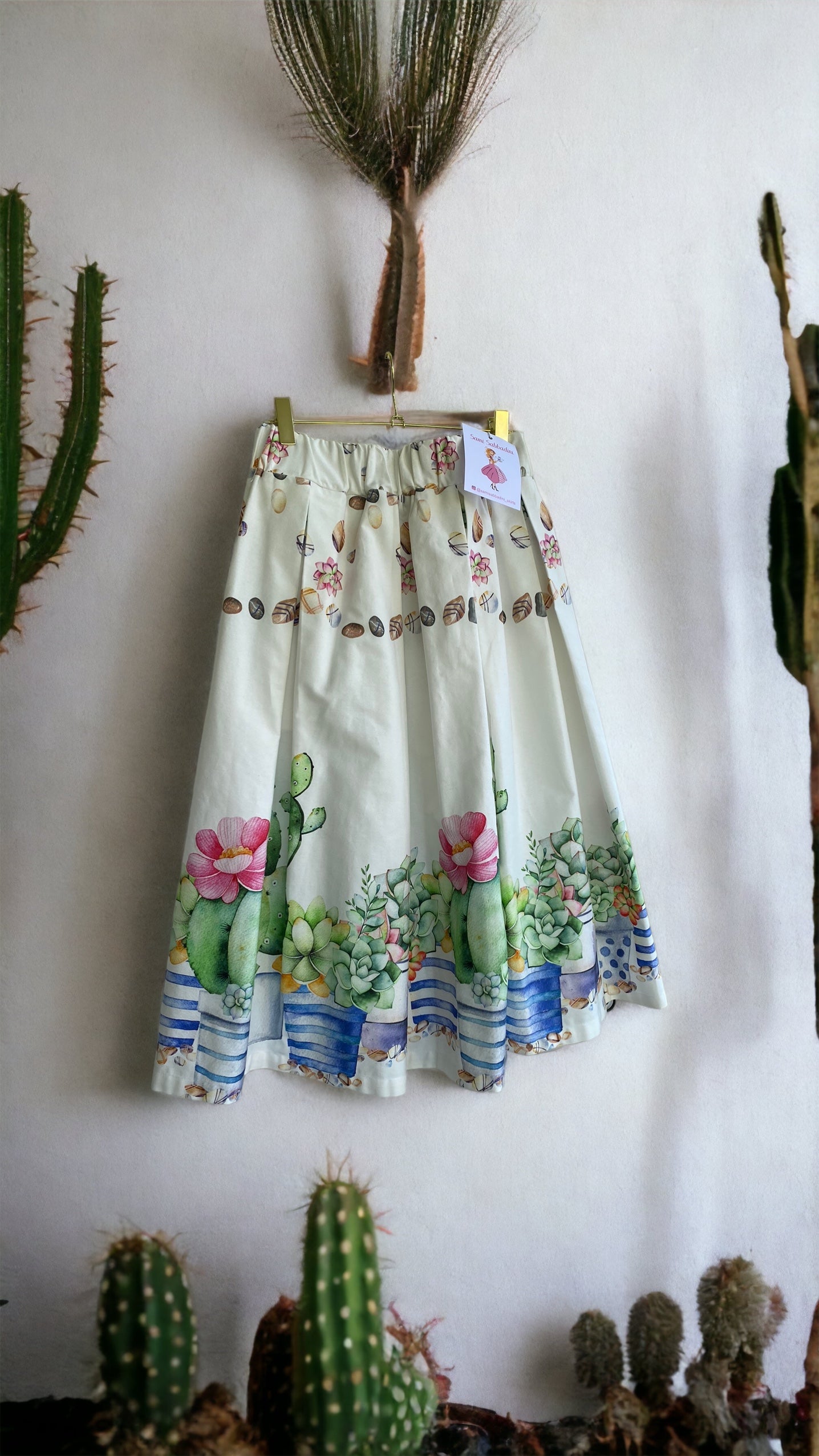 Lunga con pieghe sul davanti, in tessuto di cotone pesante colore fondo bianco con delicati disegni sul fondo che rendono la gonna un capo molto originale
