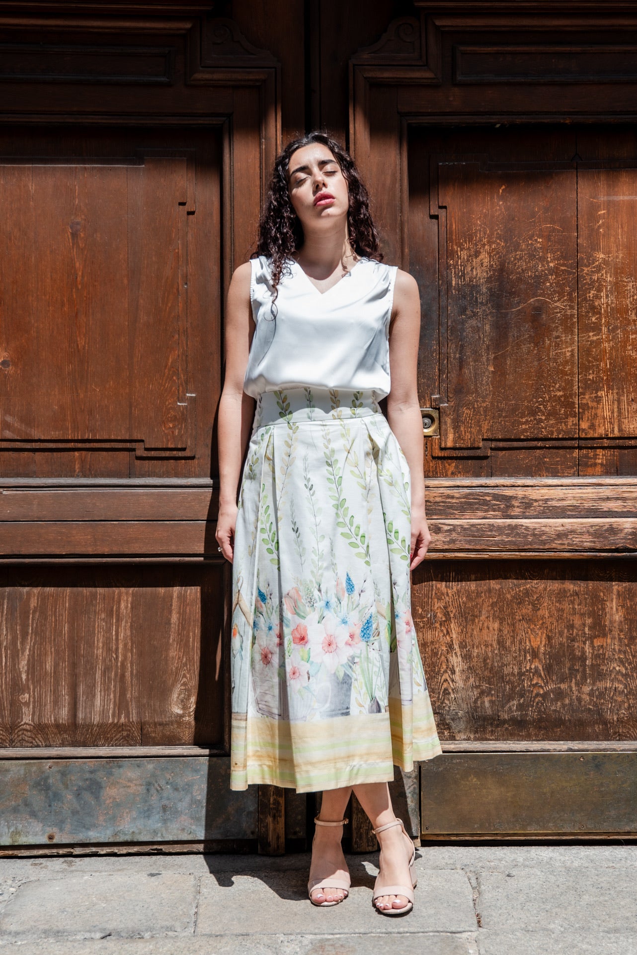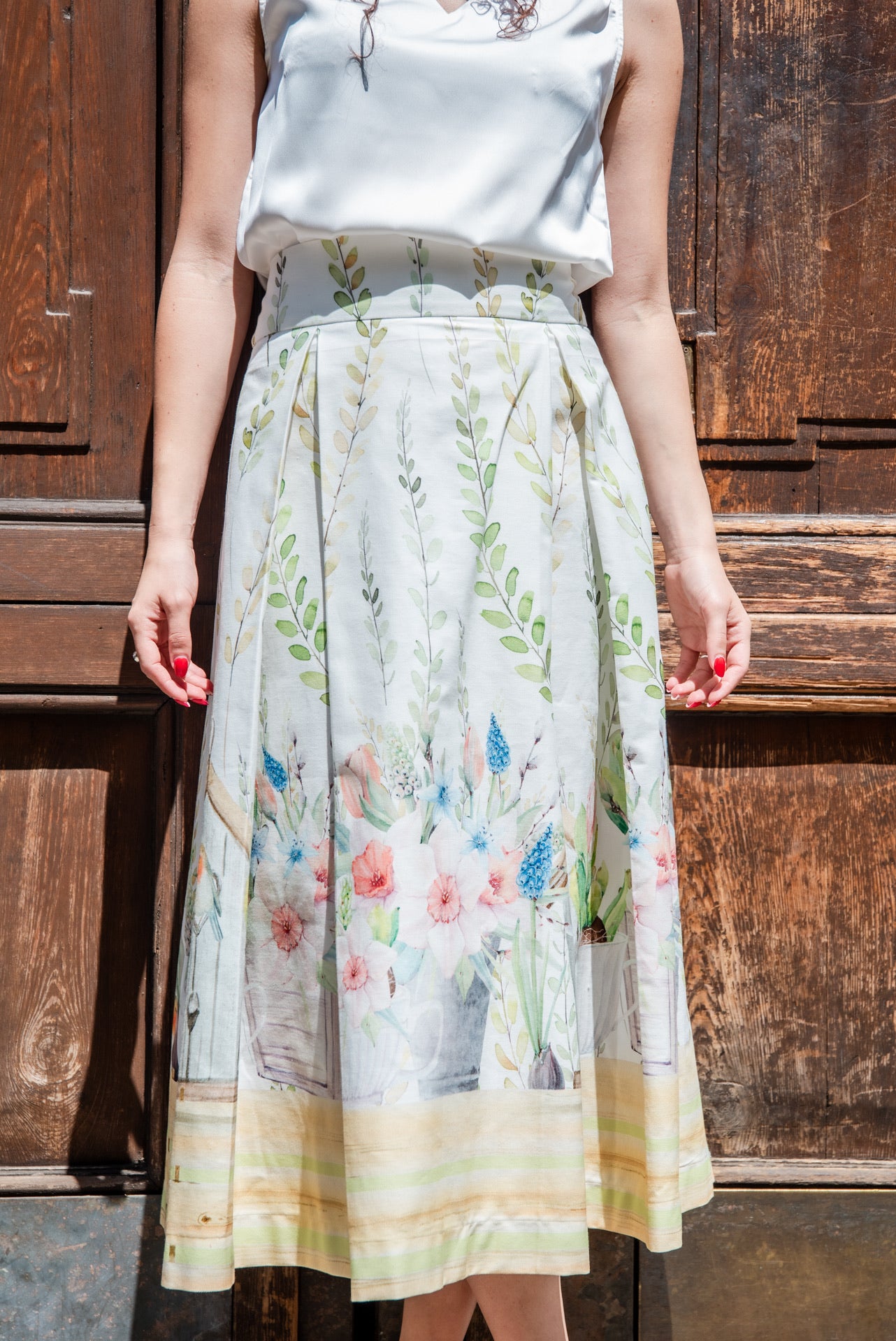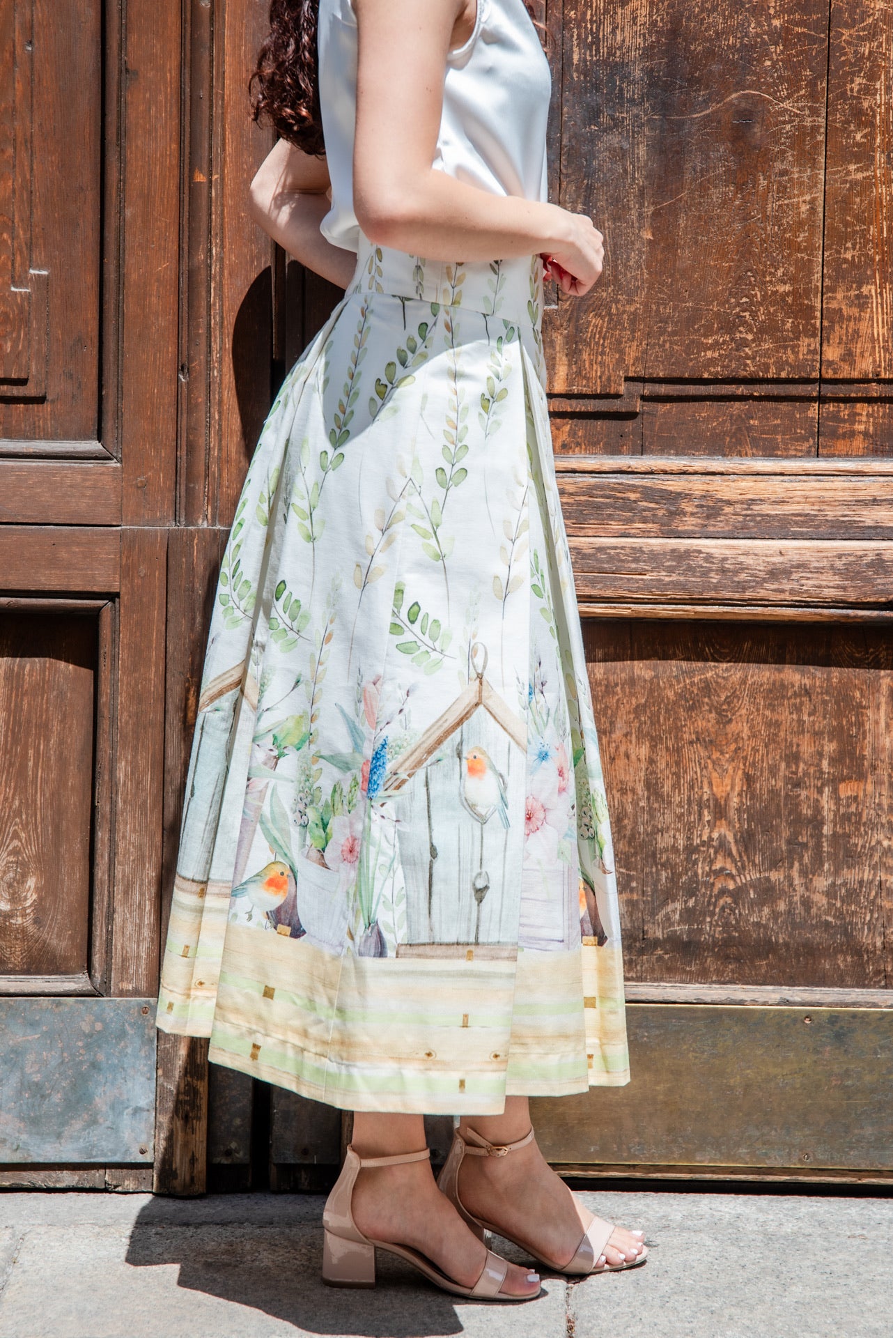 Lunga con pieghe sul davanti, in tessuto di cotone pesante colore fondo bianco con delicati disegni sul fondo che rendono la gonna un capo molto originale