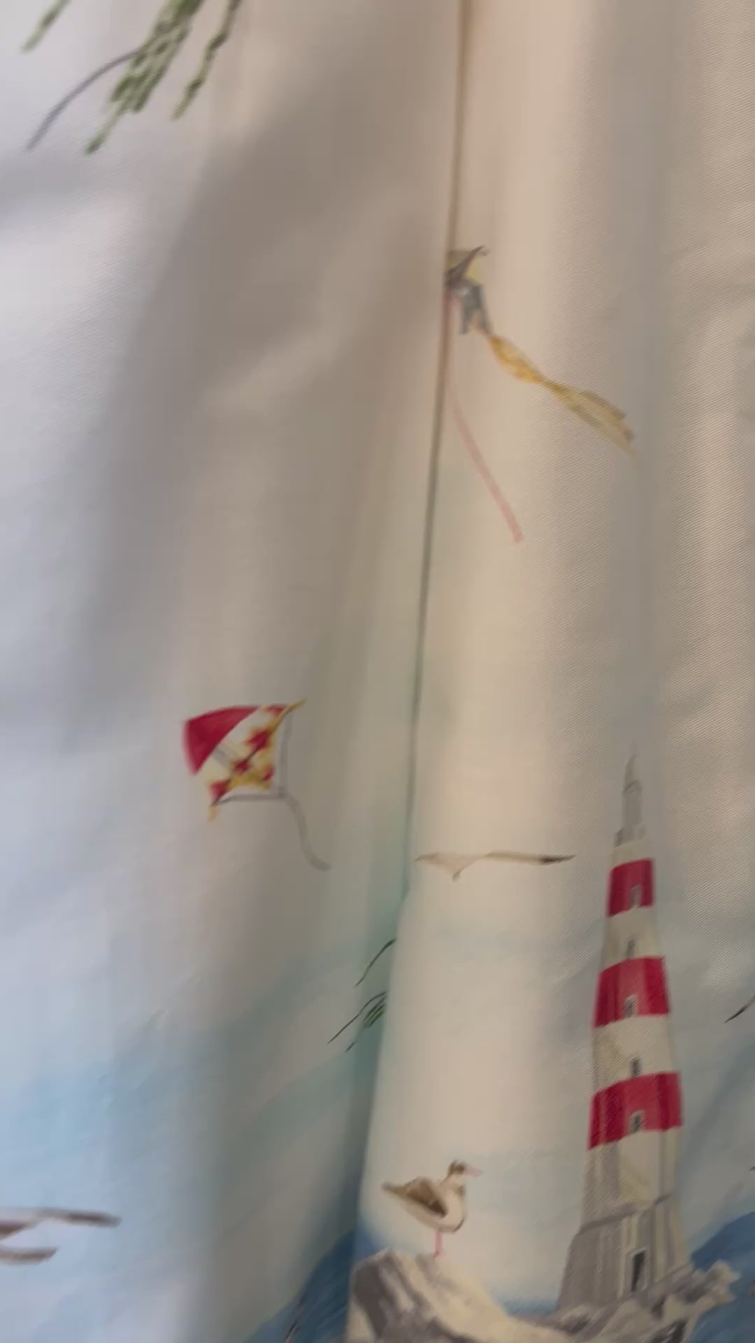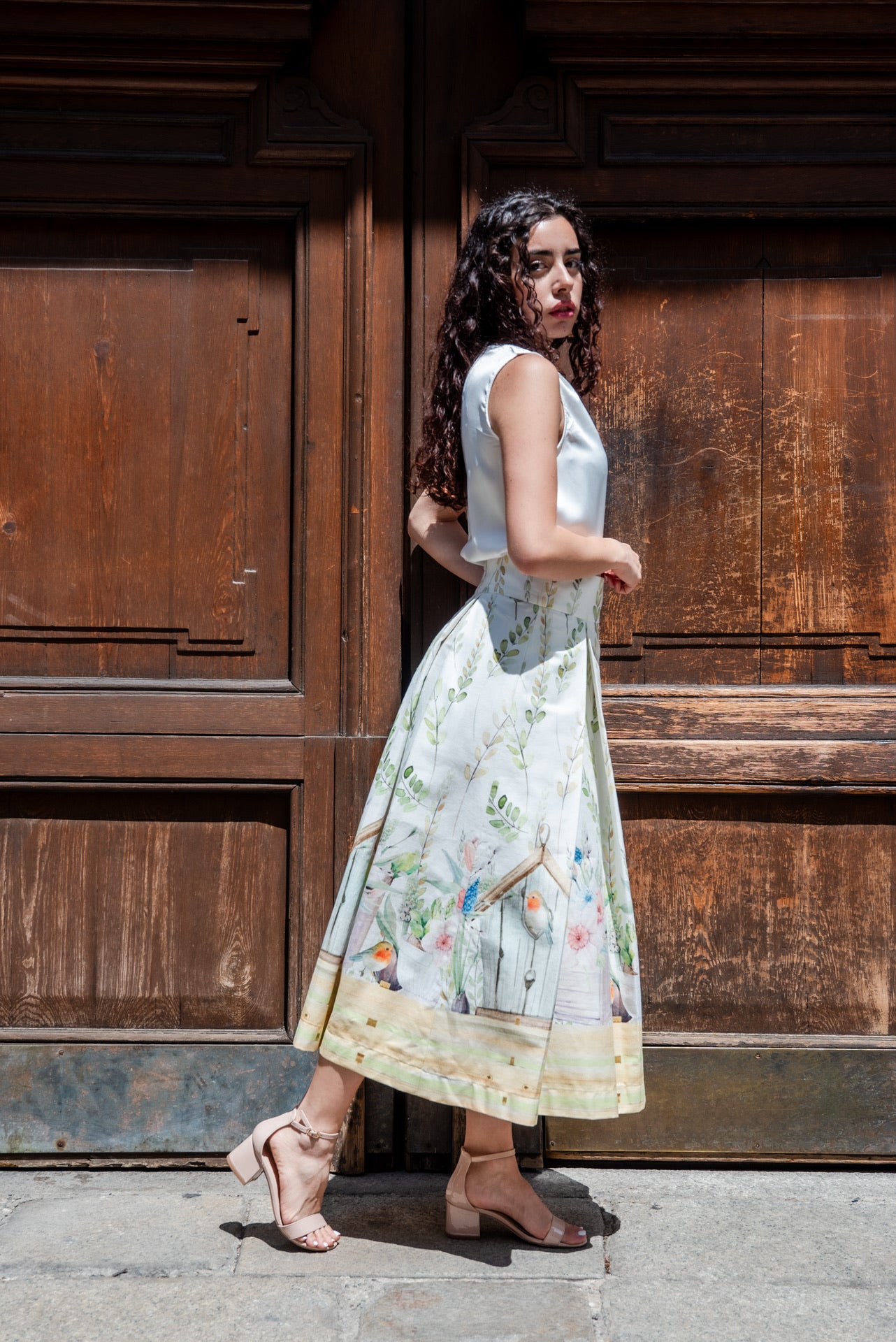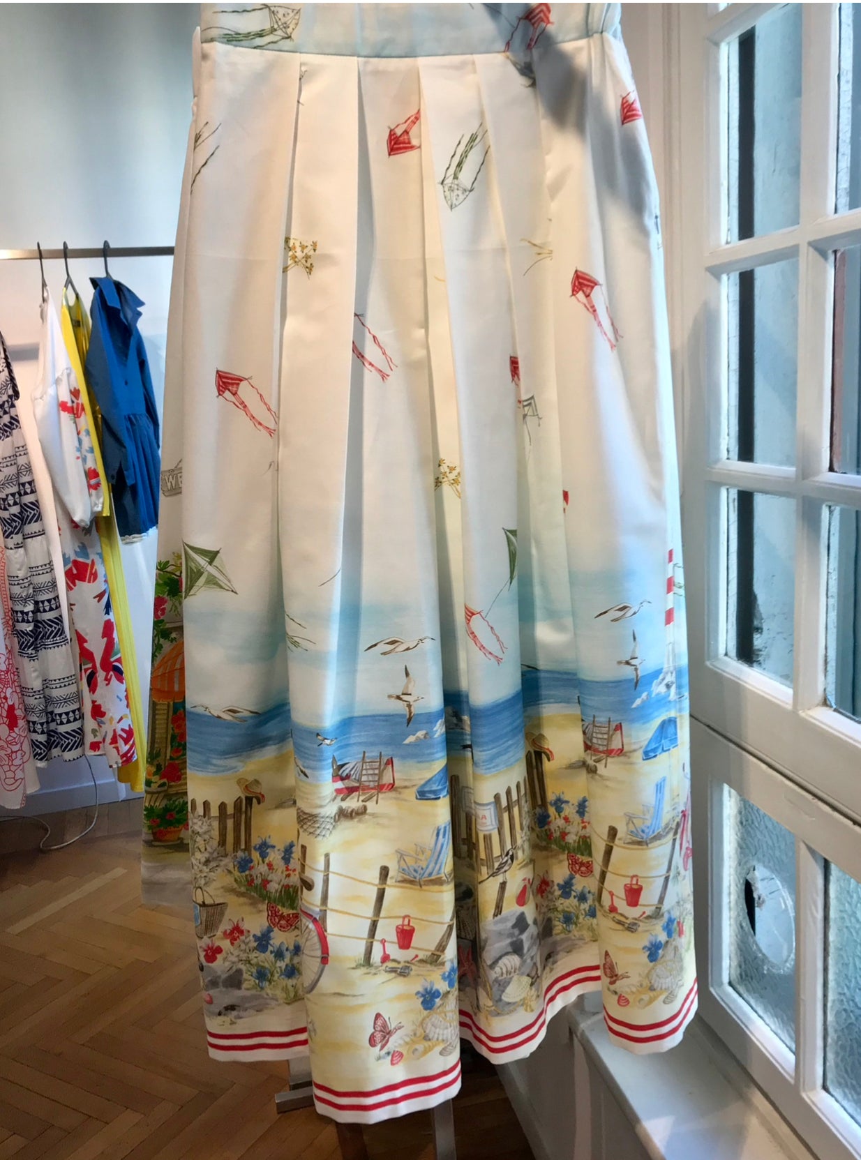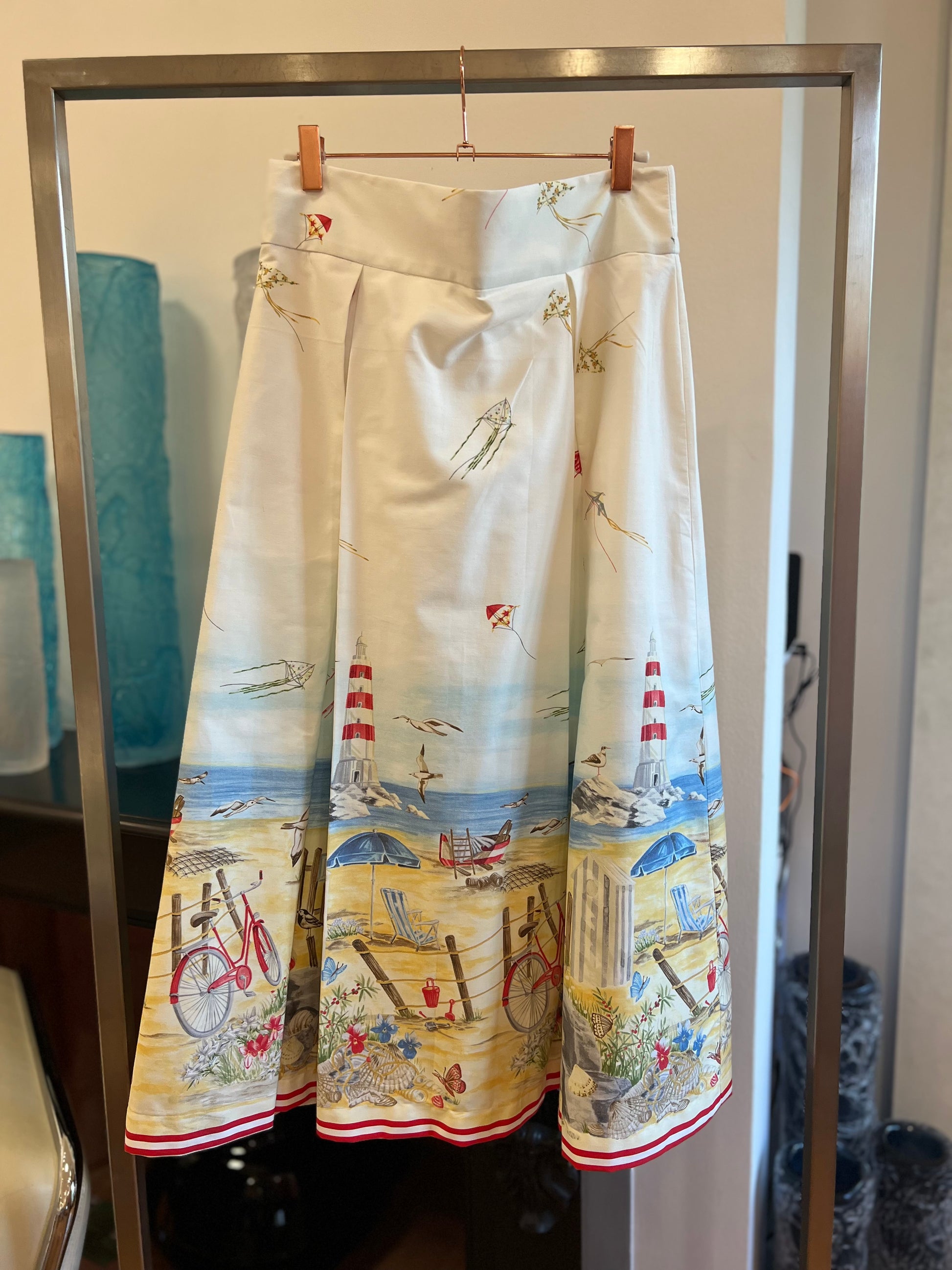 Lunga con pieghe sul davanti, in tessuto di cotone pesante colore fondo bianco con delicati disegni sul fondo che rendono la gonna un capo molto originale