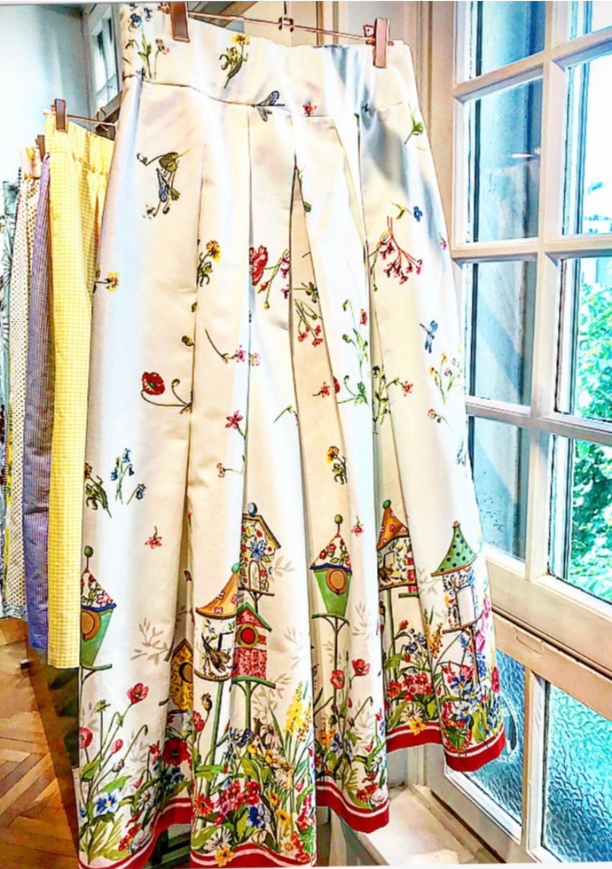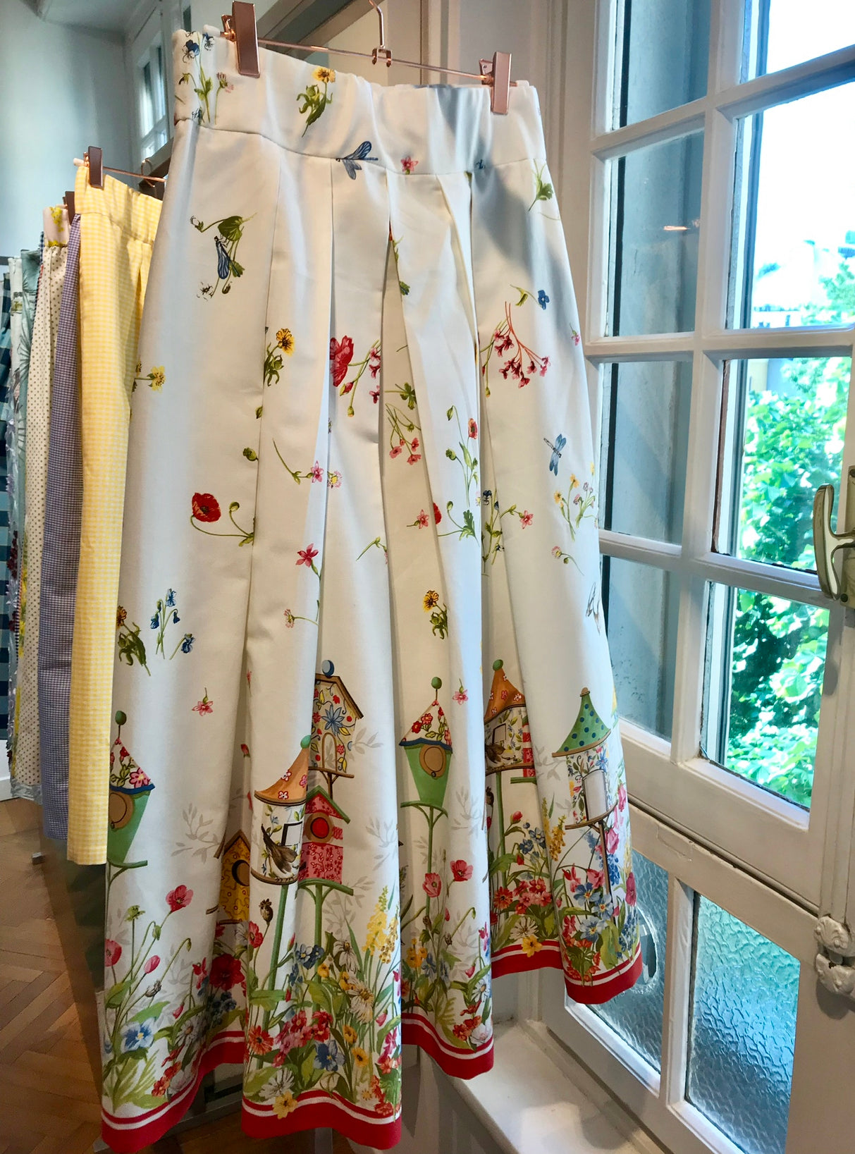 Lunga con pieghe sul davanti, in tessuto di cotone pesante colore fondo bianco con delicati disegni sul fondo che rendono la gonna un capo molto originale