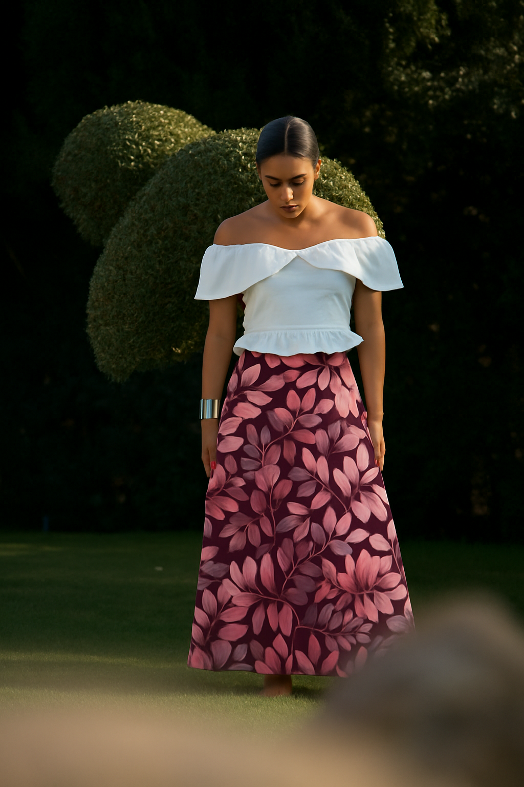 Gonna Modello Valentina a ruota in tessuto Satin con disegno foglie con tasche laterali .