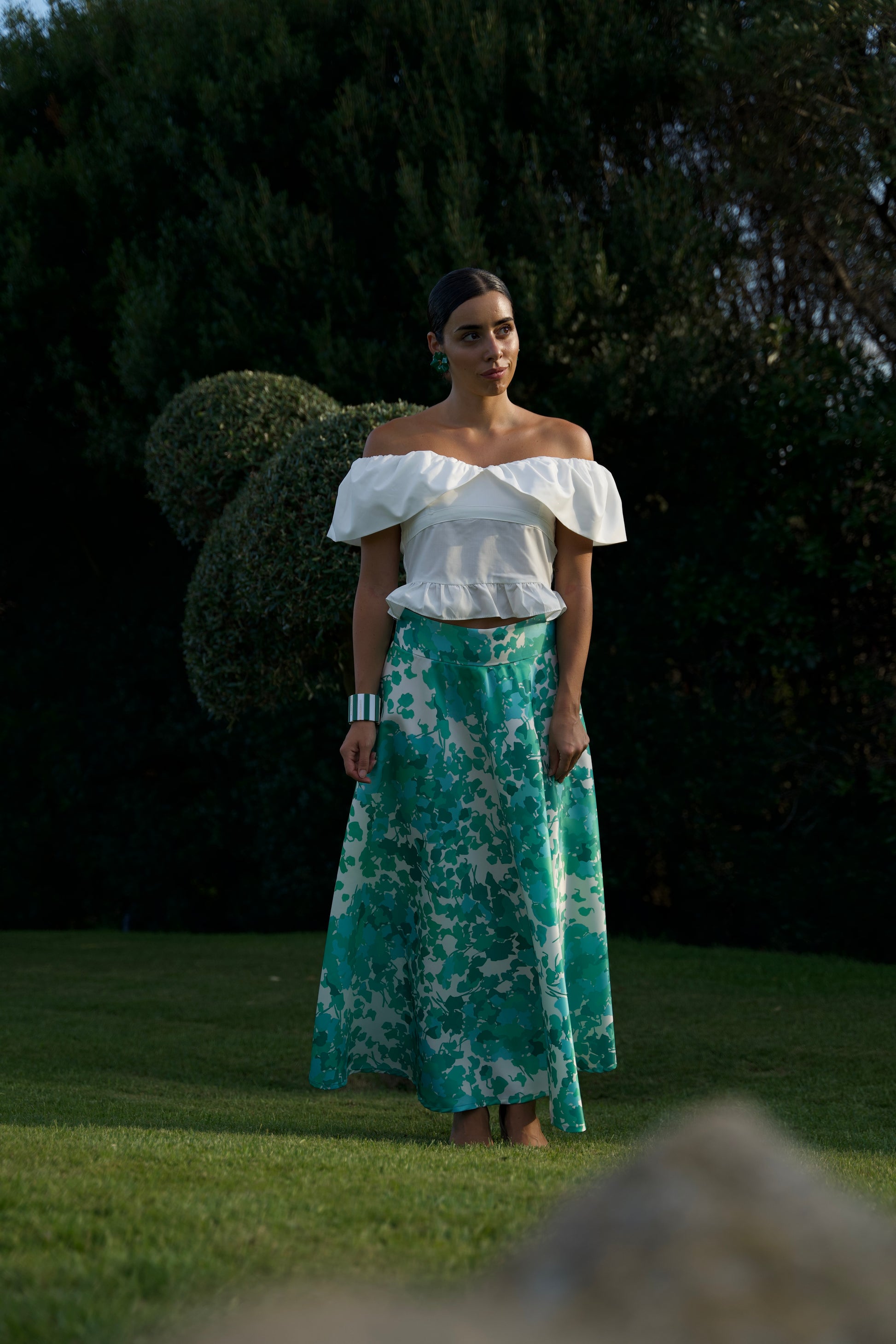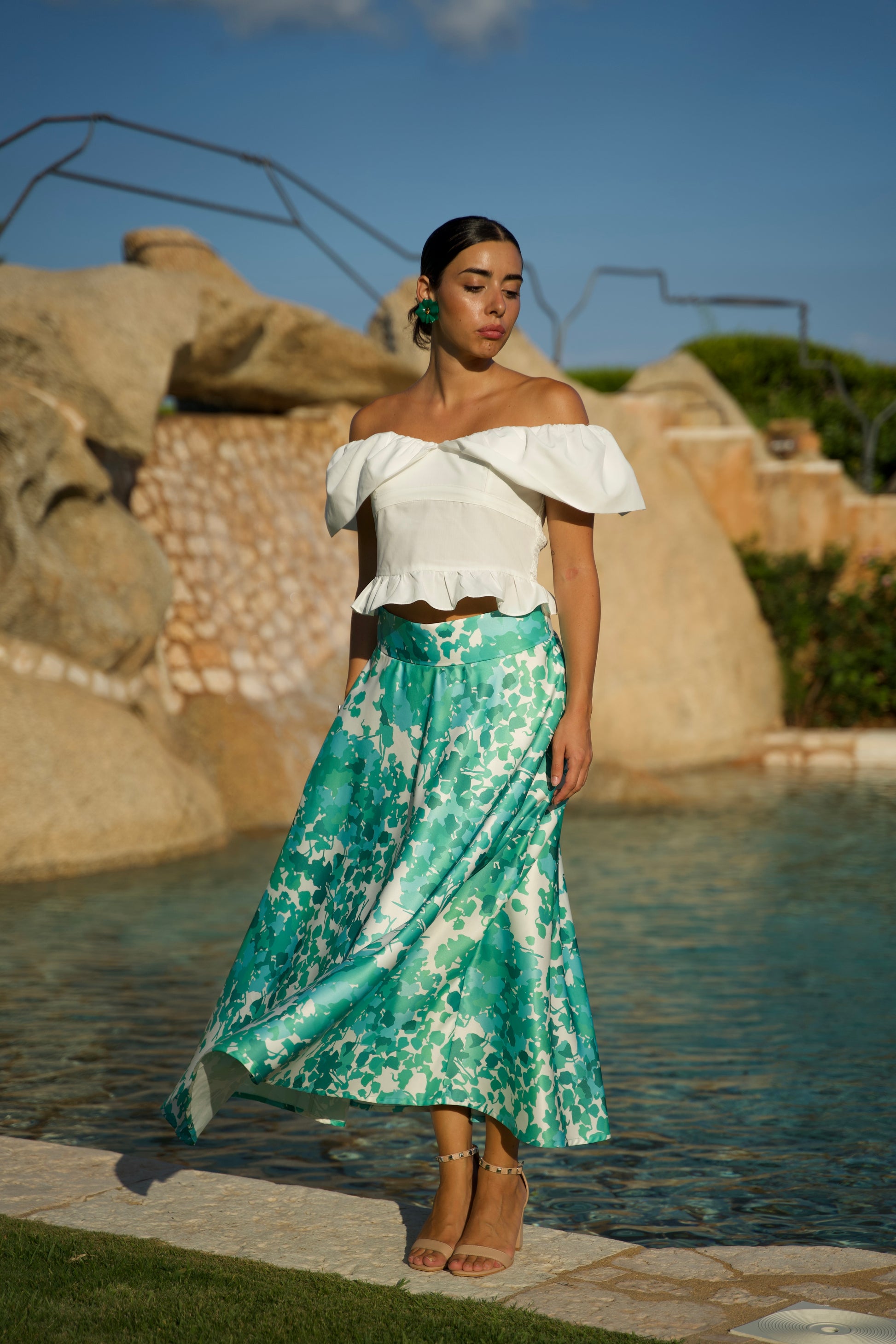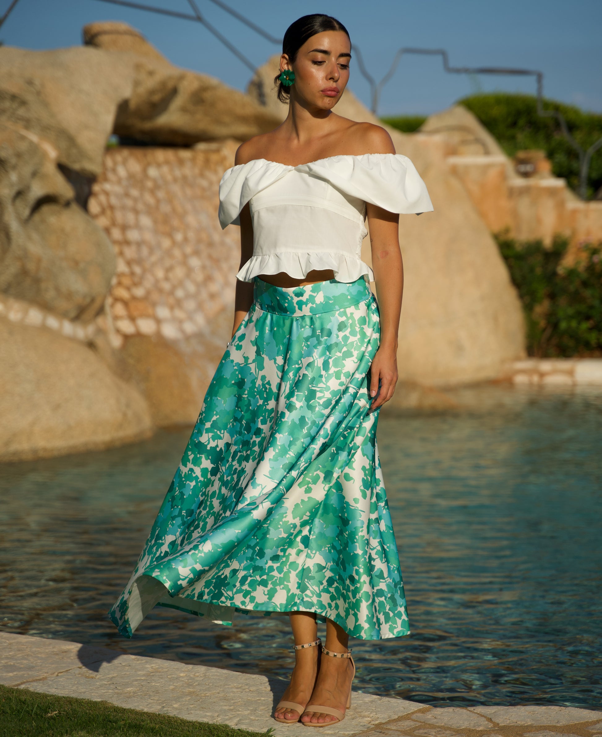 Gonna Modello  Valentina a ruota in tessuto DOUCHESSE bianco con disegno foglie