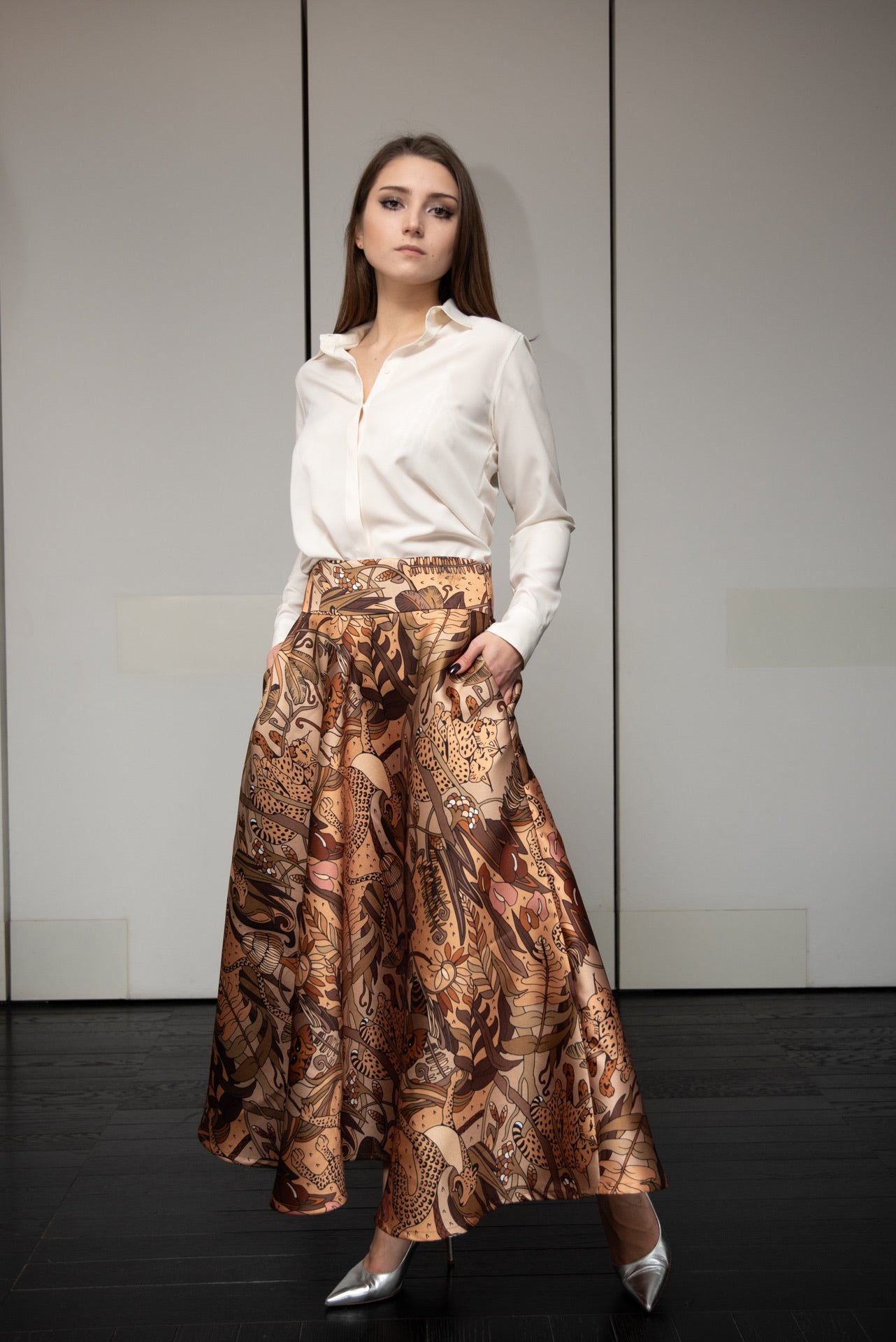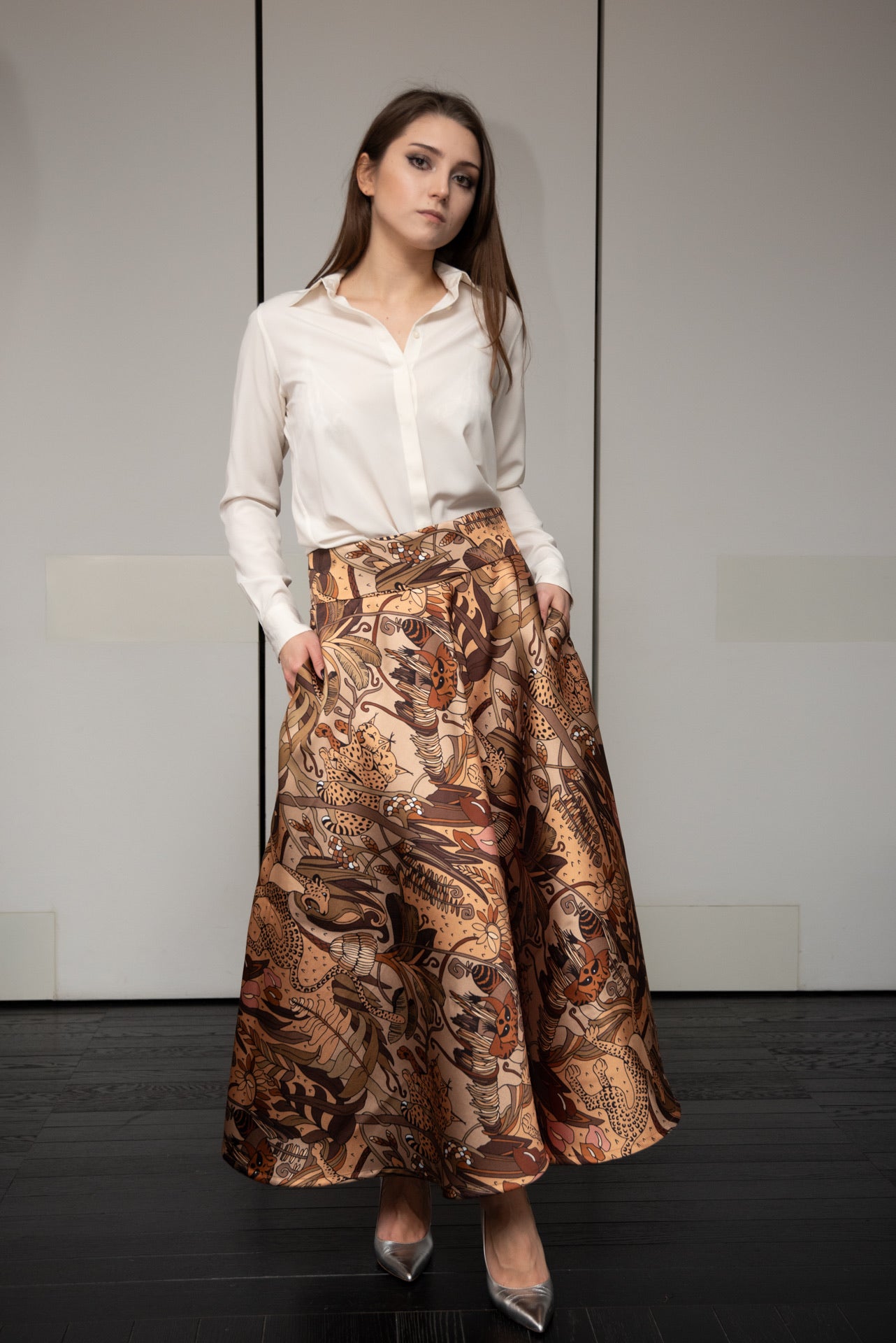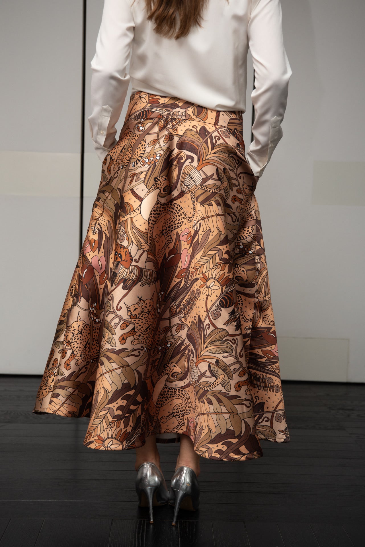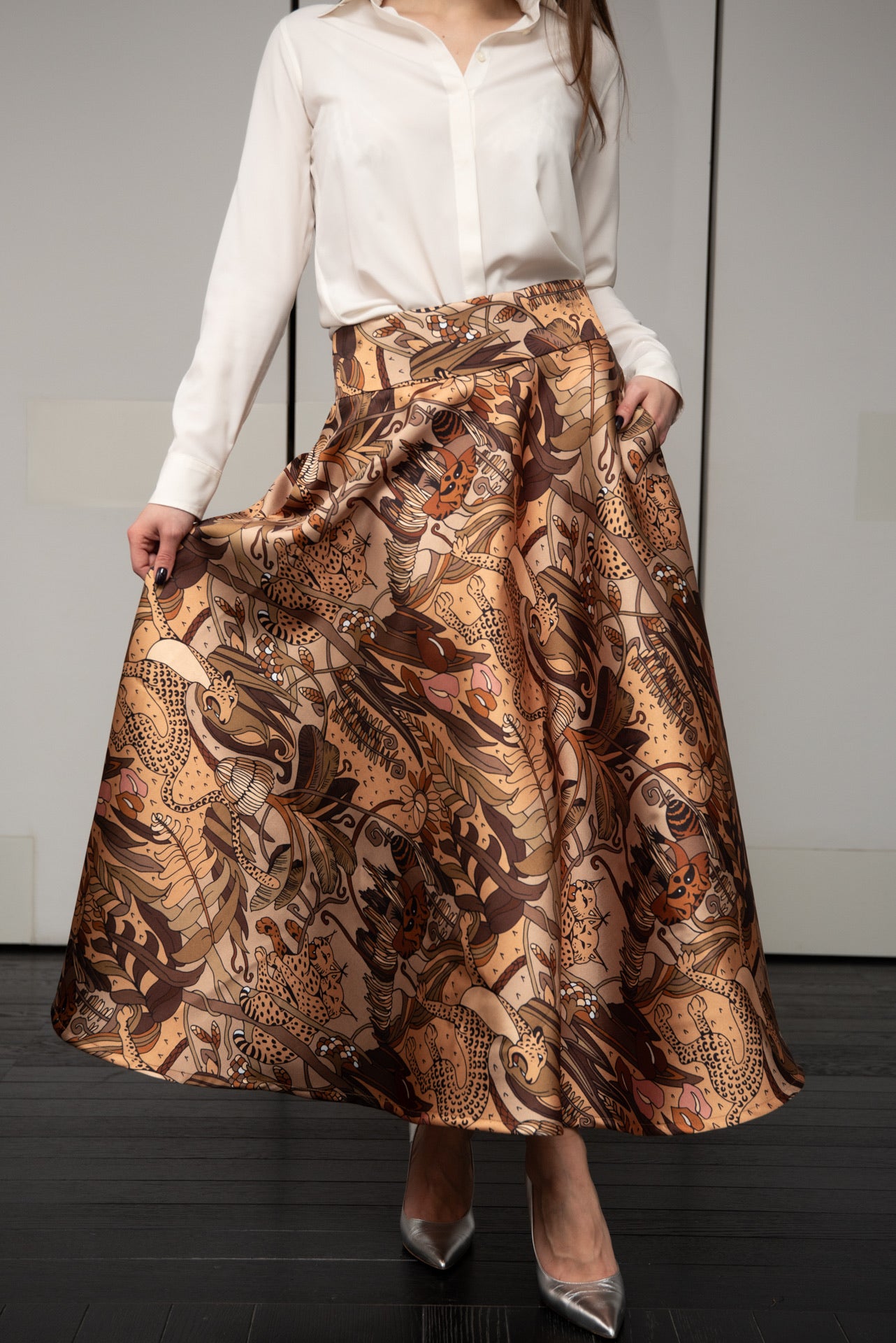 Gonna Modello VALENTINA in morbida viscosa a mezza ruota con disegno SAVANA con tasche laterali e vita alta