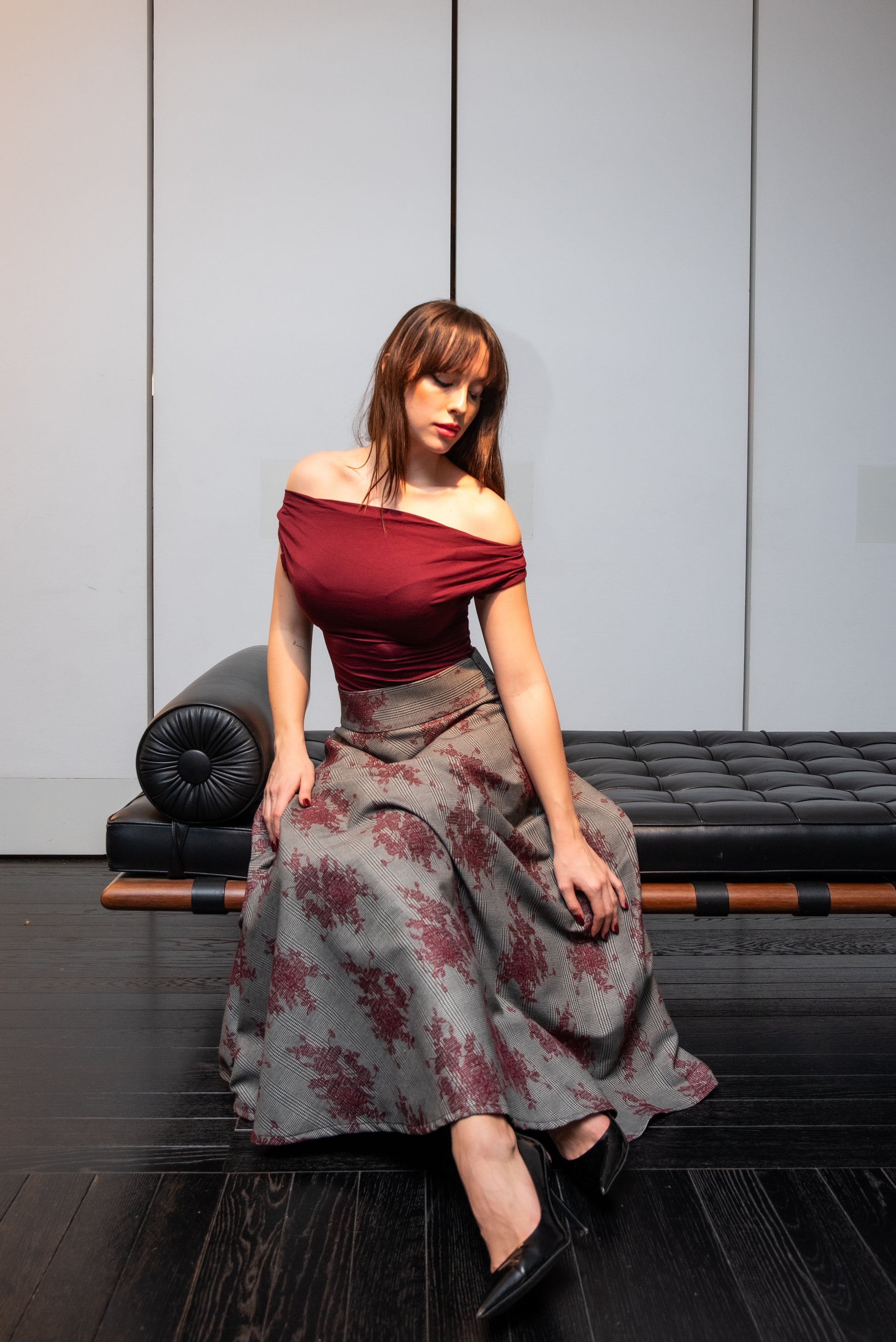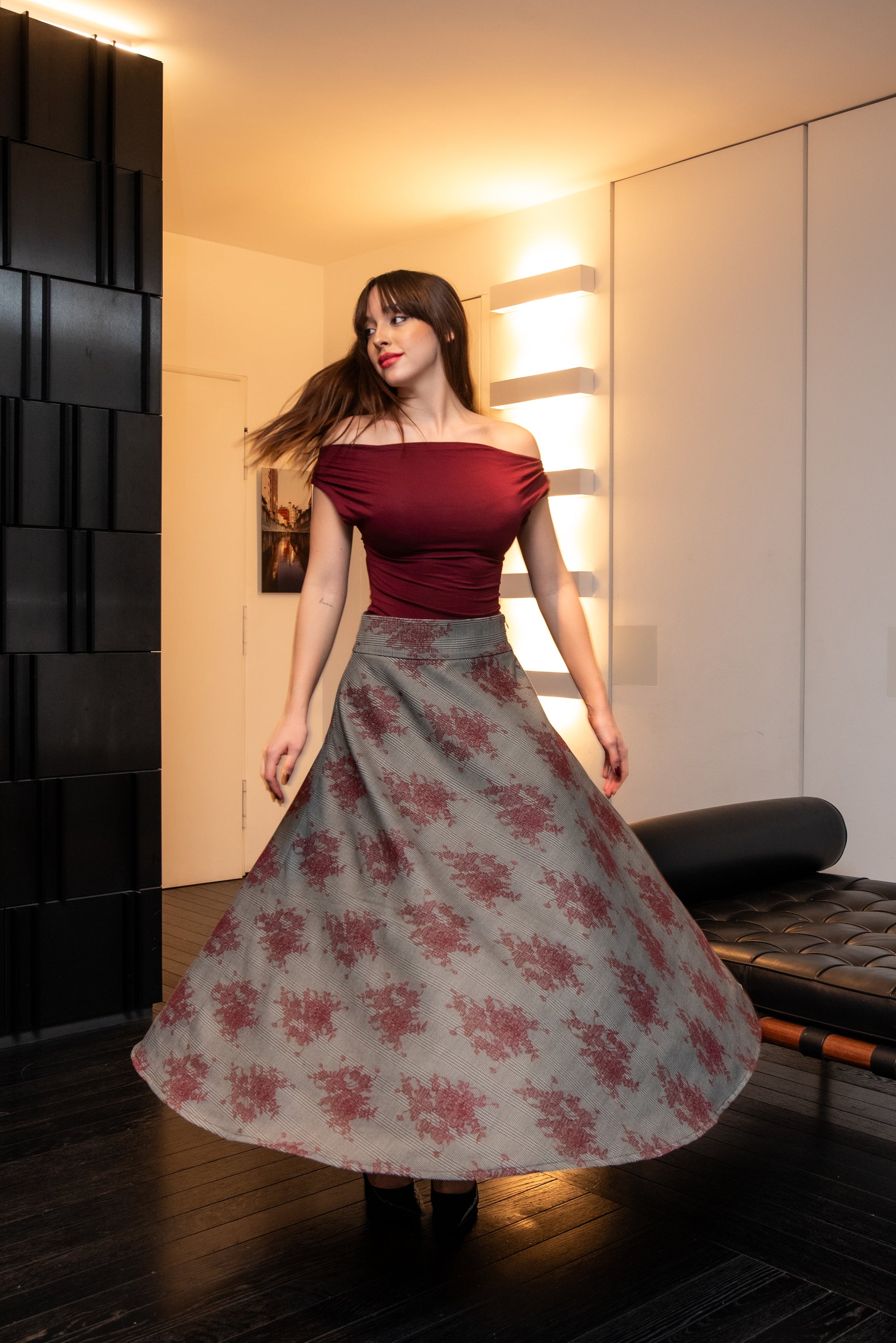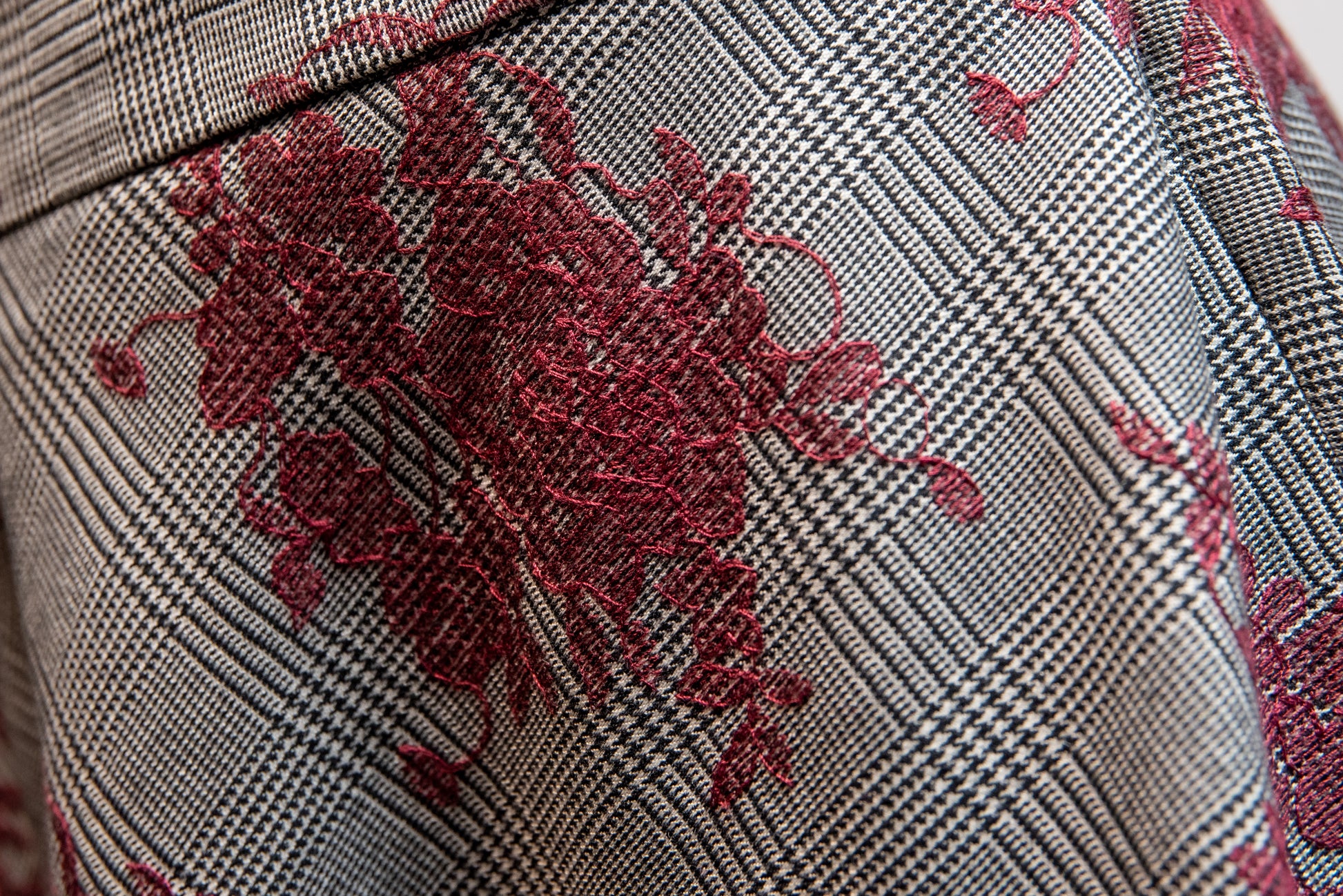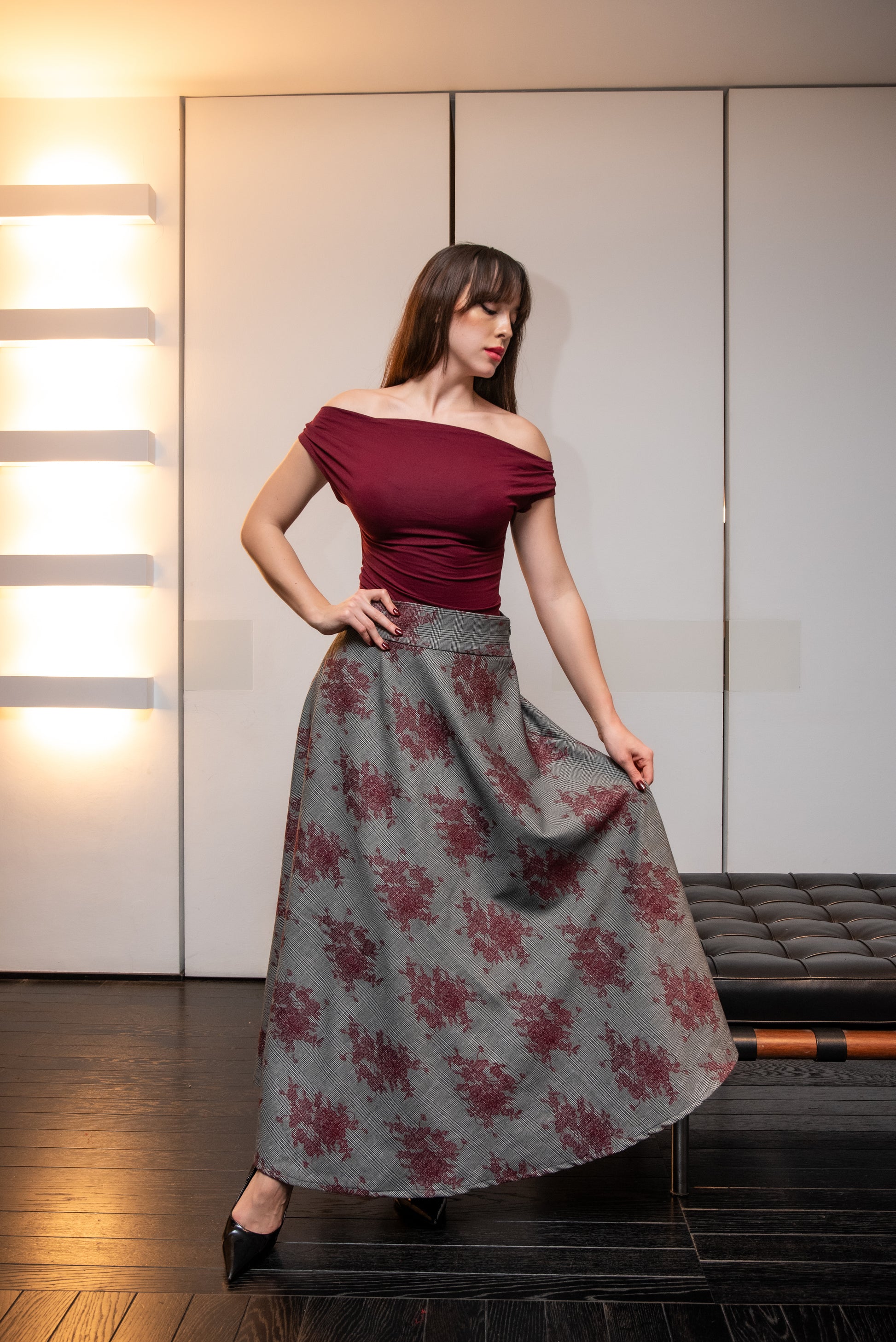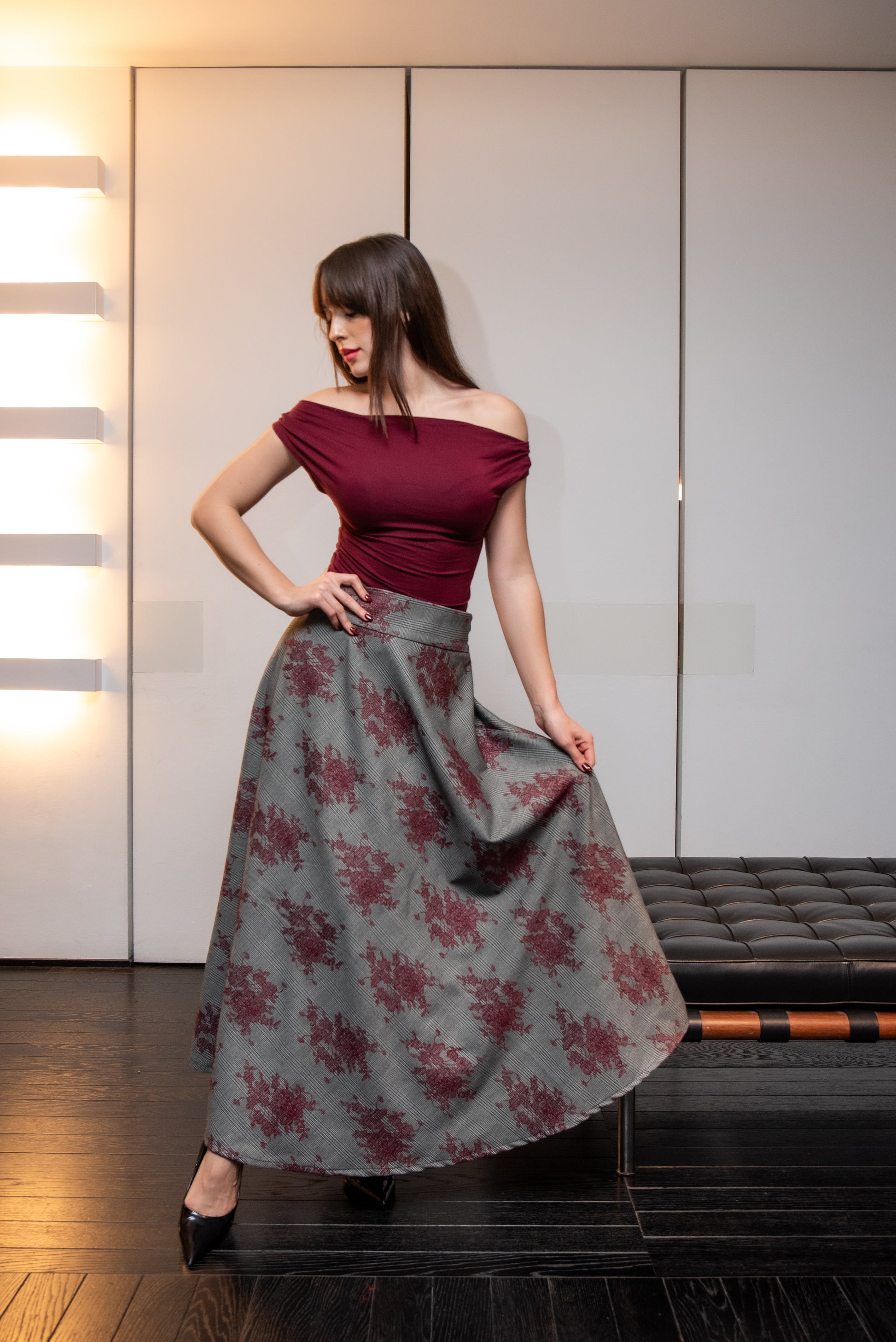 Gonna Modello Valentina a ruota in tessuto Principe di Galles con fiori ricamati color Bordeaux con tasche laterali e a vita alta .