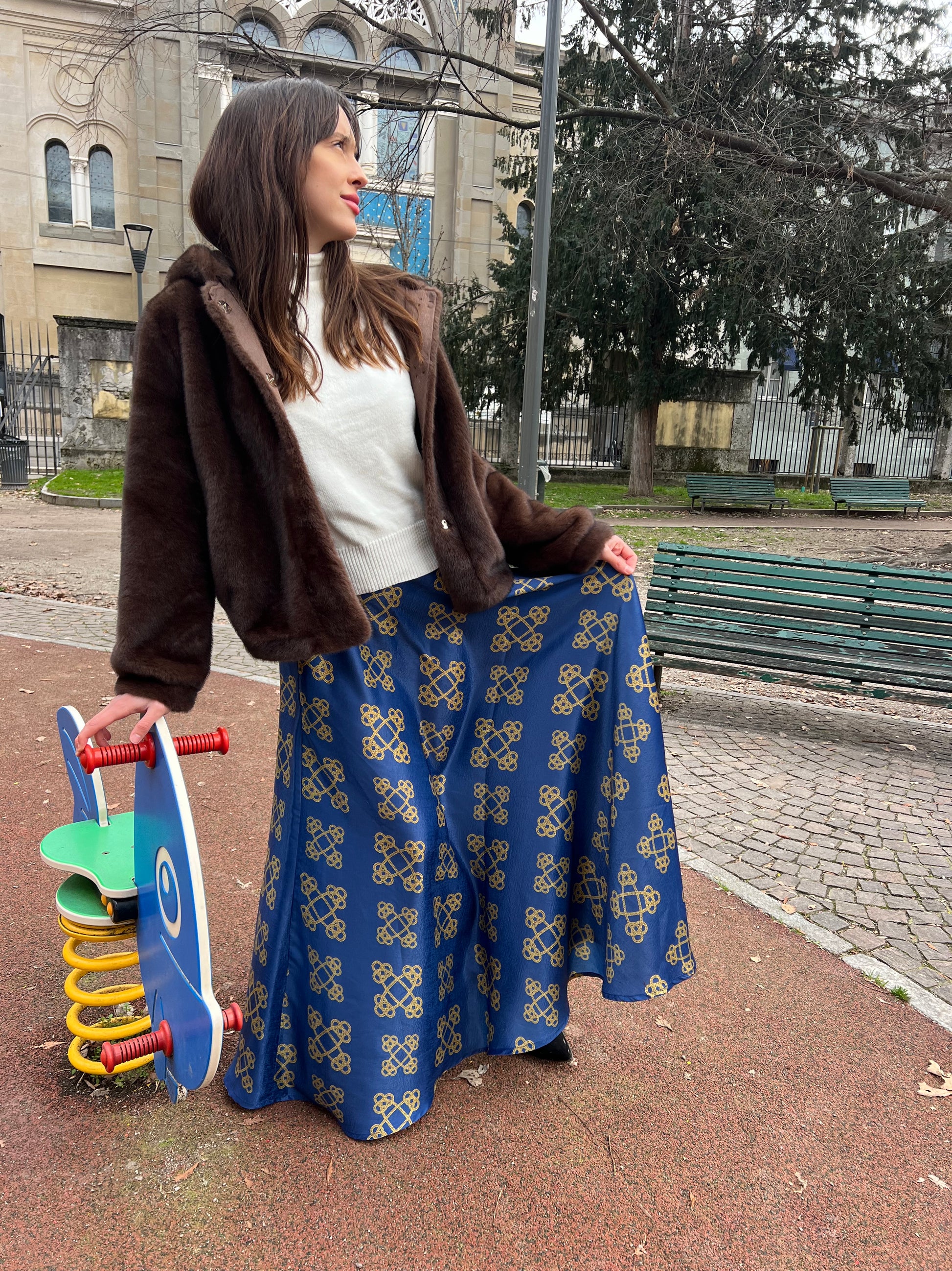 Gonna lunga modello Valentina dal tessuto fluido e luminoso con fascia alta in vita a mezza ruota con motivo catene