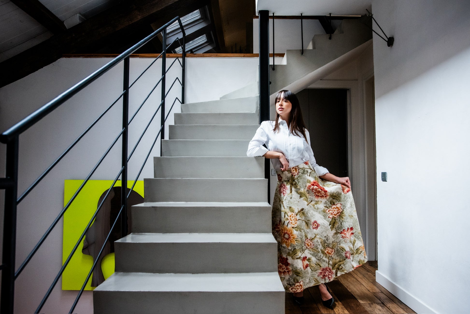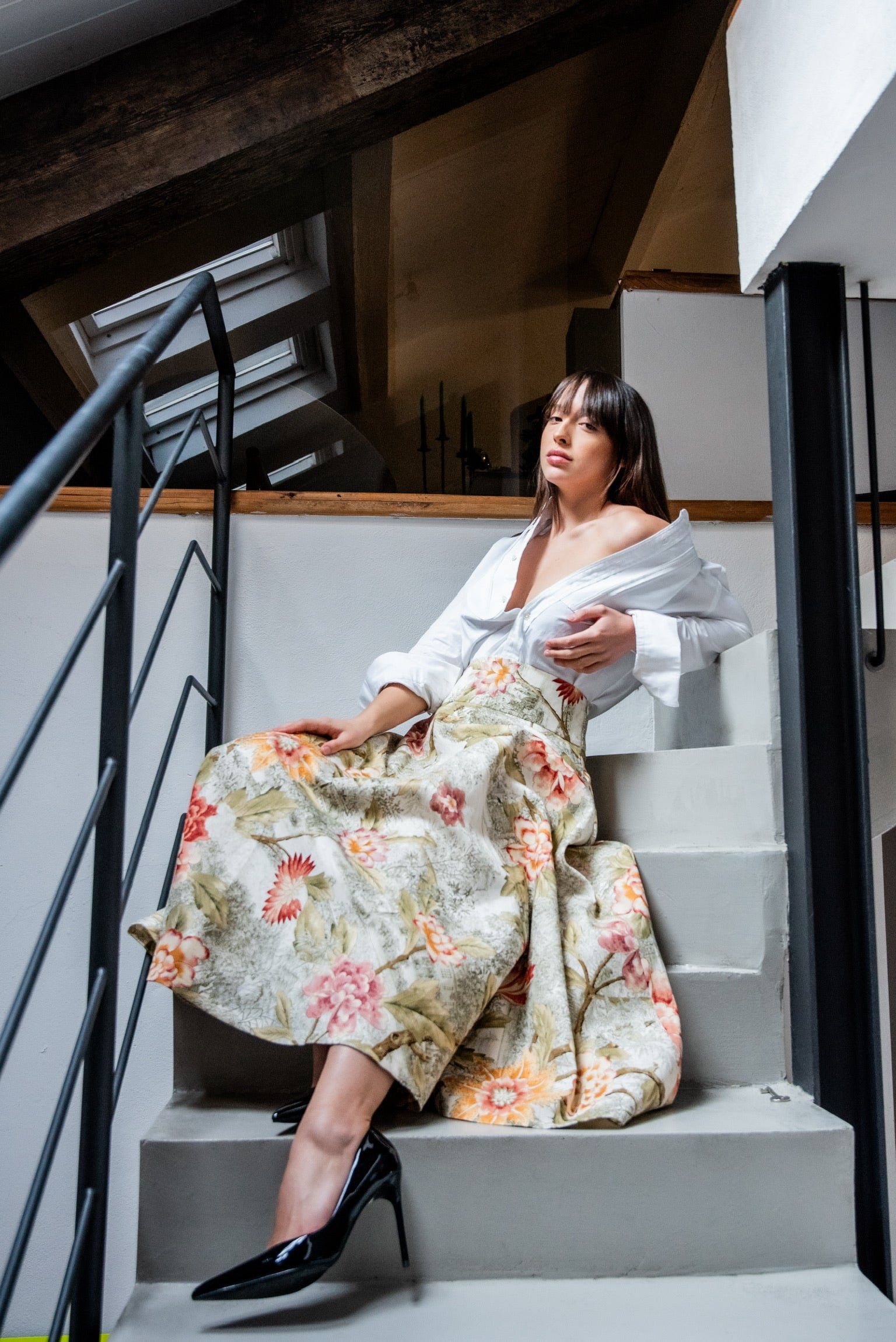 Gonna modello Valentina in tessuto di lino a fiori panna a mezza ruota con tasche laterali