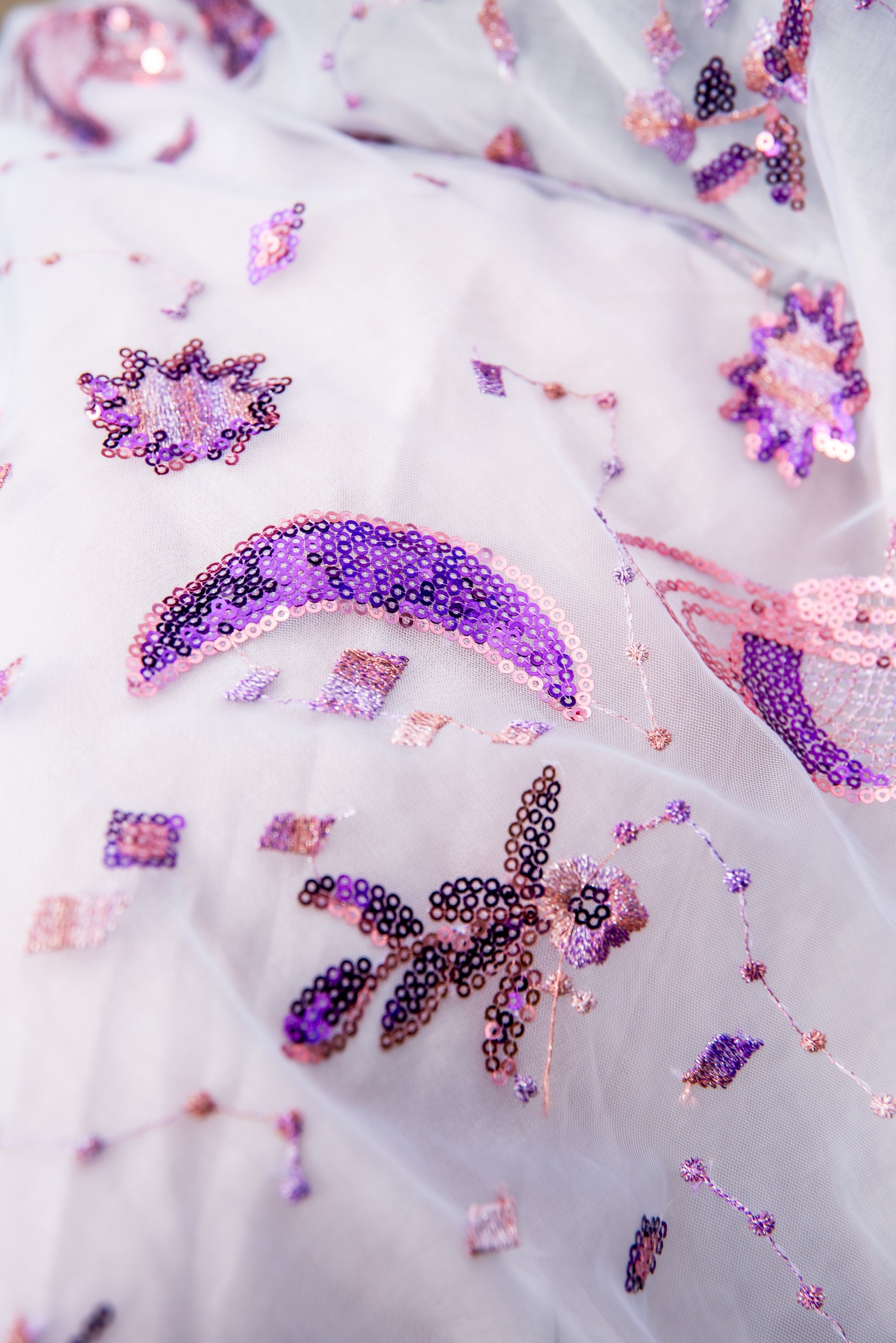 Gonna Valentina LUXURY EDITION a ruota con tasche spacco in tessuto di tulle ricamato con paillettes sui toni del viola e lilla con fodera in mussola di cotone