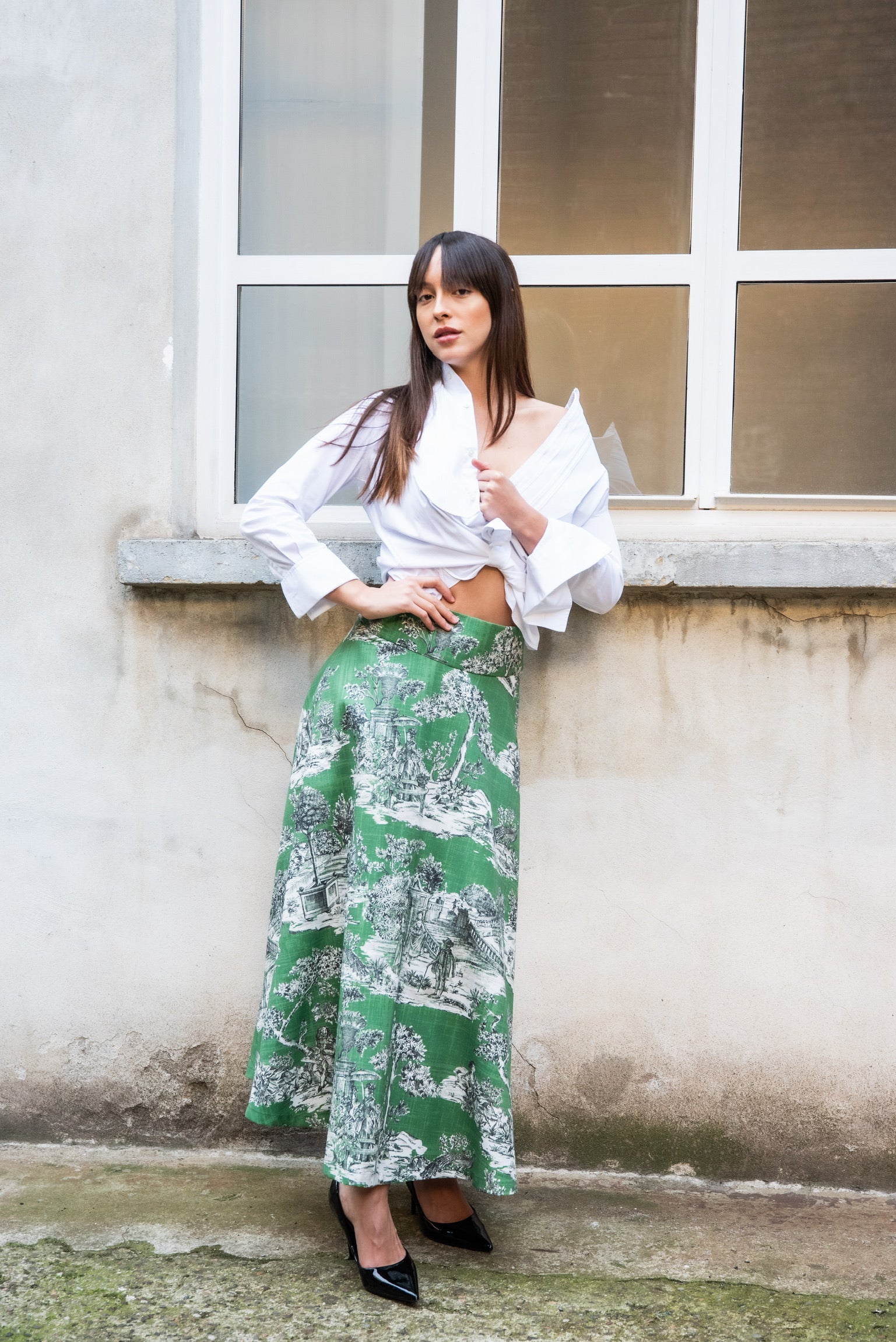 Gonna Modello Valentina in tessuto Douchesse motivo Toille de Jouy con fondo verde,