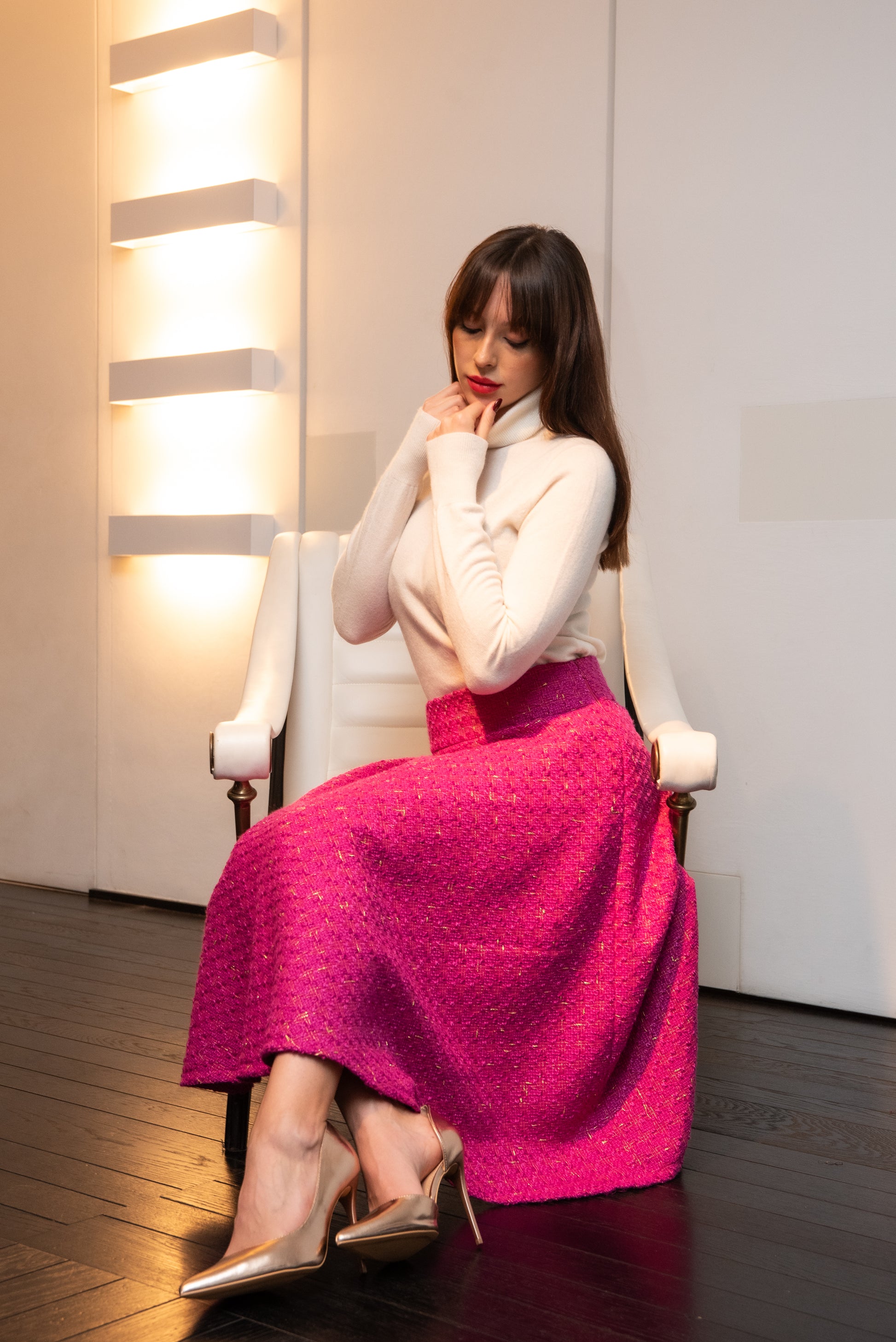 Gonna modello Valentina a ruota con tasche laterali in tweed fuxia con fili oro