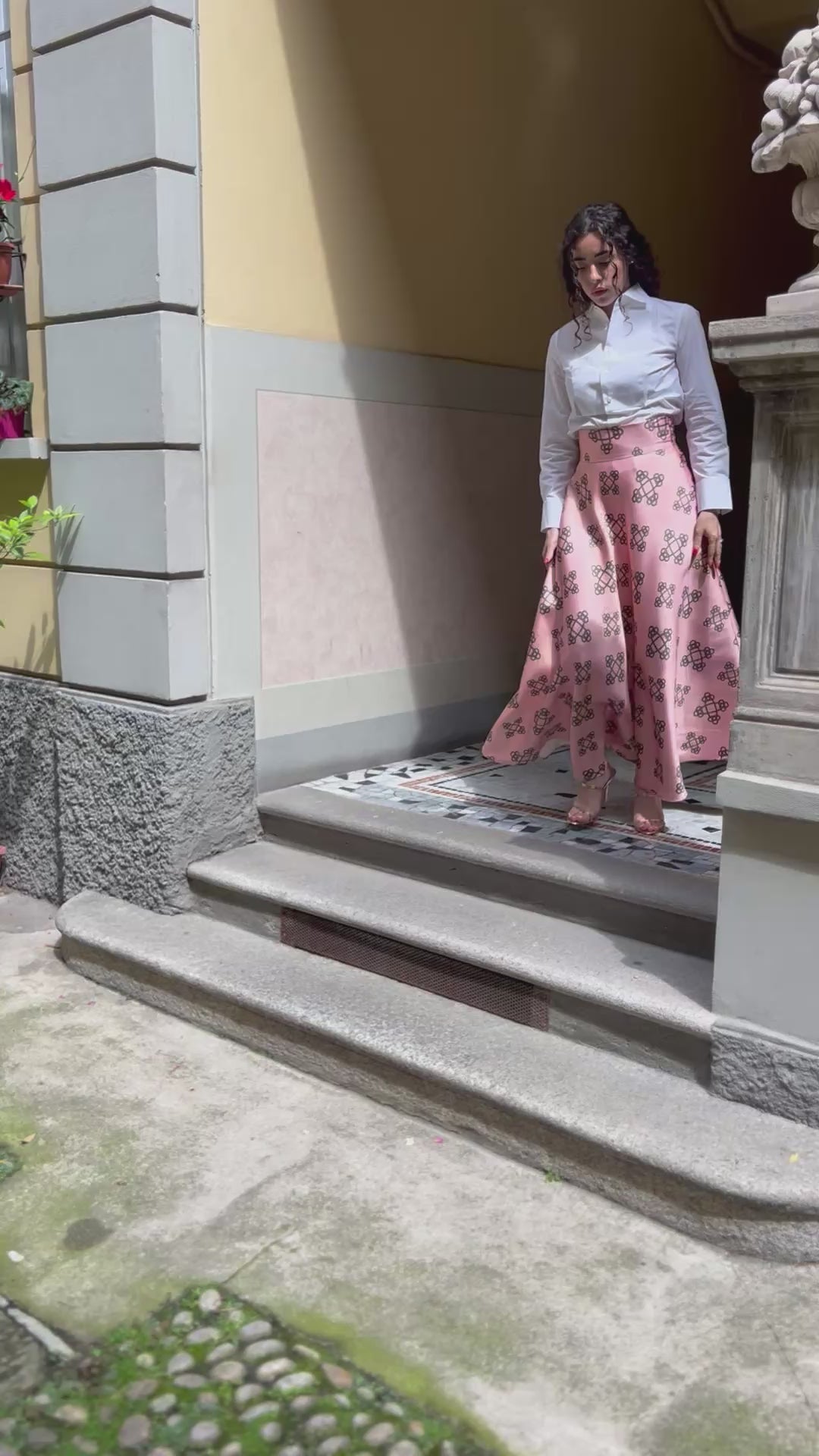 Gonna Modello Valentina a ruota in tessuto Douchesse con disegno CATENE con tasche laterali .