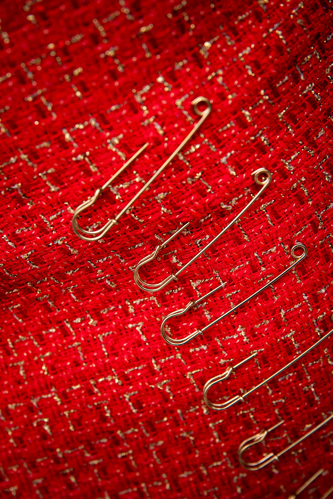 Gonna mini modello Monica in tweed con fili color oro e grosse spille dorate.