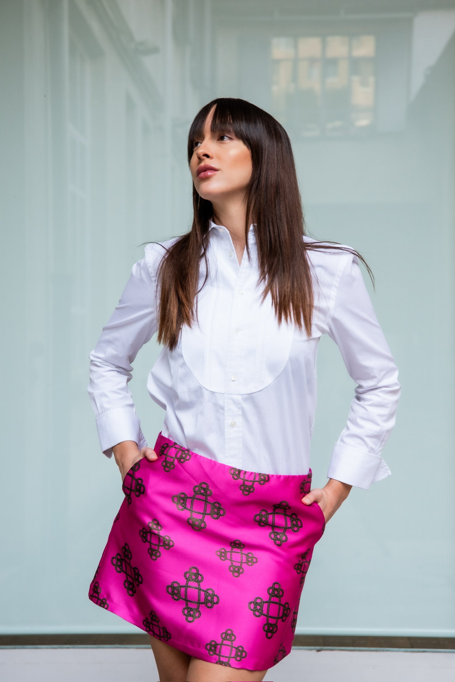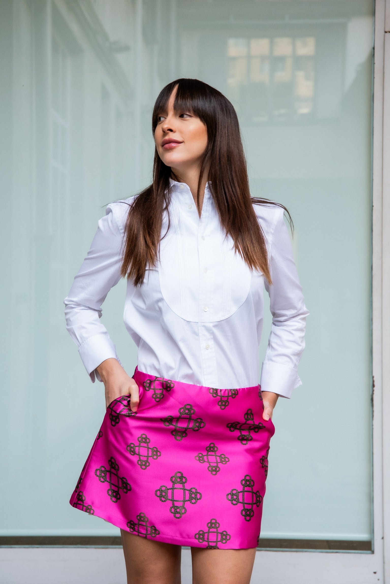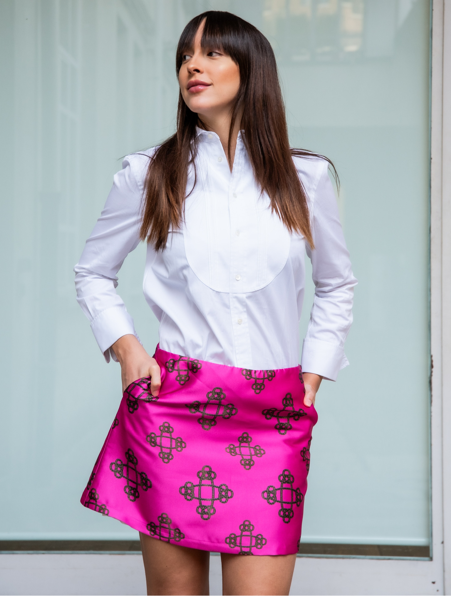 Minigonna Modello Monica in tessuto mikado con disegno catene con tasche laterali e forma a trapezio.