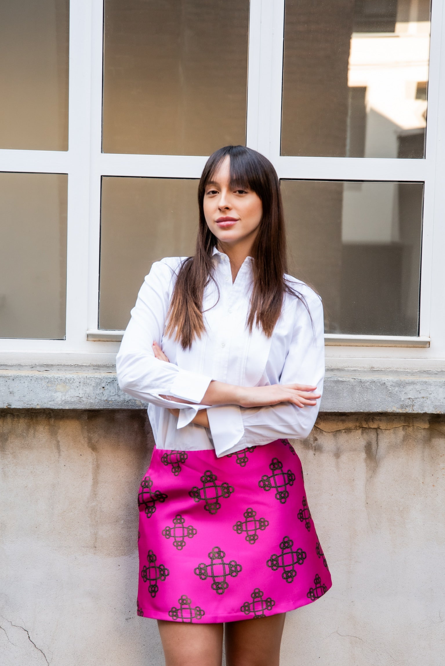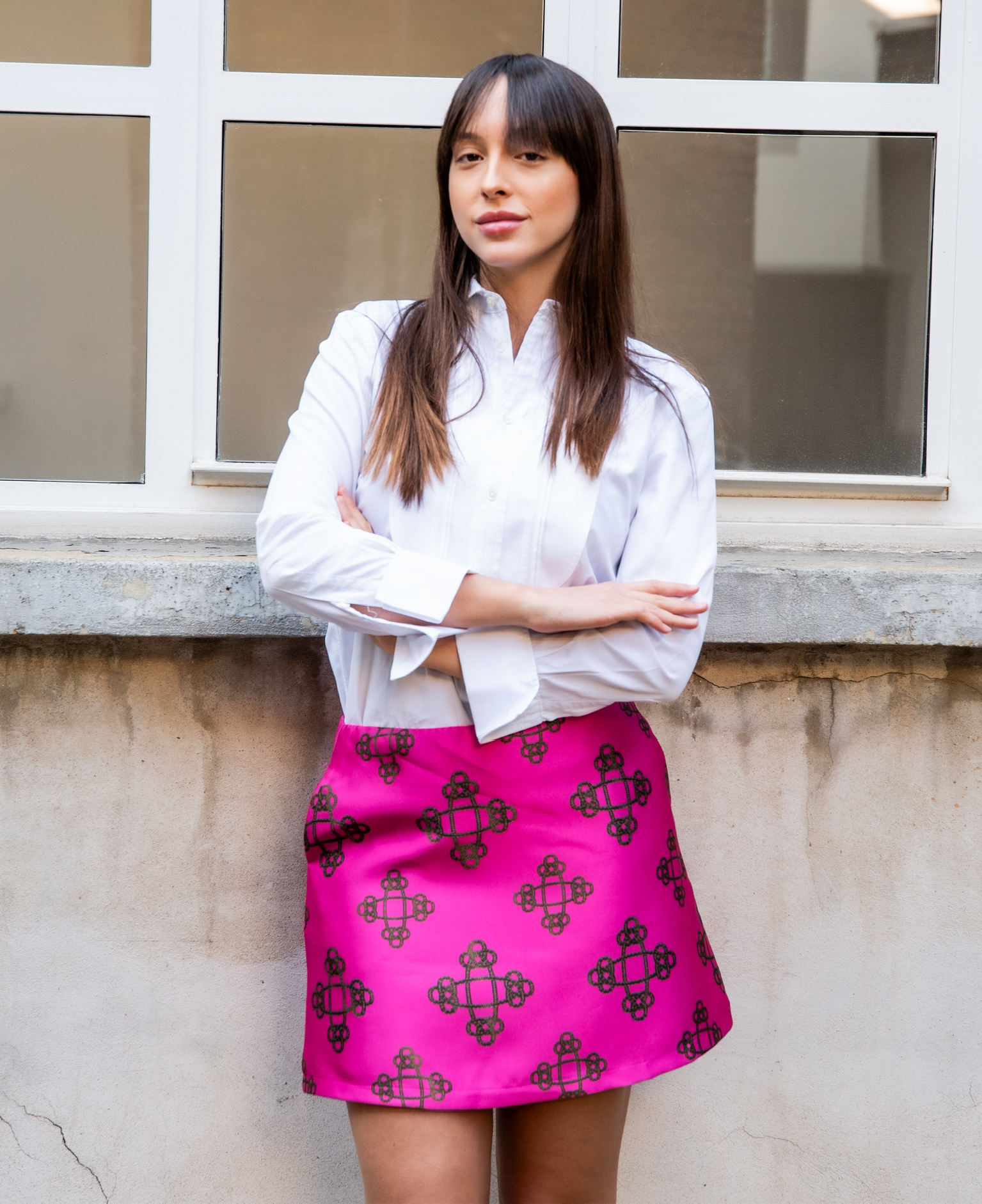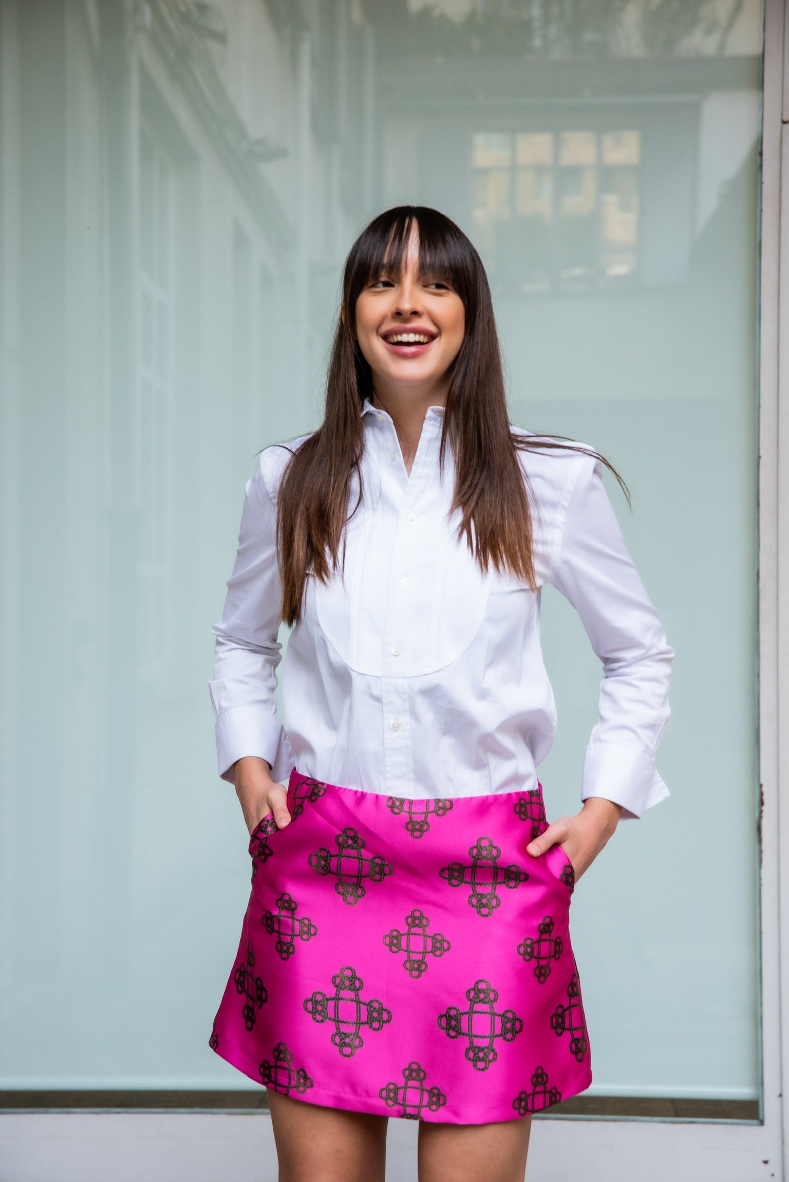 Minigonna Modello Monica in tessuto mikado con disegno catene con tasche laterali e forma a trapezio.