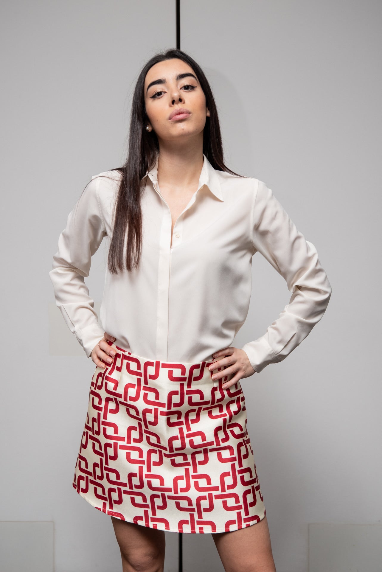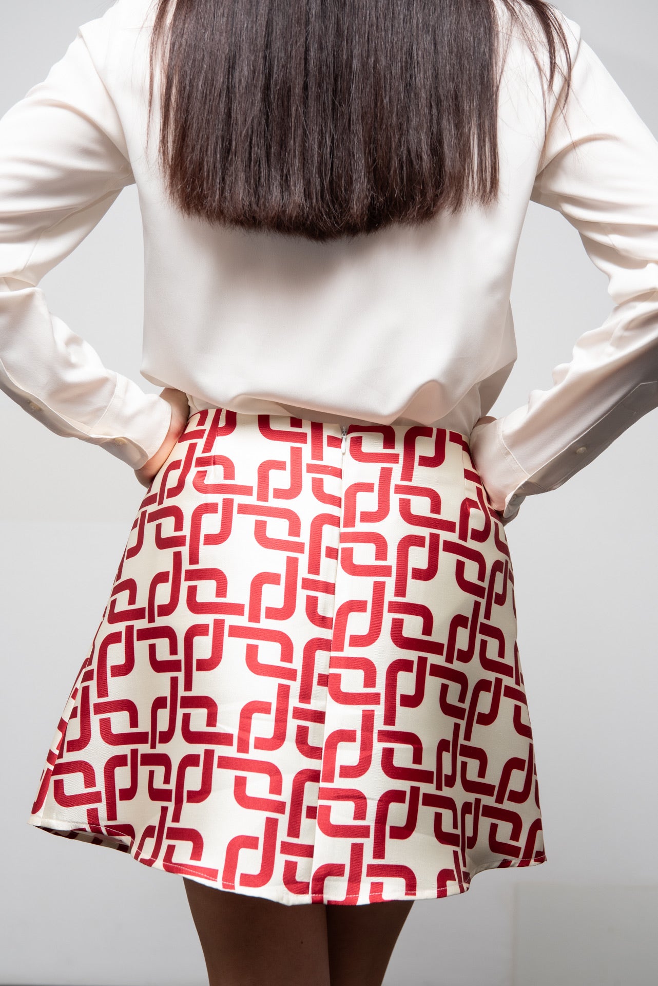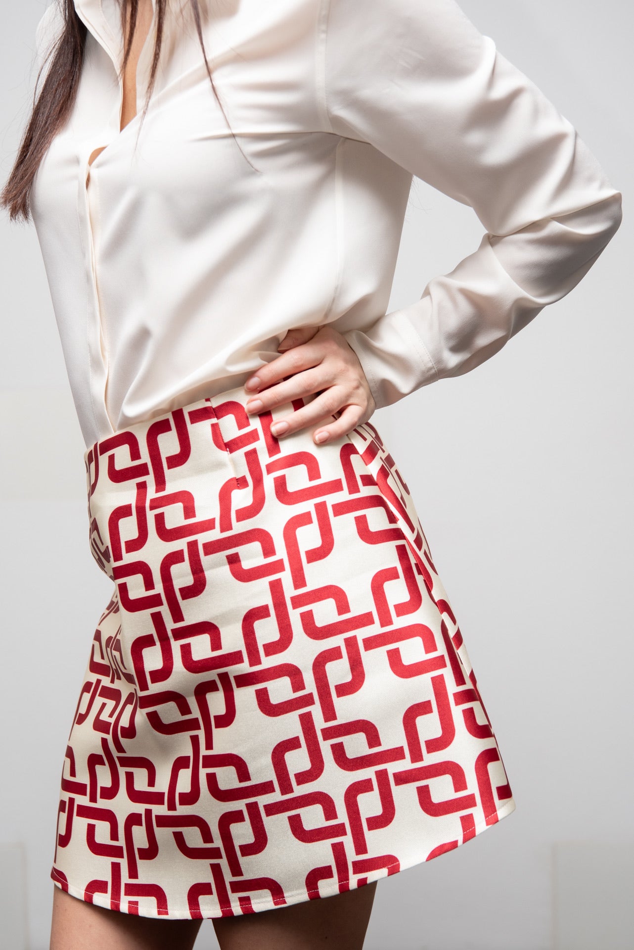 Minigonna Modello Monica in tessuto mikado con disegno geometrico con tasche laterali e forma a trapezio.