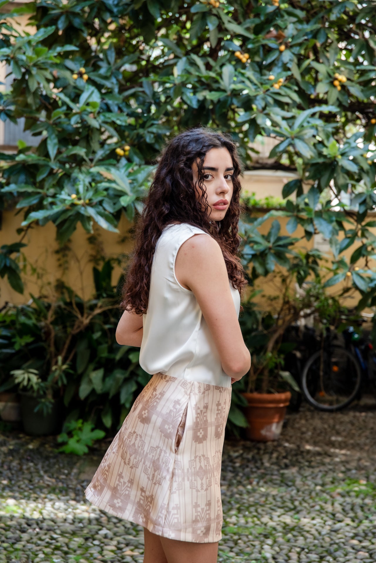La minigonna modello Monica Sami Sabbadini in Mikado è un continuativo della collezione ed è disponibile anche su misura in divere varietà di Mikado