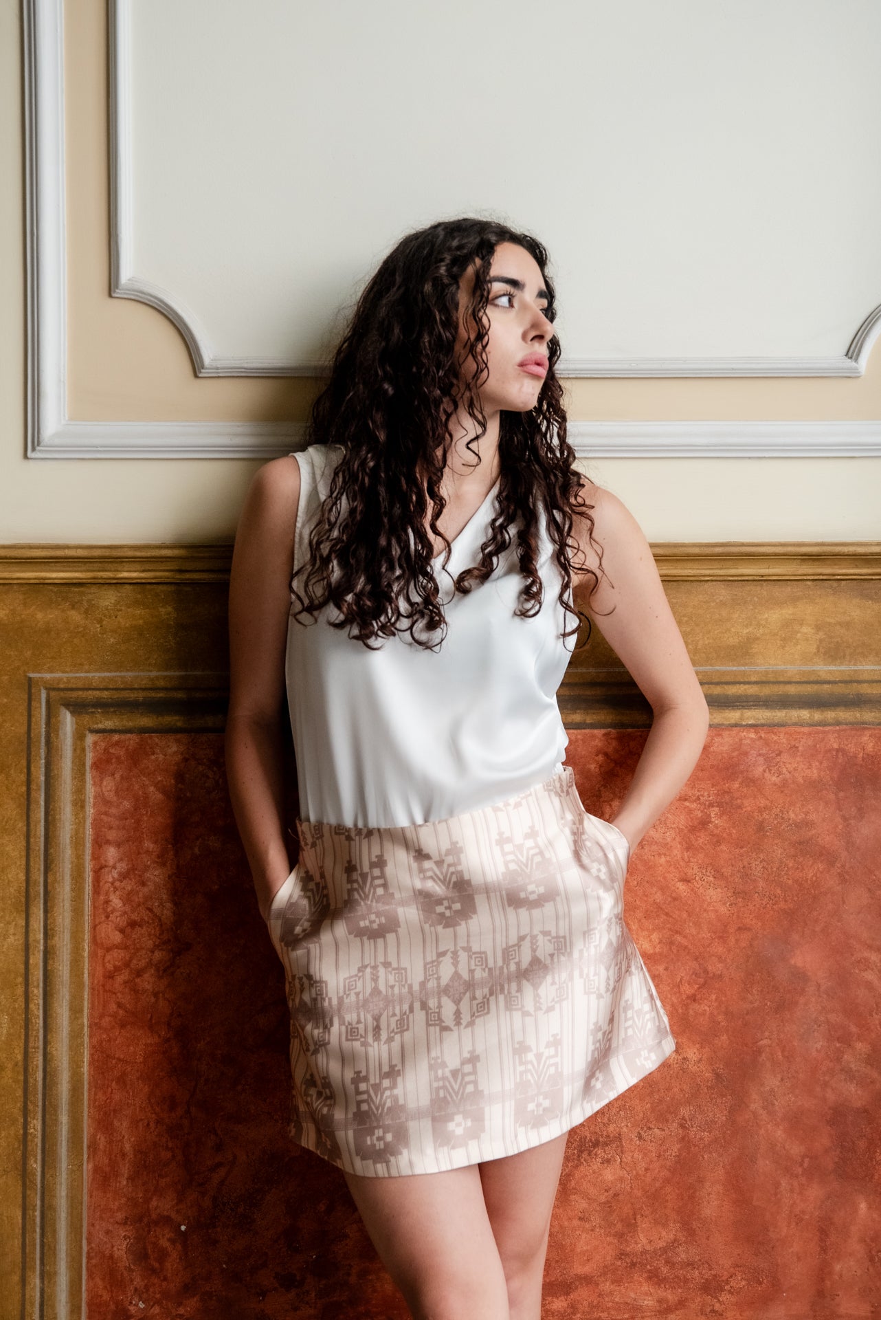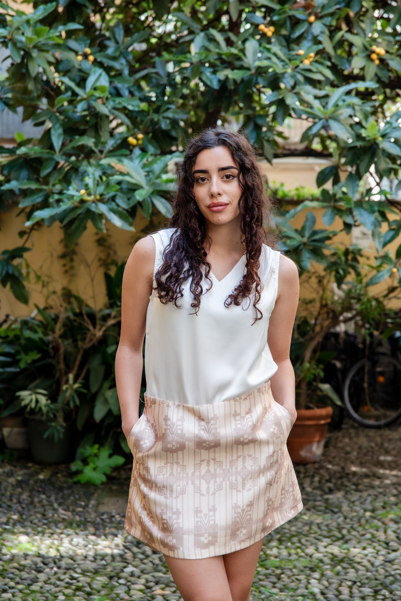Minigonna Modello Monica in tessuto mikado con disegno ITKAT con tasche laterali e forma a trapezio.