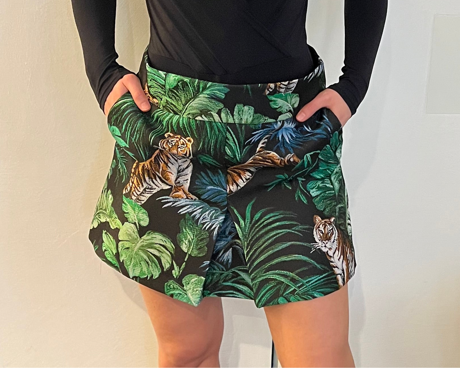 Gonna Sofia in broccato di colore nero con motivo Jungle. La gonna presenta una piega davanti e tasche laterali. La Gonna Sofia è un indumento elegante, contraddistinto da dettagli ricercati e un design sofisticato. Si presta perfettamente per chi partecipa a un party rendendola una scelta ideale per un look raffinato.
